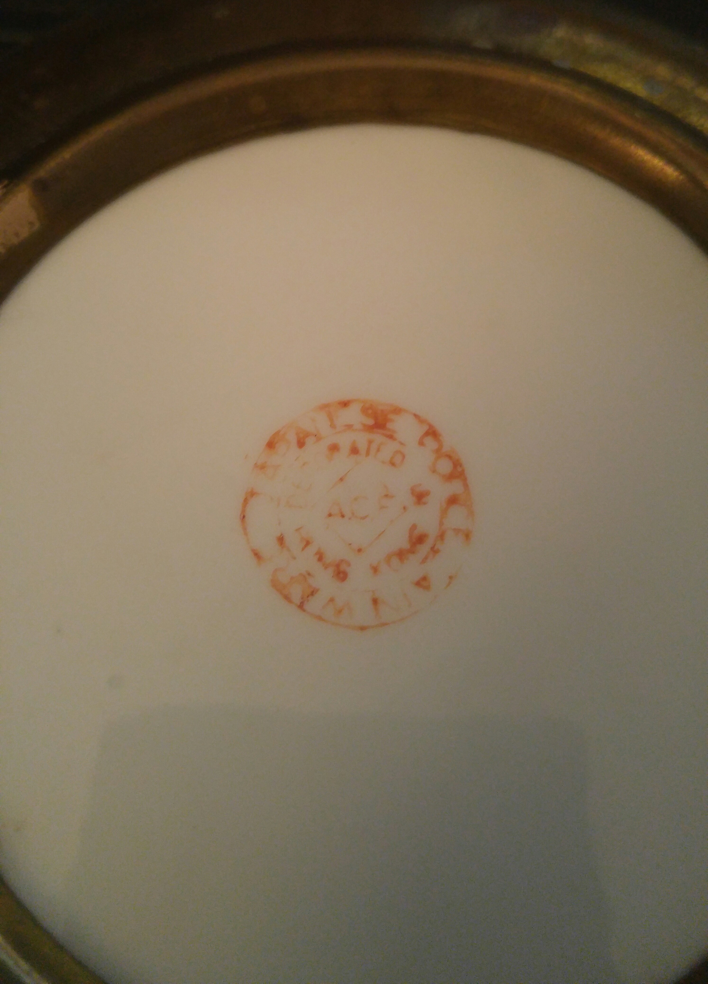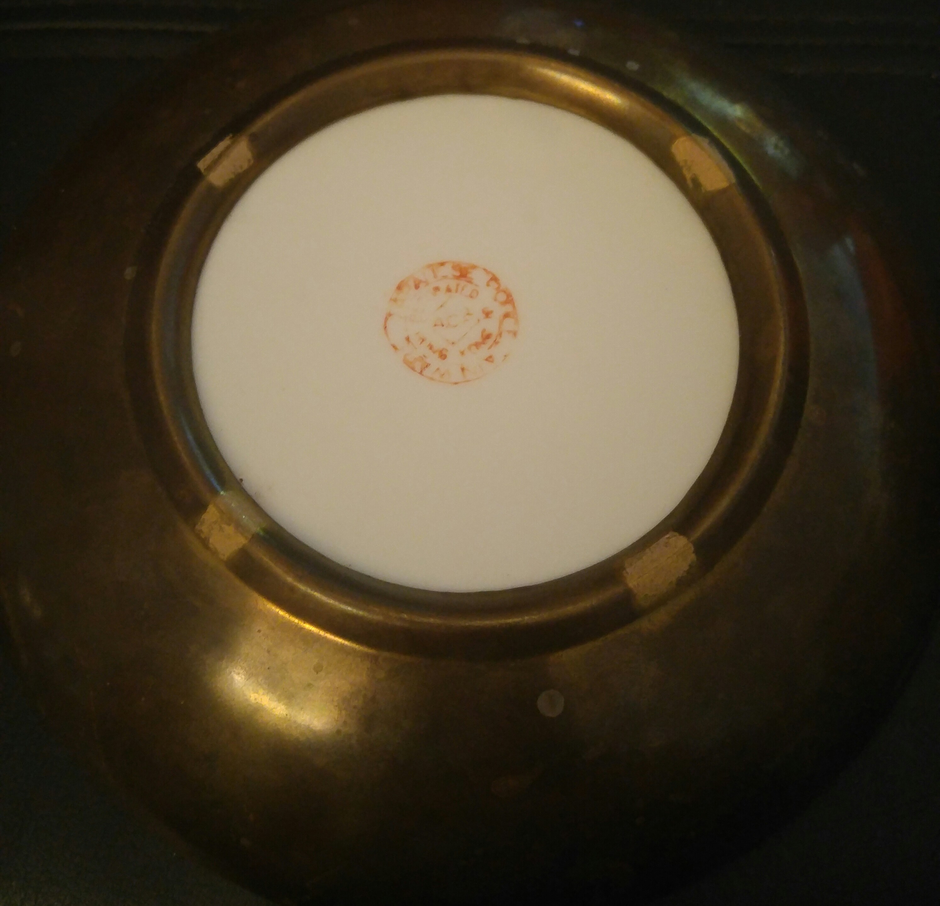 Antique brass and ceramic bowl found in deceased grandmother's attic. Perfect condition. Appears hand painted in beautiful golds and torquise. Stamp on back is hard to read but I can read china, made in hong kong and A.C.F. please help me find out what this beautiful bowl is.