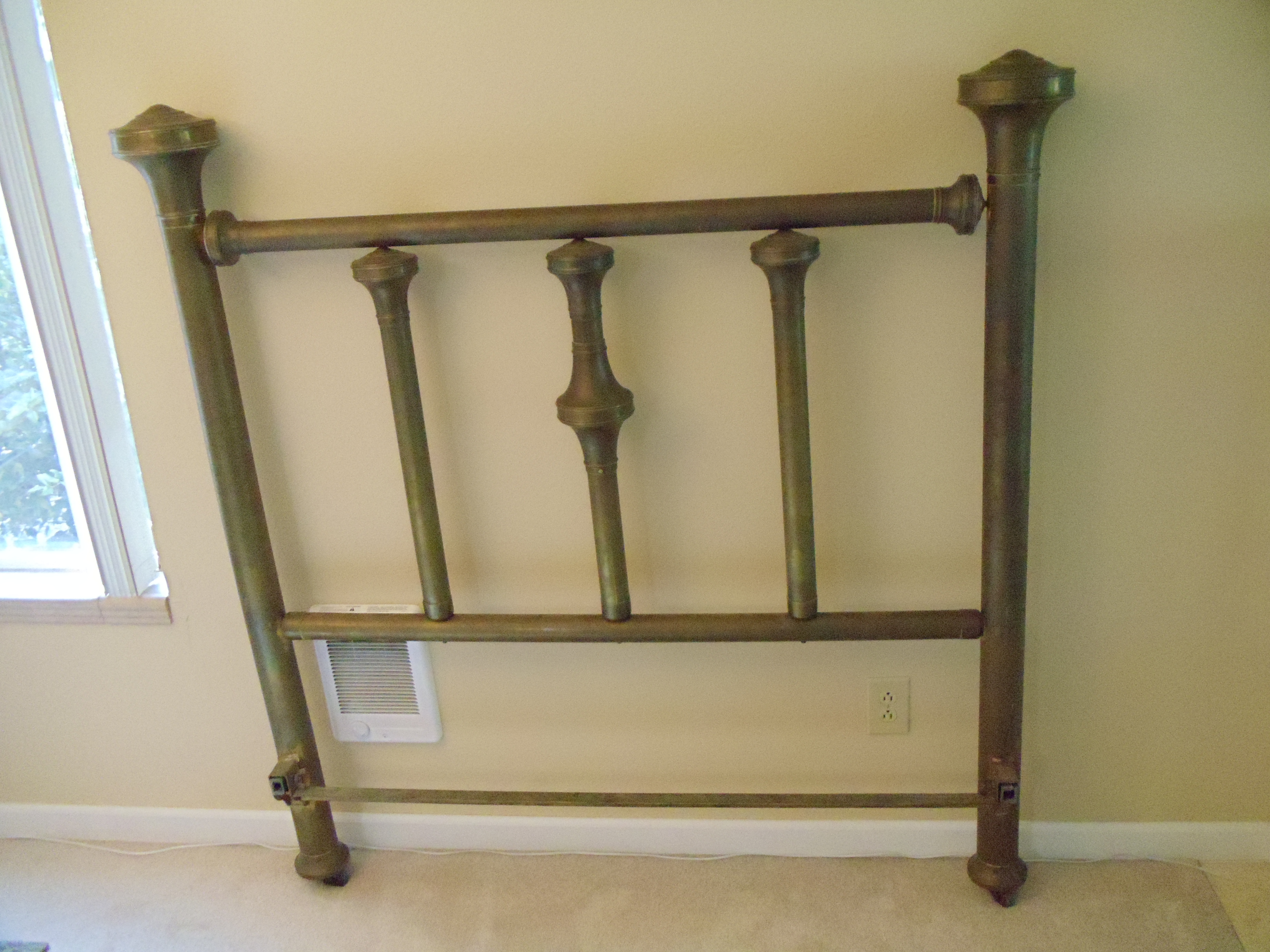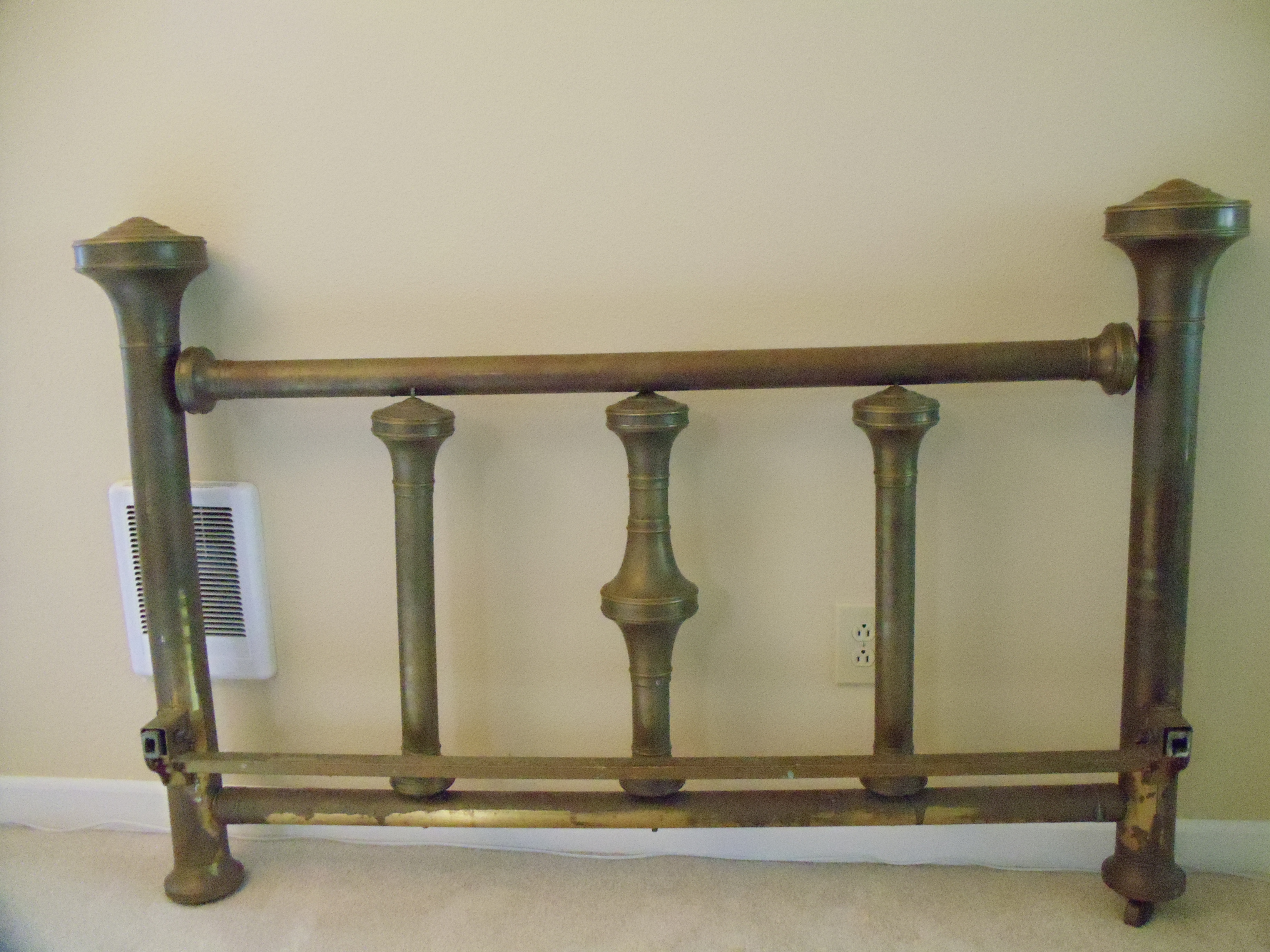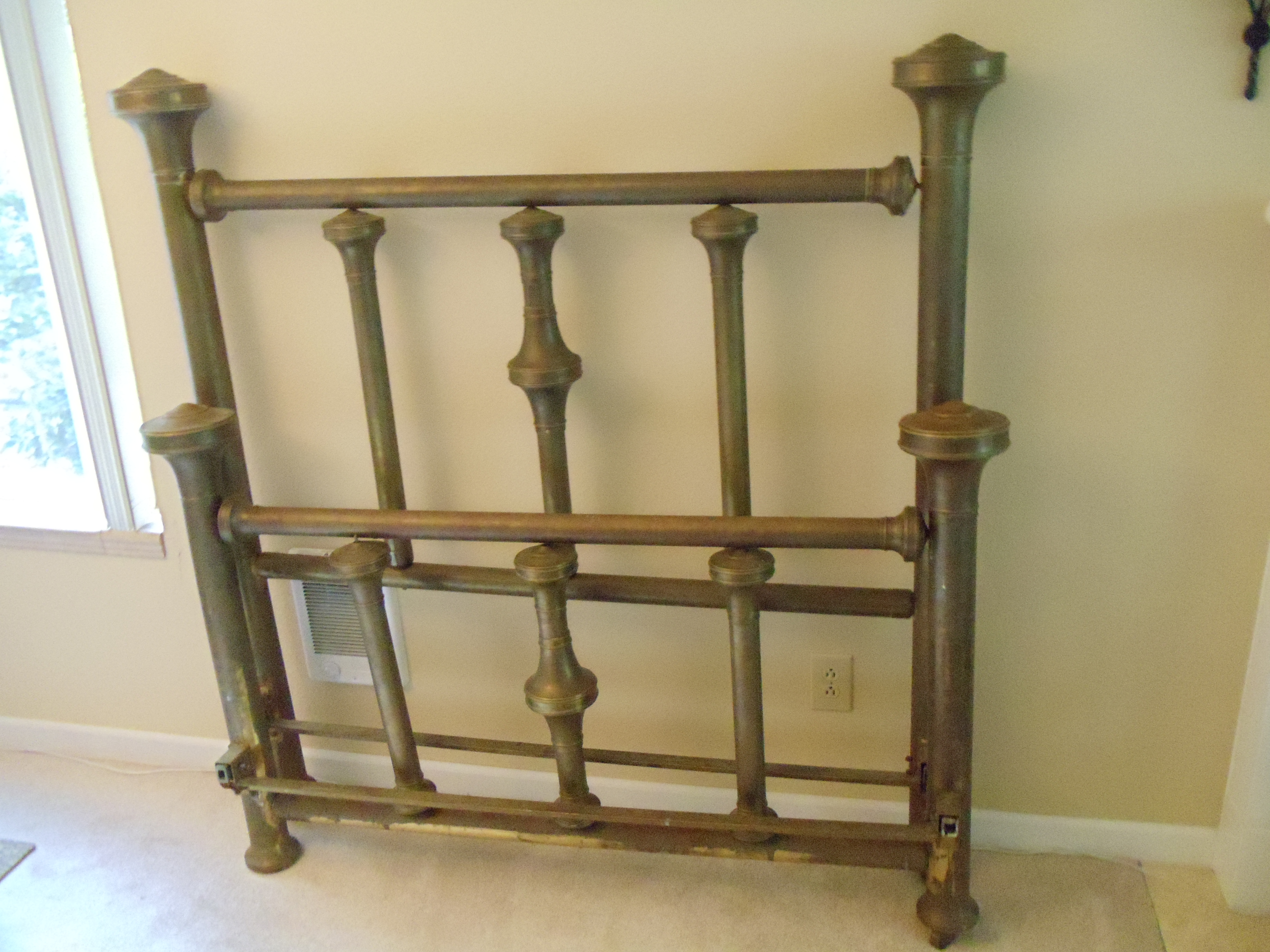 antique brass bed possible 100-200 old.  weighs 93 lbs.  may fit a full size.  no frame available for mattress.  good condition with one very small dent.   height 4' 11"  X width 5' 0.   foot board is 3' 3" high.  headboard is 4' 11".