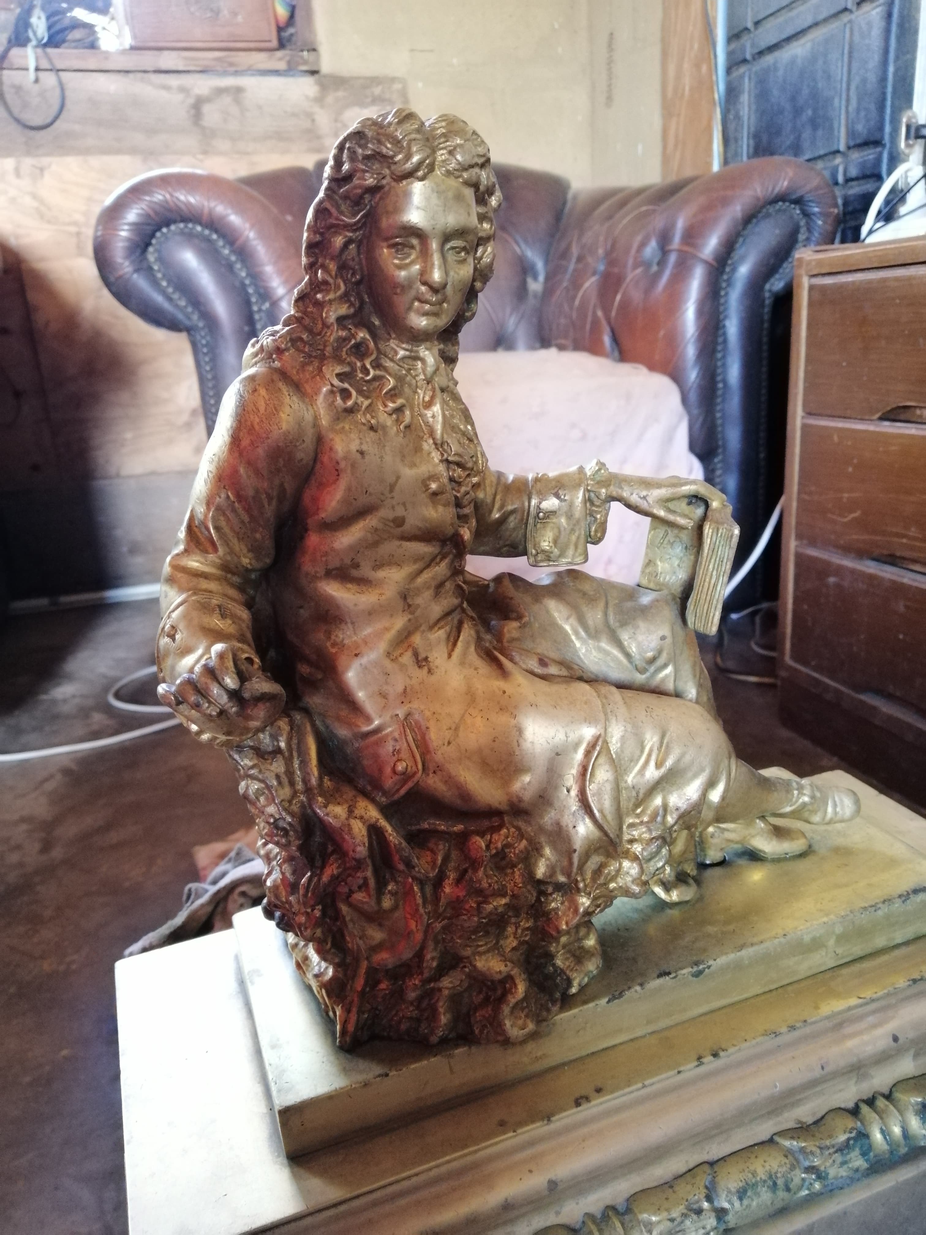 The Frenchman has a hallmark and what appears to be a signature on the back, he also is holding a book that has a title etched in the front and text inside the book.