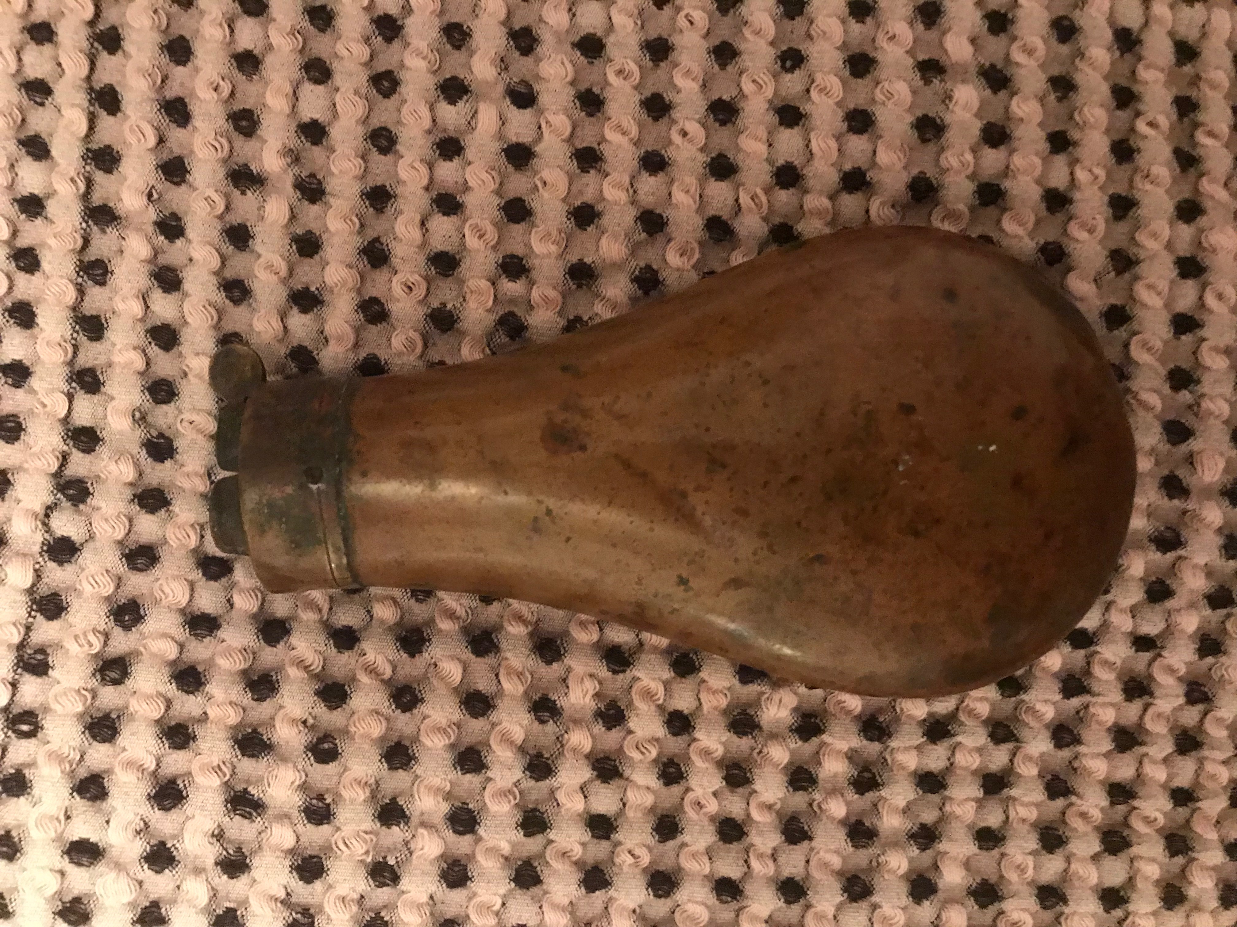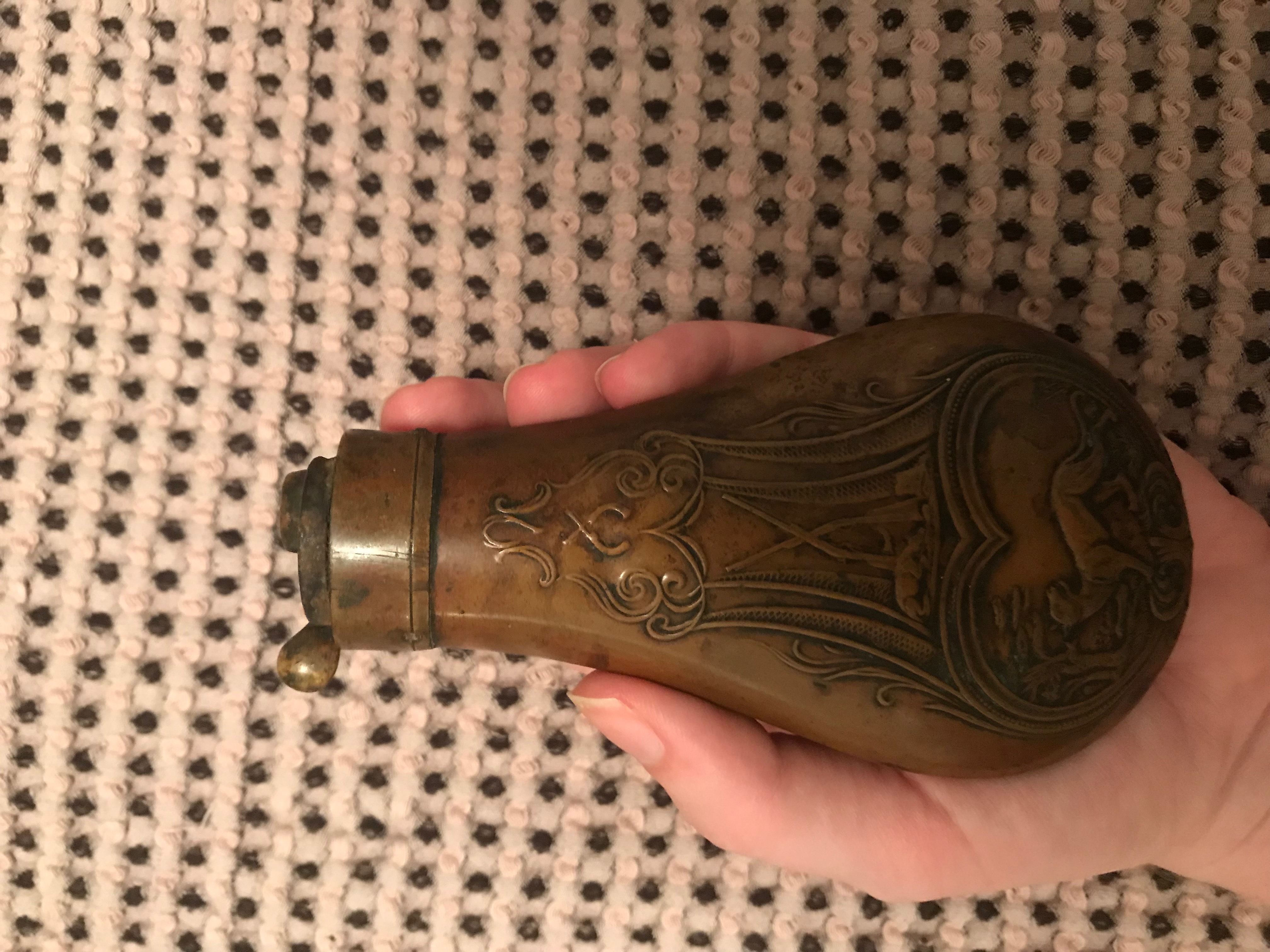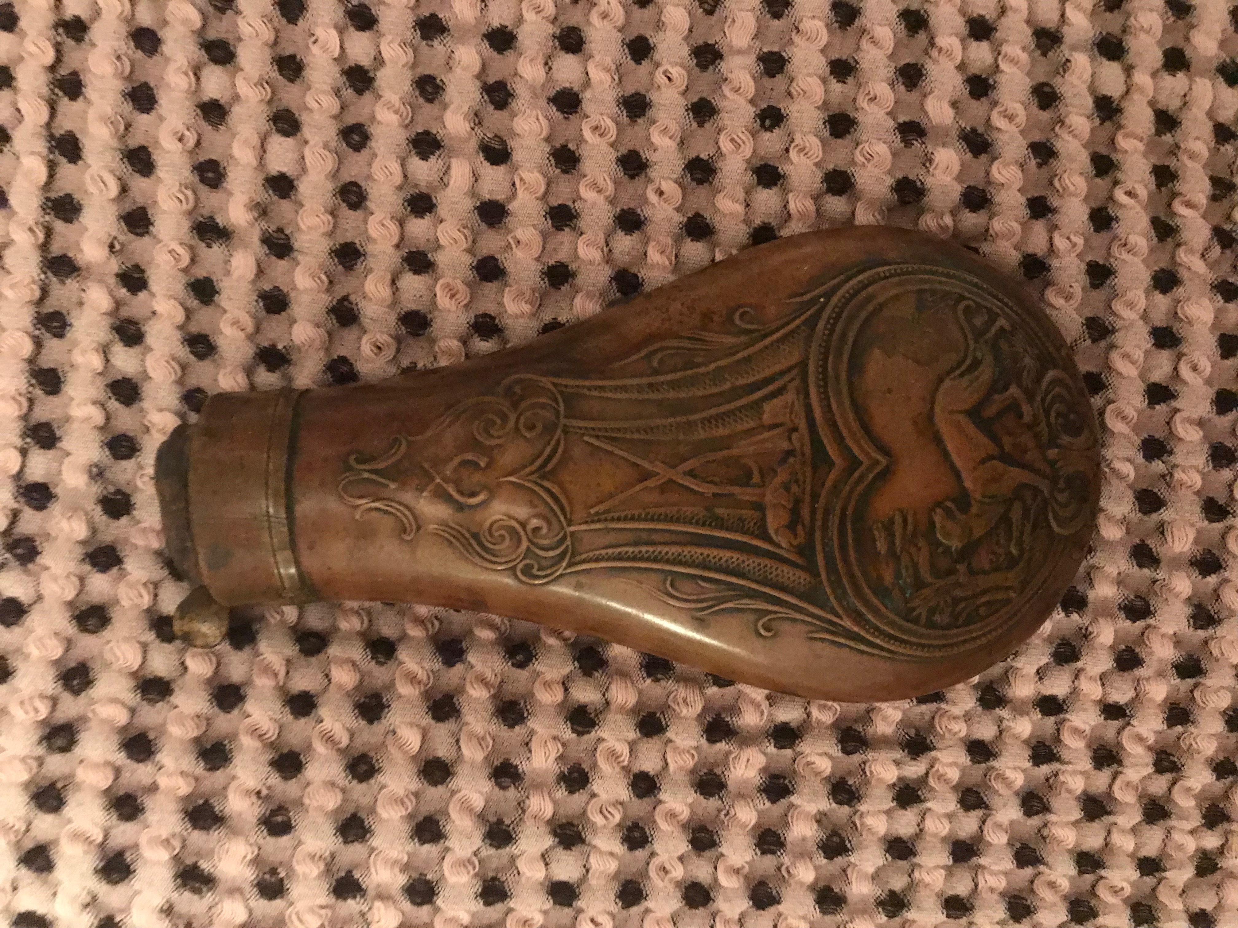 Antique Brass Gun Powder Flask. Engraved with large cat, dog and guns. Open top.