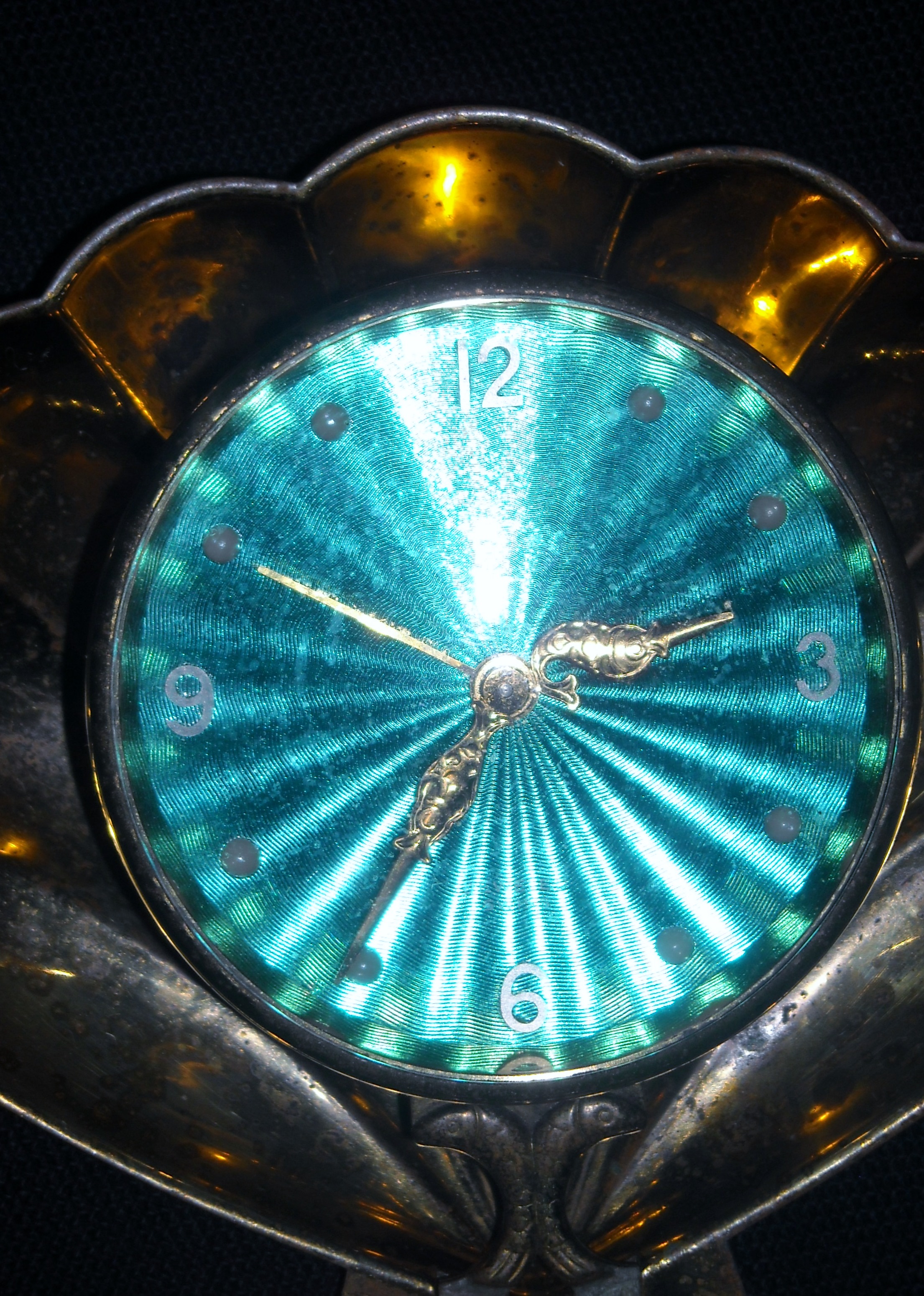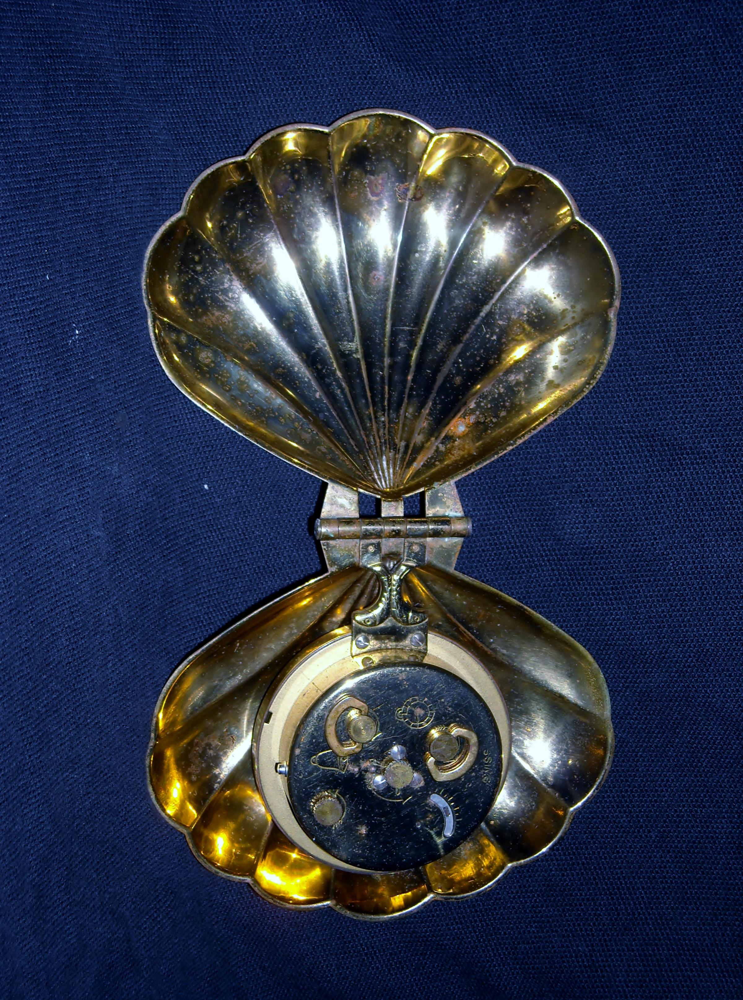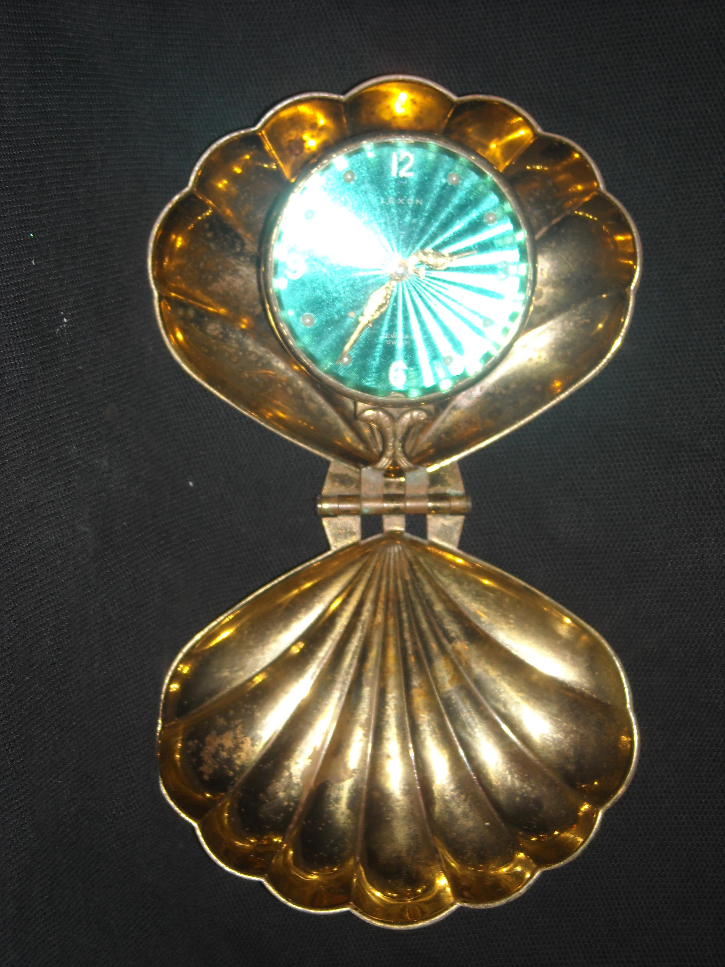 Lexon swiss jeweled clock in a brass (?) scallopeed shell, that's hand wound (doesn't work) that my grandparents owned. I haven't been able to find out much else about this clock. I even emailed the Lexon for information about it to no avail. Someone, please help me! Thanks in advance