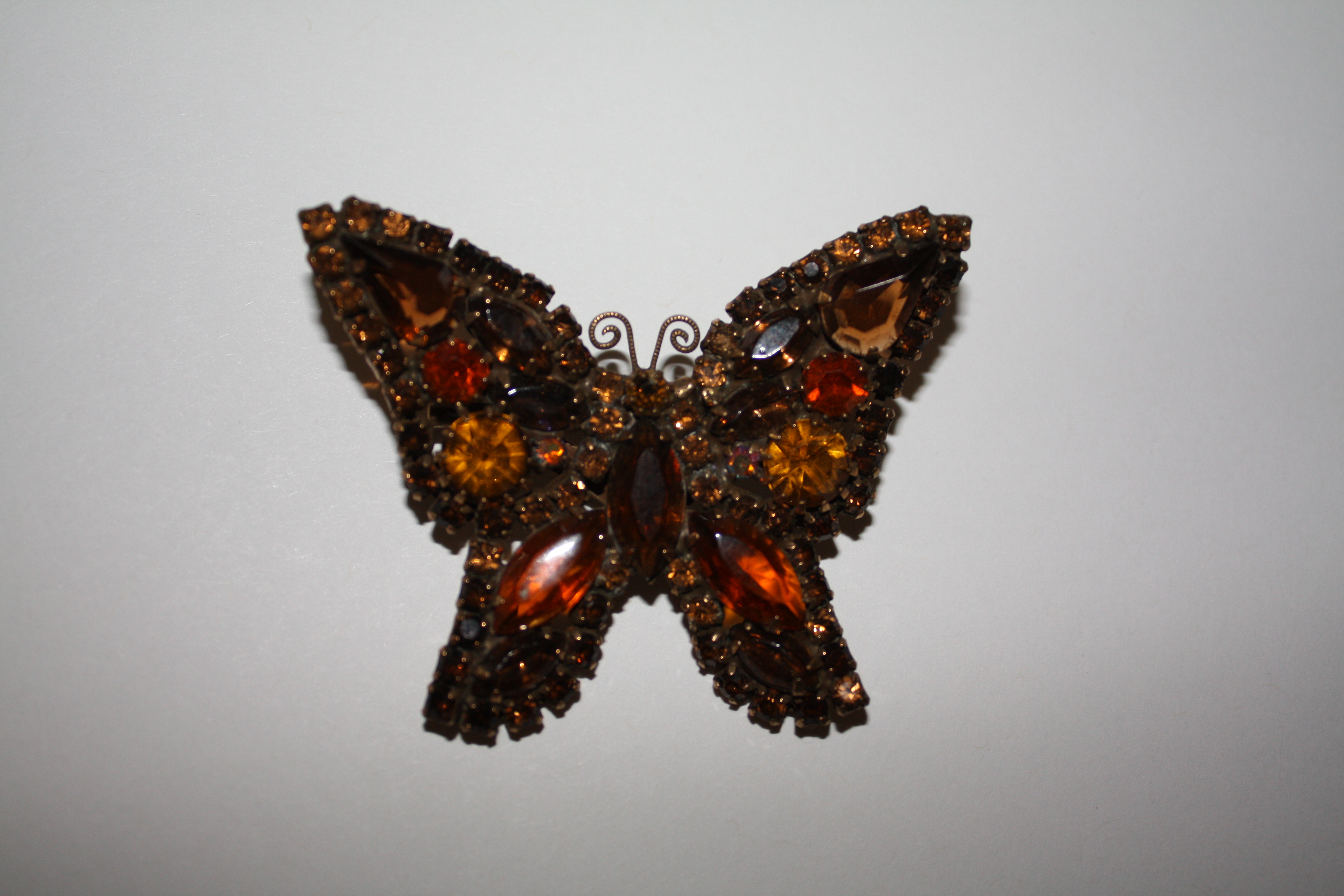 This is a 2 3/8 in wide by 1 3/4 inc Butterfly broach marked WEISS with circle c under WEISS on the back. The stones are all varied colors of amber. Excellent shape.