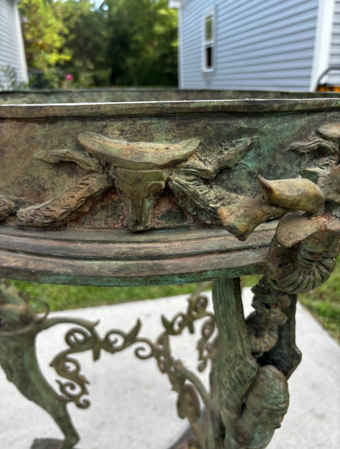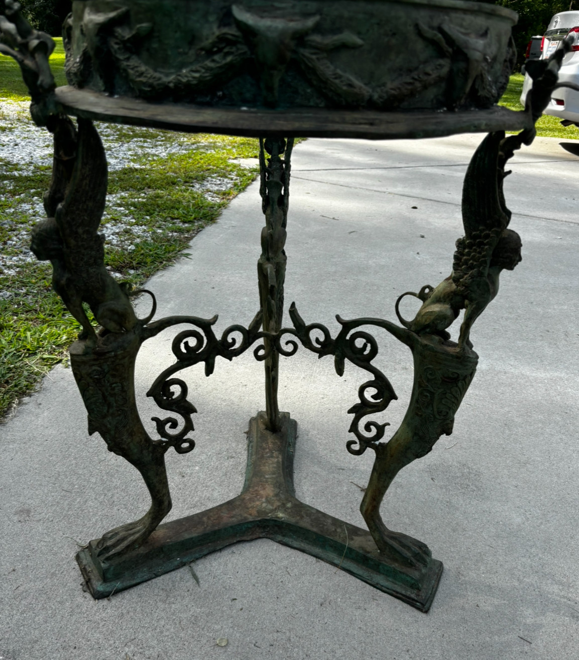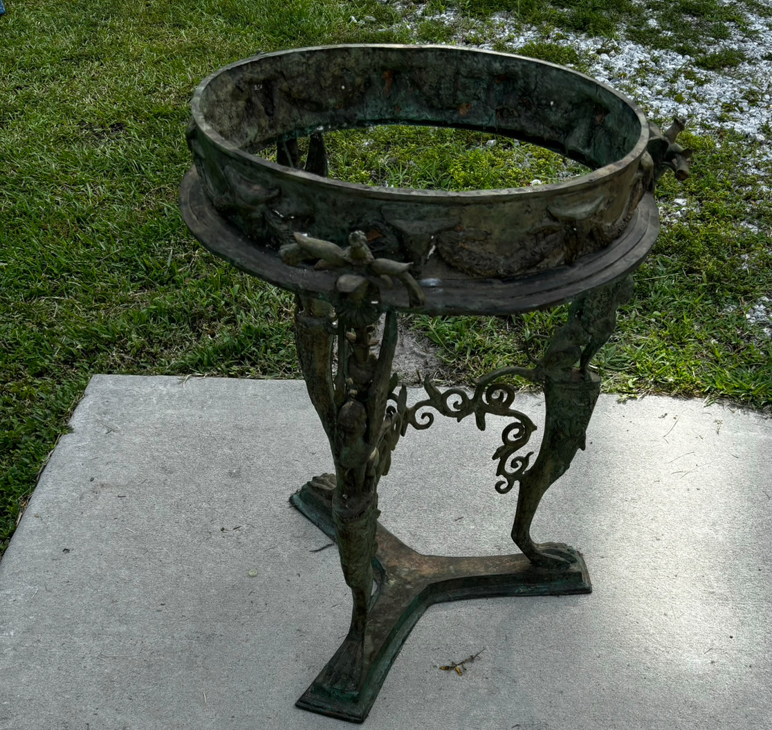 Physical Description: This antique bronze stand measures approximately 28.5 inches in height and 19 to 19.5 inches in diameter, depending on the measurement point. It weighs 55 lbs. The item exhibits a greenish patina, indicative of age and exposure, and is non-magnetic. Notable scratches on the base reveal a bright yellow-gold color underneath the green finish. There are no visible manufacturer or artist markings.