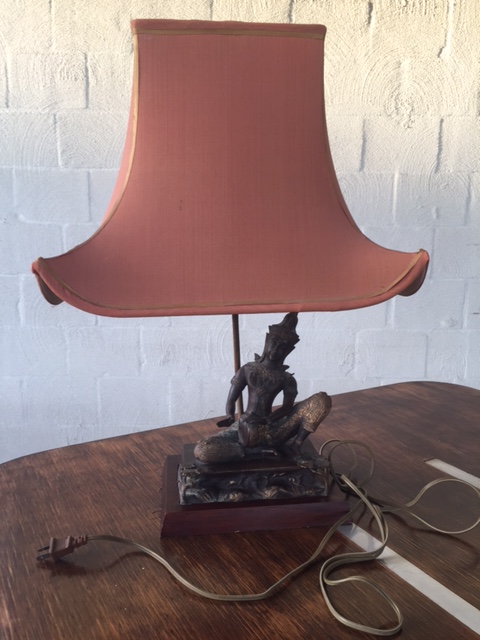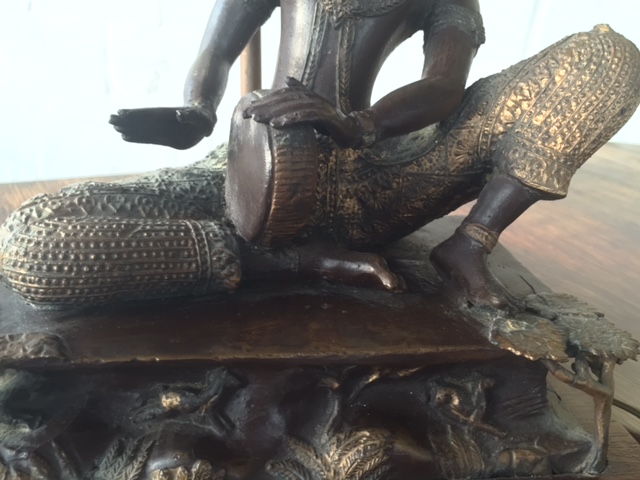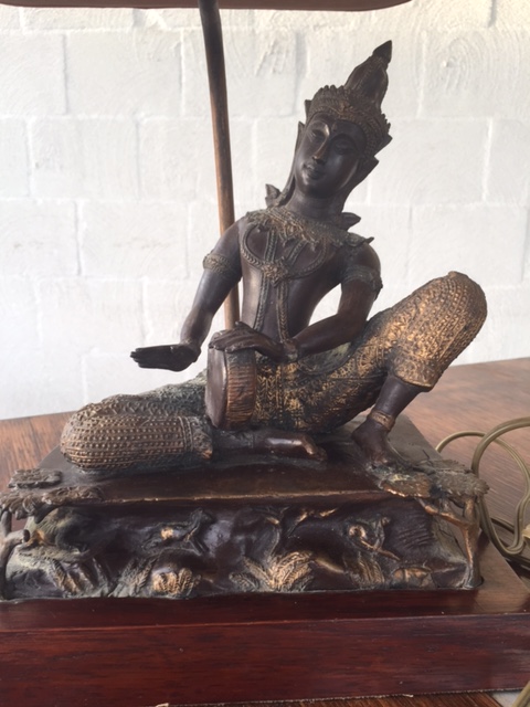 Solid, heavy brass status on a wooden base, with gold detailing. Not sure if it's real gold though. Came from an Australian ambassitor to Singapore. He received it as a gift from the Singapore palace.