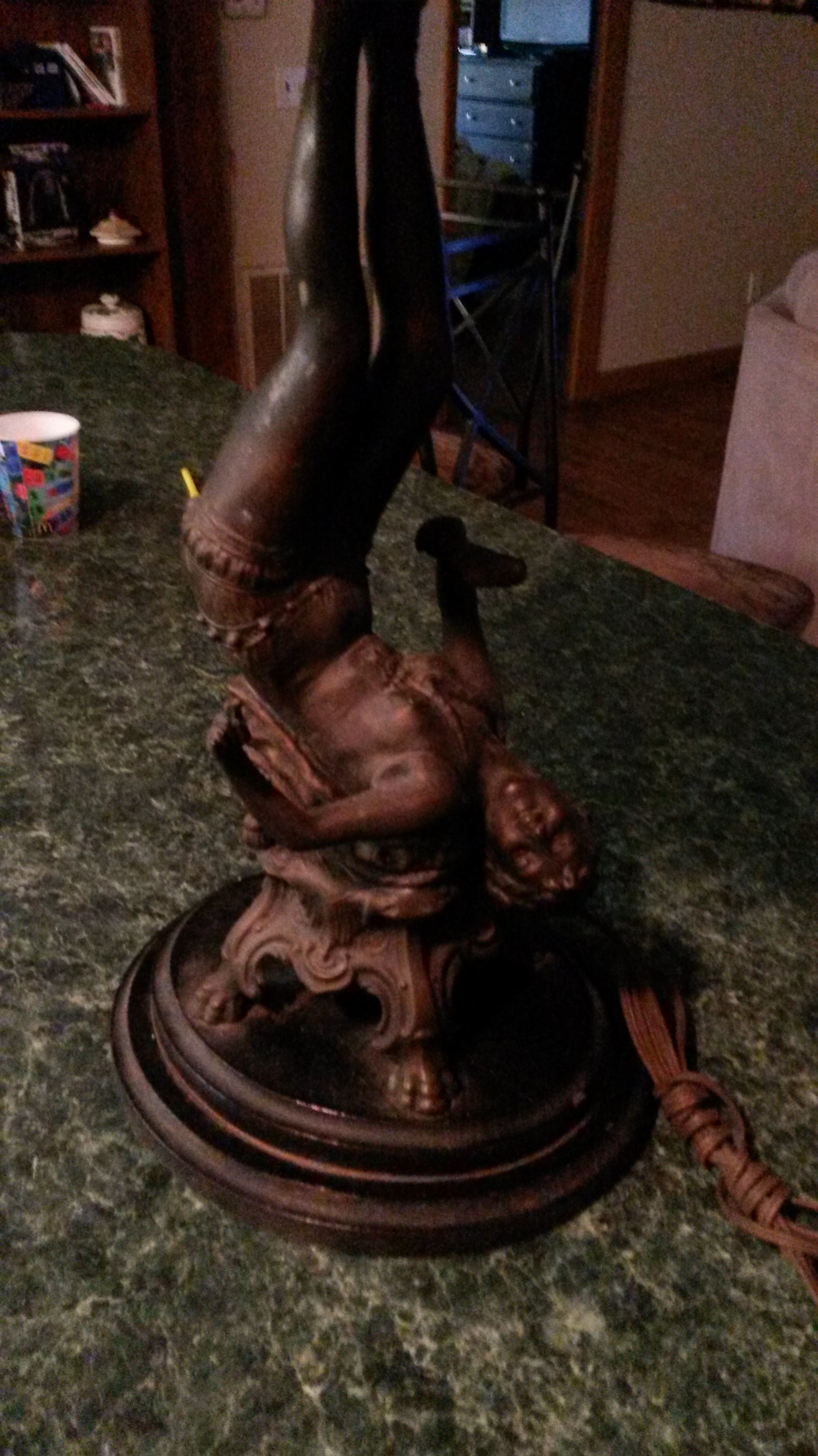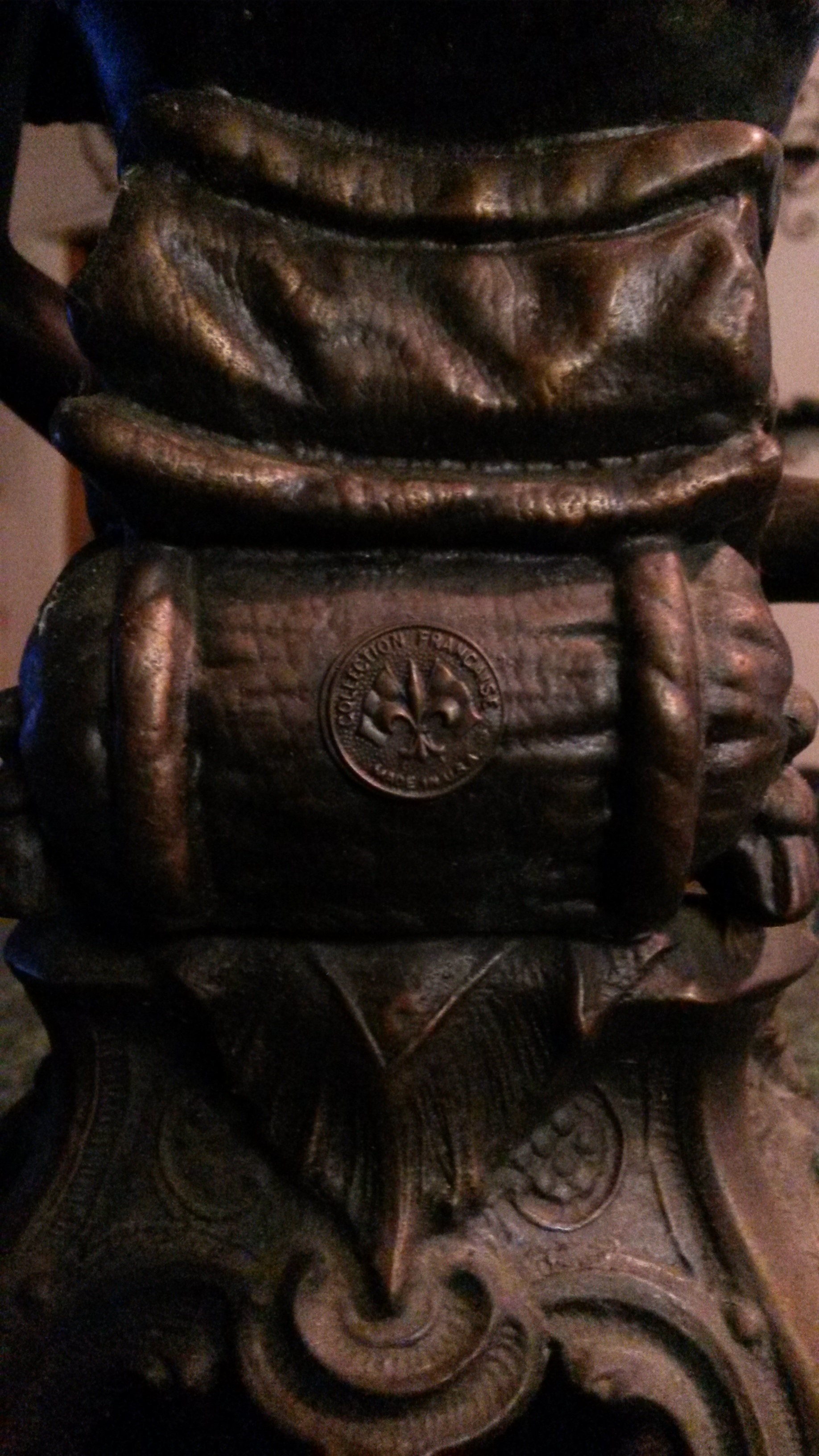 This bronze lamp was inherited from my grandmother, I think it's the original lamp shade. The lamp itself is bronze and the base is wooden. There is a seal on the back with a Fleur de Lis that says Collection Francaise across the top and Made in USA.