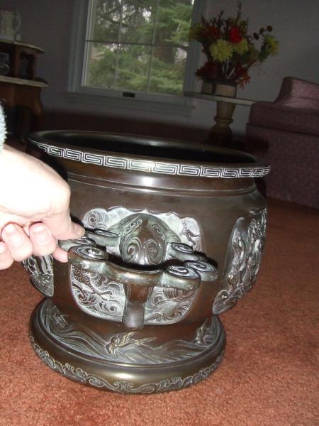 Top Width-11.5", Height-10.75 inches, Base Width-10", circumference approximately 36". The planter was a gift to one of the caretakers, my great grandfather, from the John Roebling estate (builder of the Brooklyn Bridge) in New Jersey. I can't prove provenance, but this was the case. The planter was then given to my parents as a wedding gift over 65 years ago. Pot is in good shape except for a soldered repair on the bottom which can't be seen. Scenes are all different and appear to be hand carved. The handles on either side appear to be elephant heads. Is either Chinese or Japanese and probably from the 19th C if not earlier.