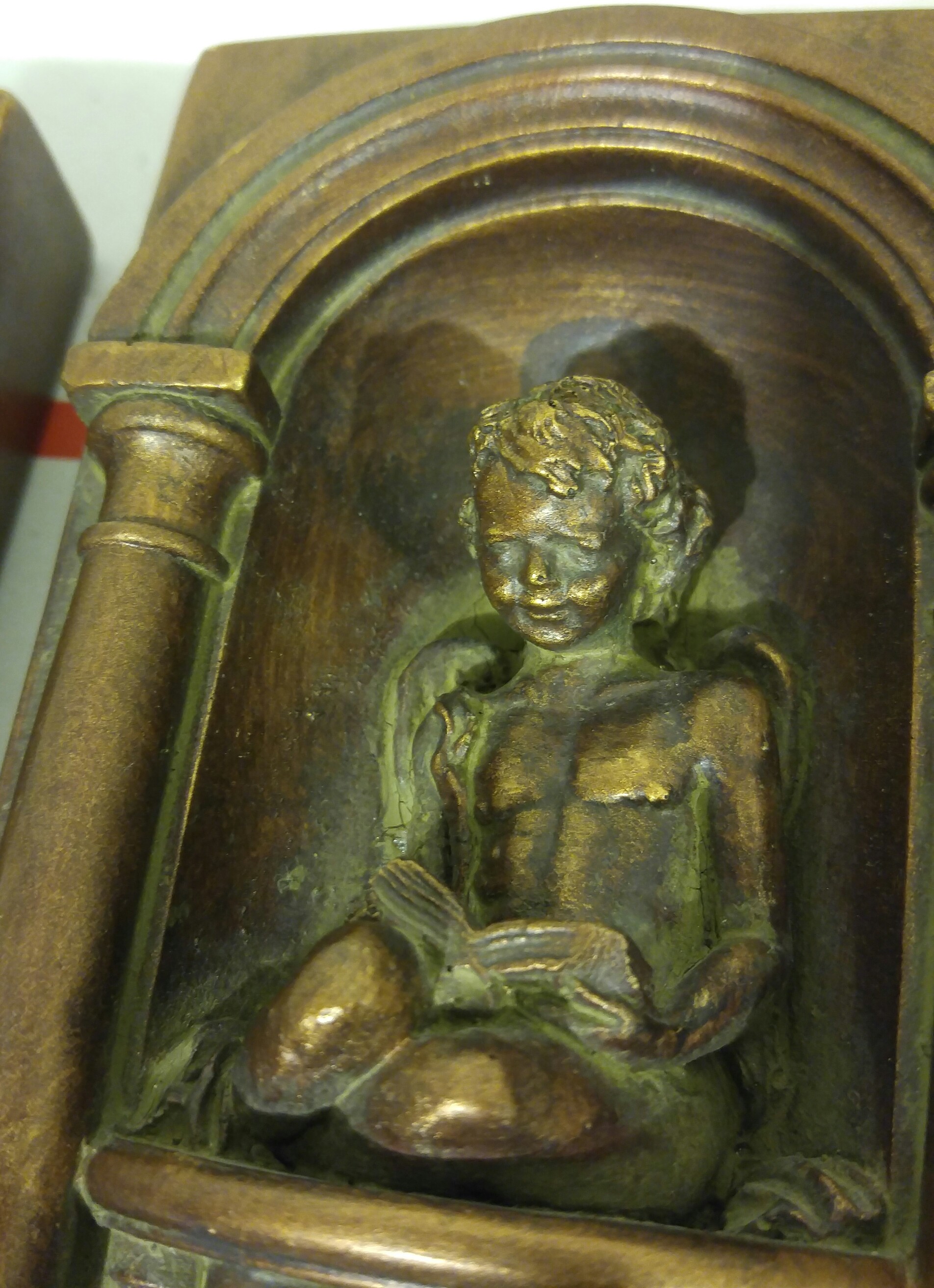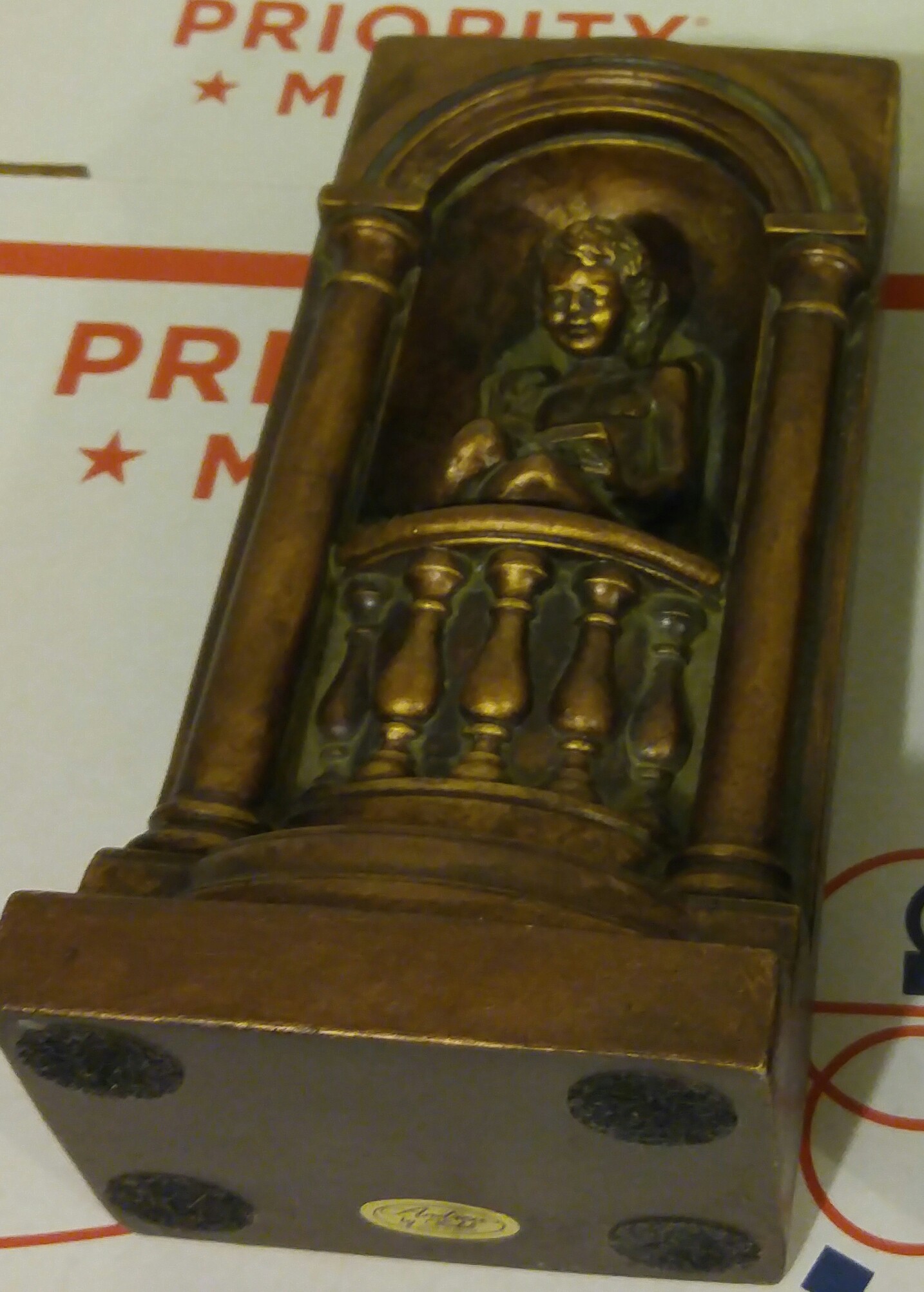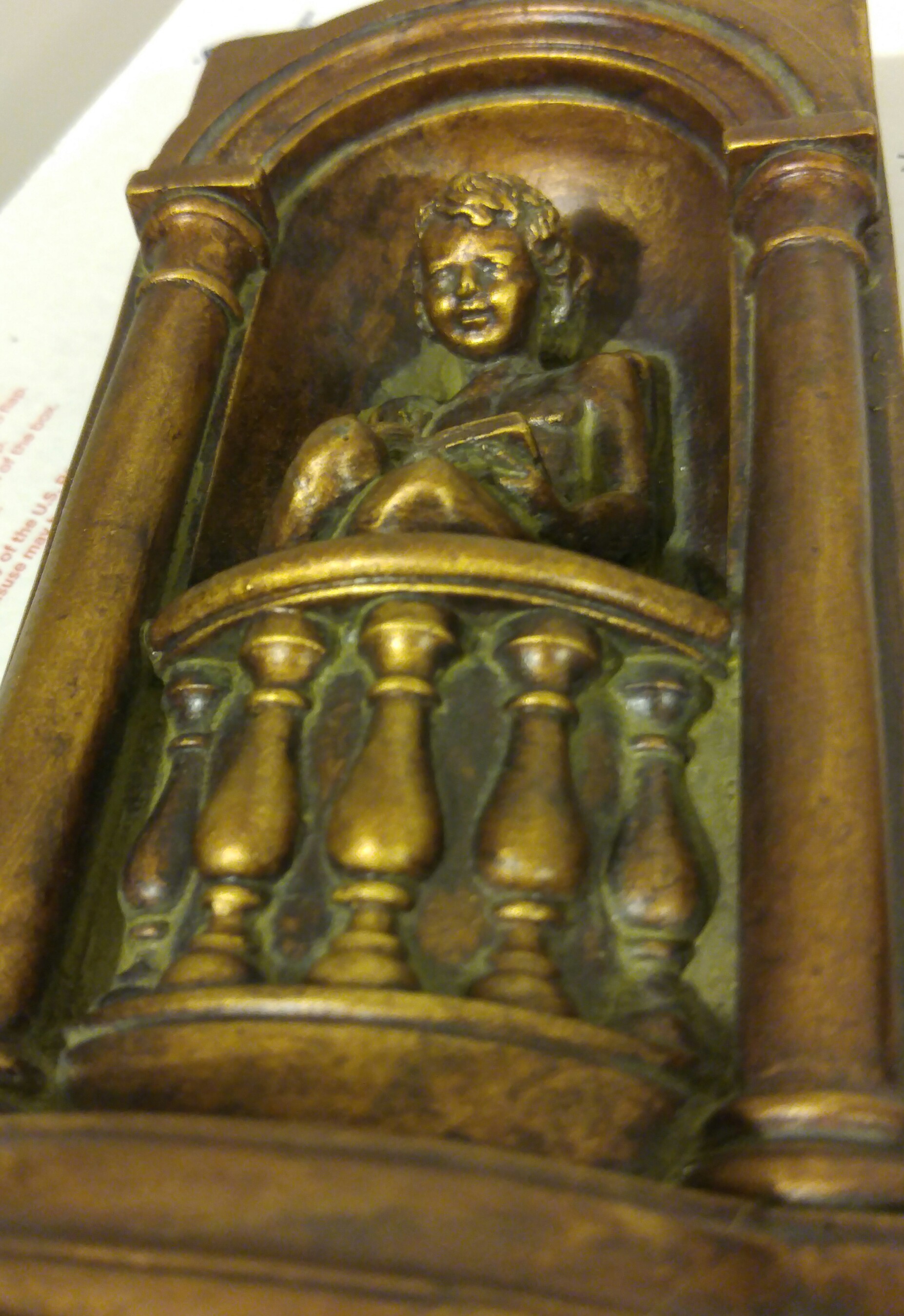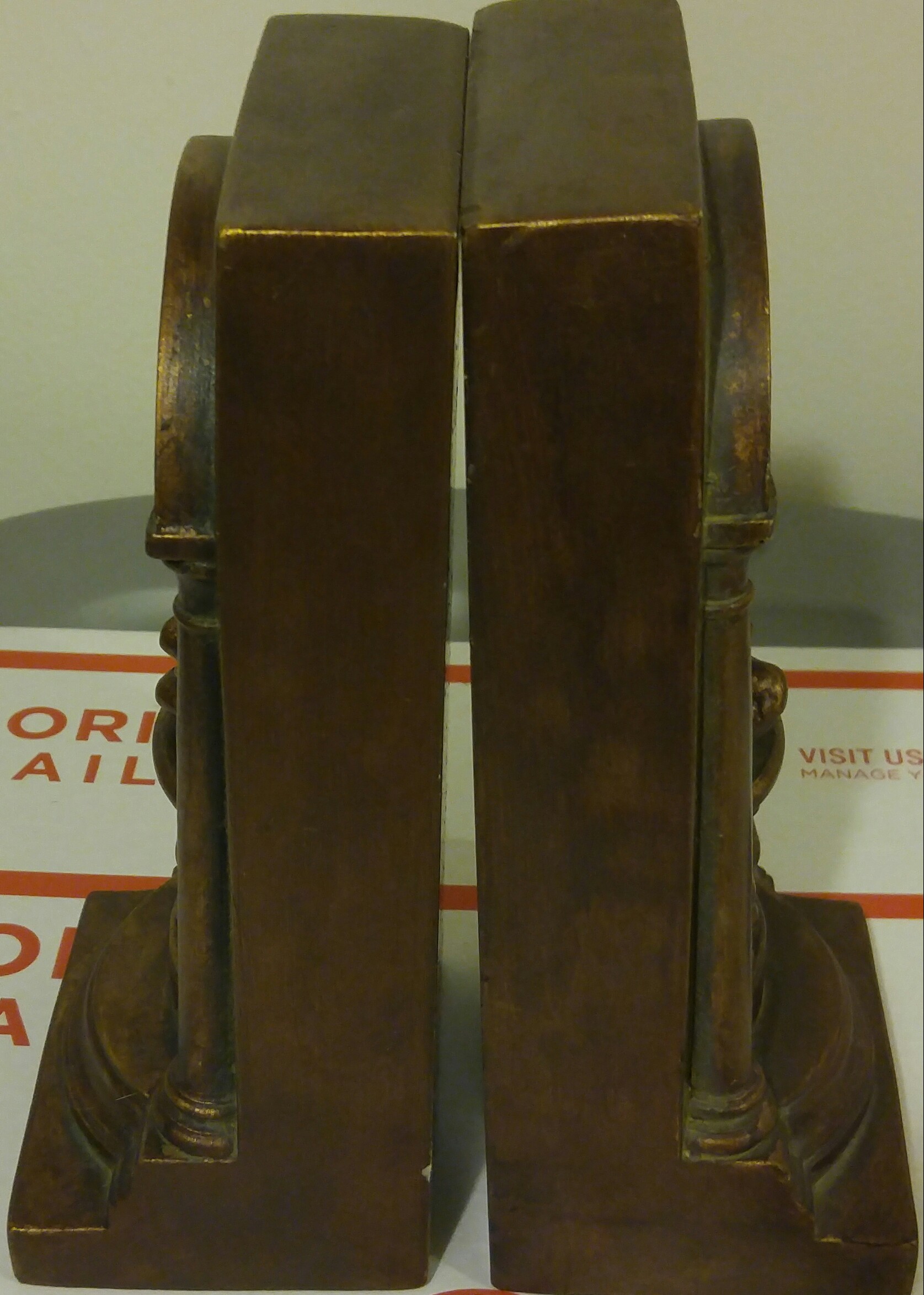 Bronze or copper colored bookends that appears to have an male angel reading a book with knees folded somewhat underneath but to the right in sitting position between two columns that supports an archway. Each bookend weighs about 3.3lbs and stands at ameasured height of 8 inches. The base width or side to side totals 3 3/4 inches. Base depth-front to back measures 3 inches. Nice and heavy, have a slight metallic feel but no response to a magnet. On the bottom side of each bookend a gold colored oval shaped sticker is affixed with the words "Andrea by Sadek, made in China."