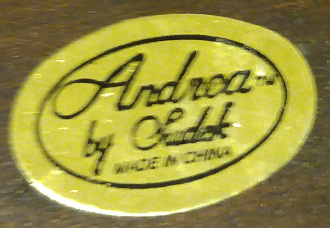 Gold colored oval shaped sticker affixed to bottom that reads "Andrea by Sadek made in China"