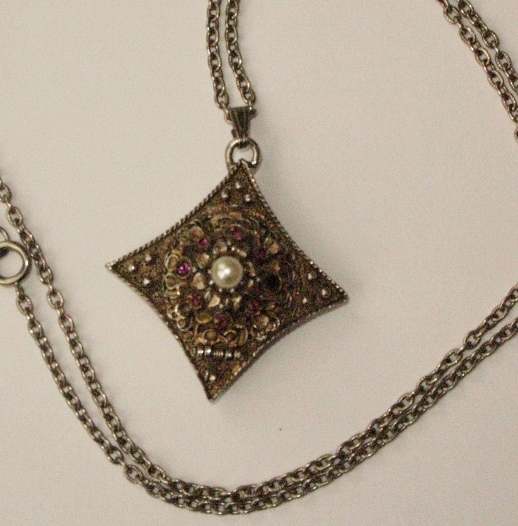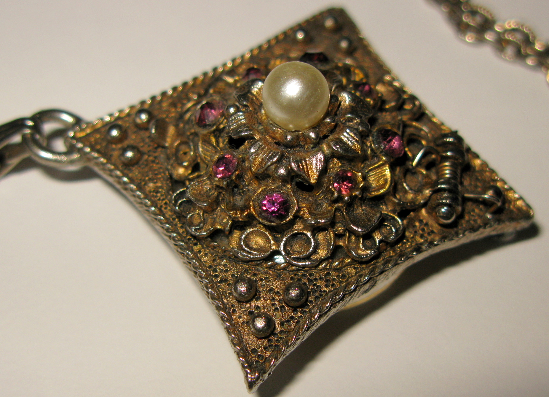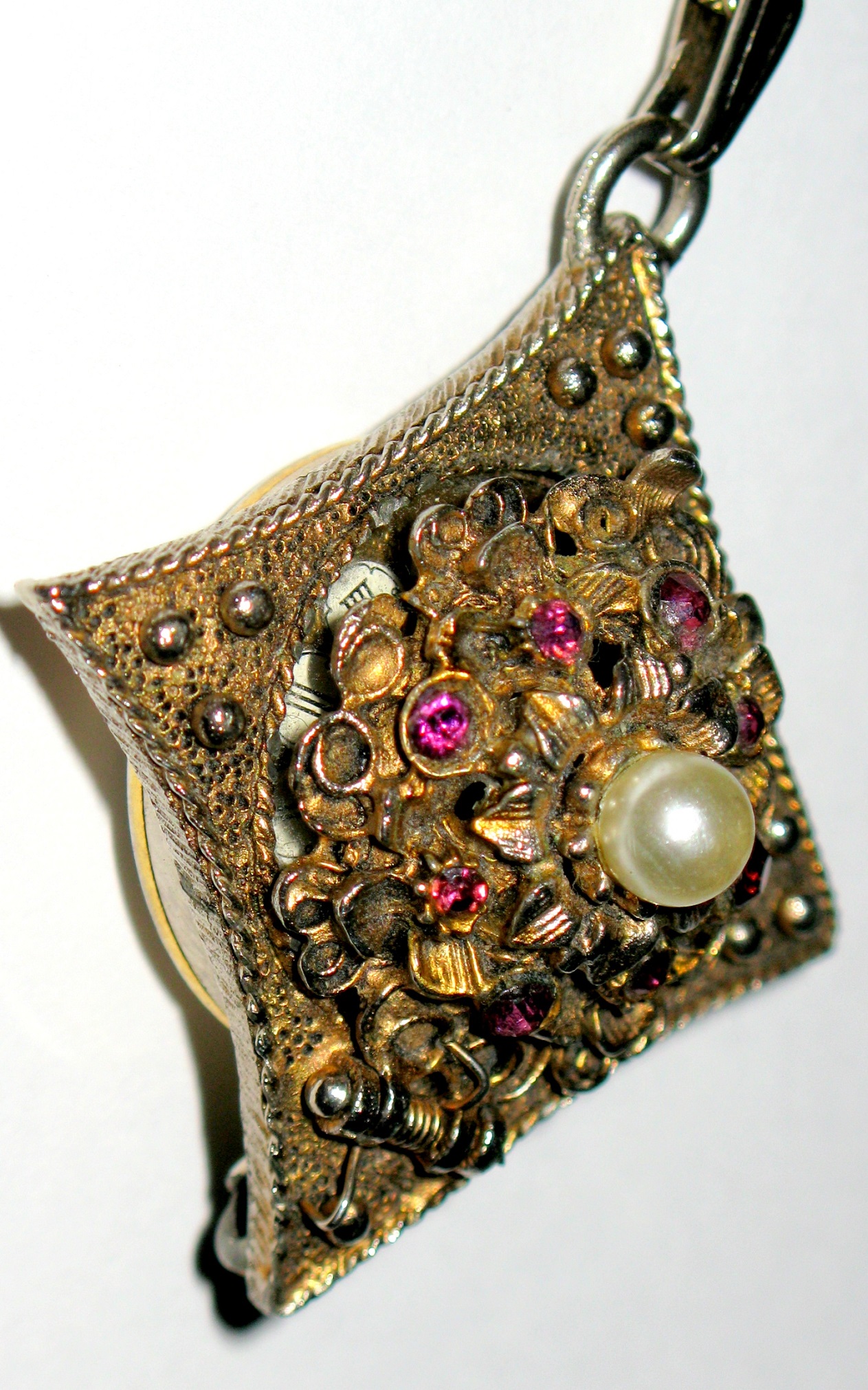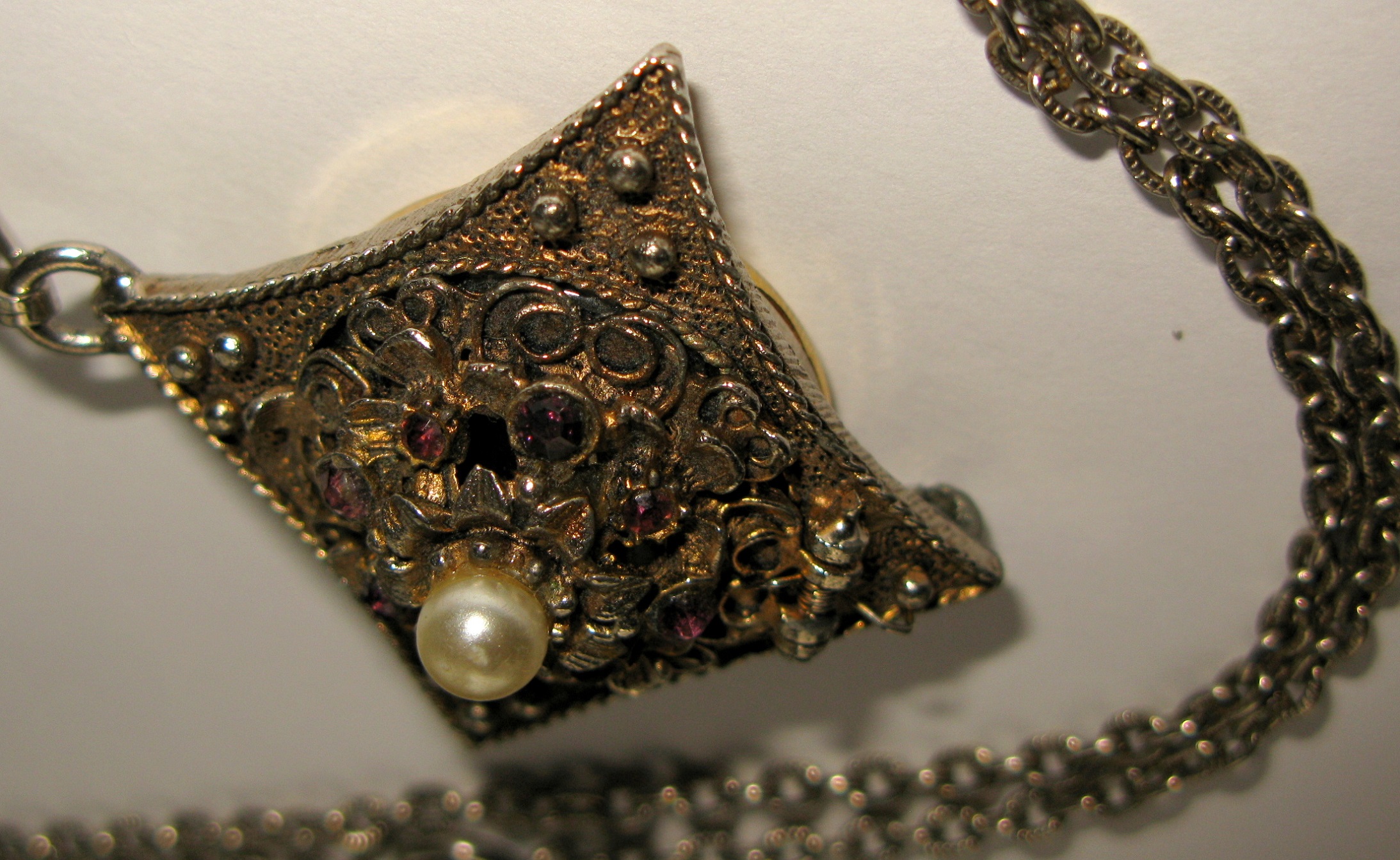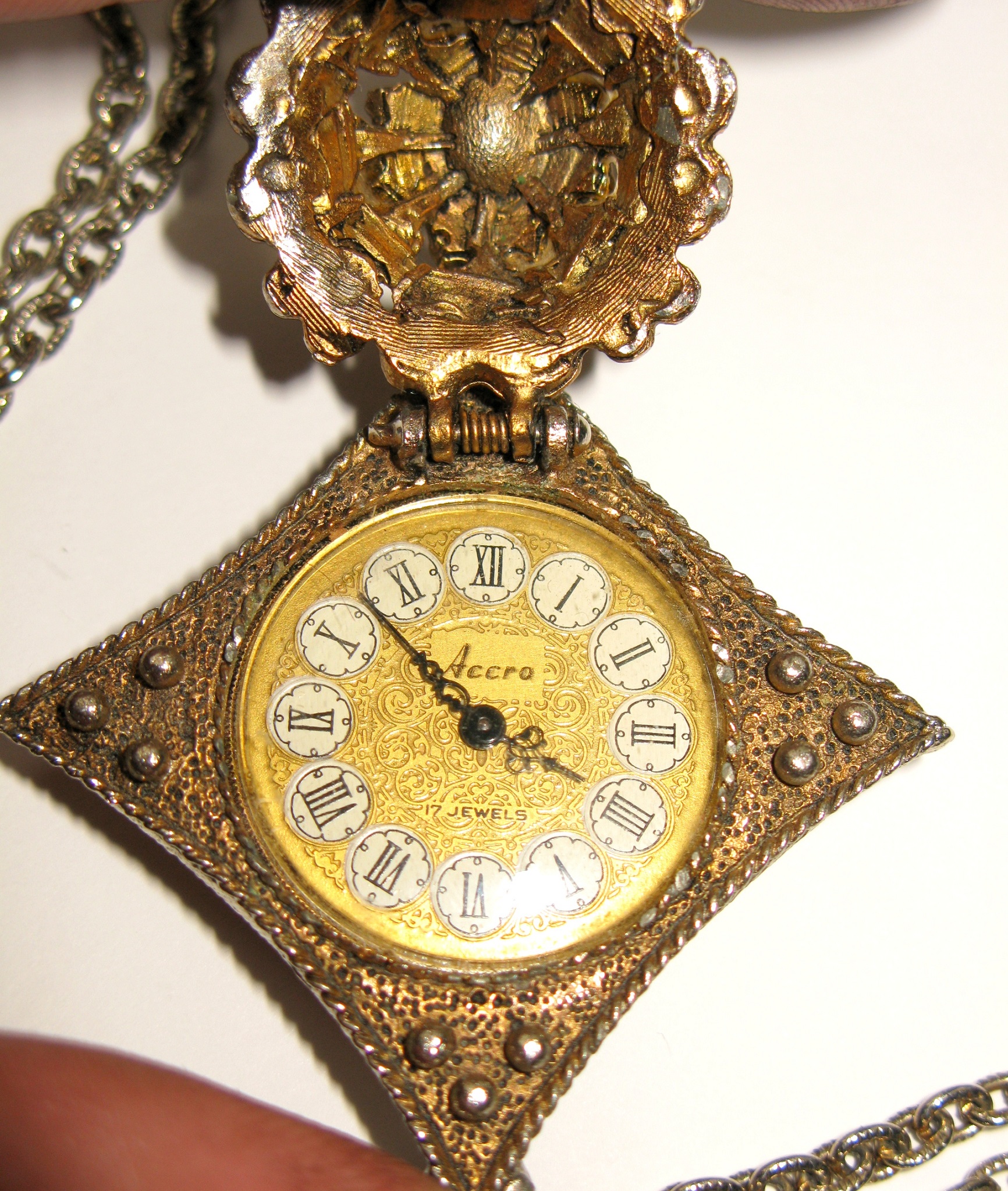 This gorgoeous ornate Antique brooch/pendant 17 jewels watch with decorative pearls amethyst and repousse is unlike any of its kind. It is diamond shaped approximately 1.5" by 1.5" and 3D due to the elaborate embellishments. The watch still runs. The watch face is revealed by lifting up the hinged front of the brooch. Across the top of the watch face it says "Accro" in cursive; across the bottom it says "17 jewels." The numbers on the watch dial are marked with Roman numerals. The closest accro pendant I have come across has been one by Walter Lampl.
