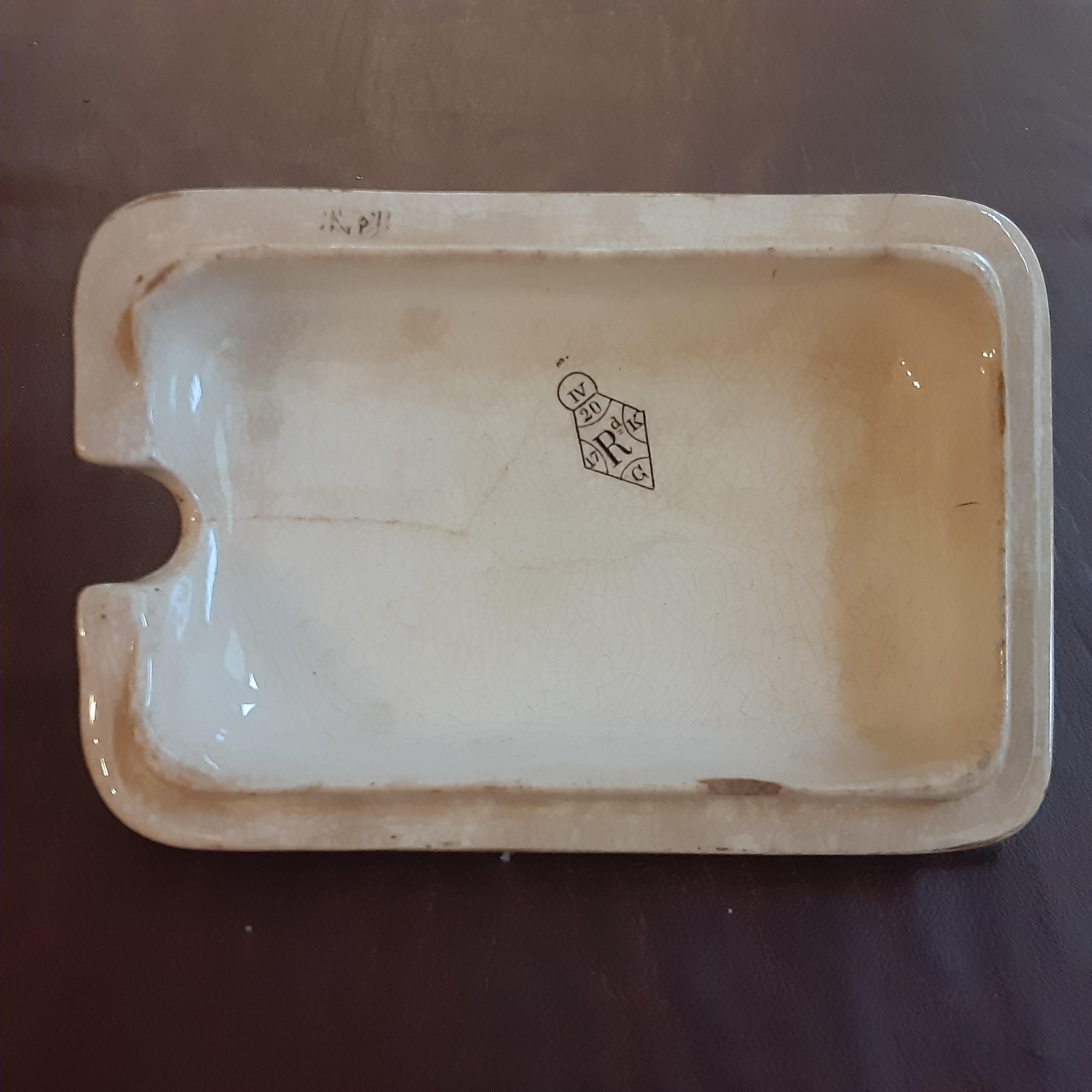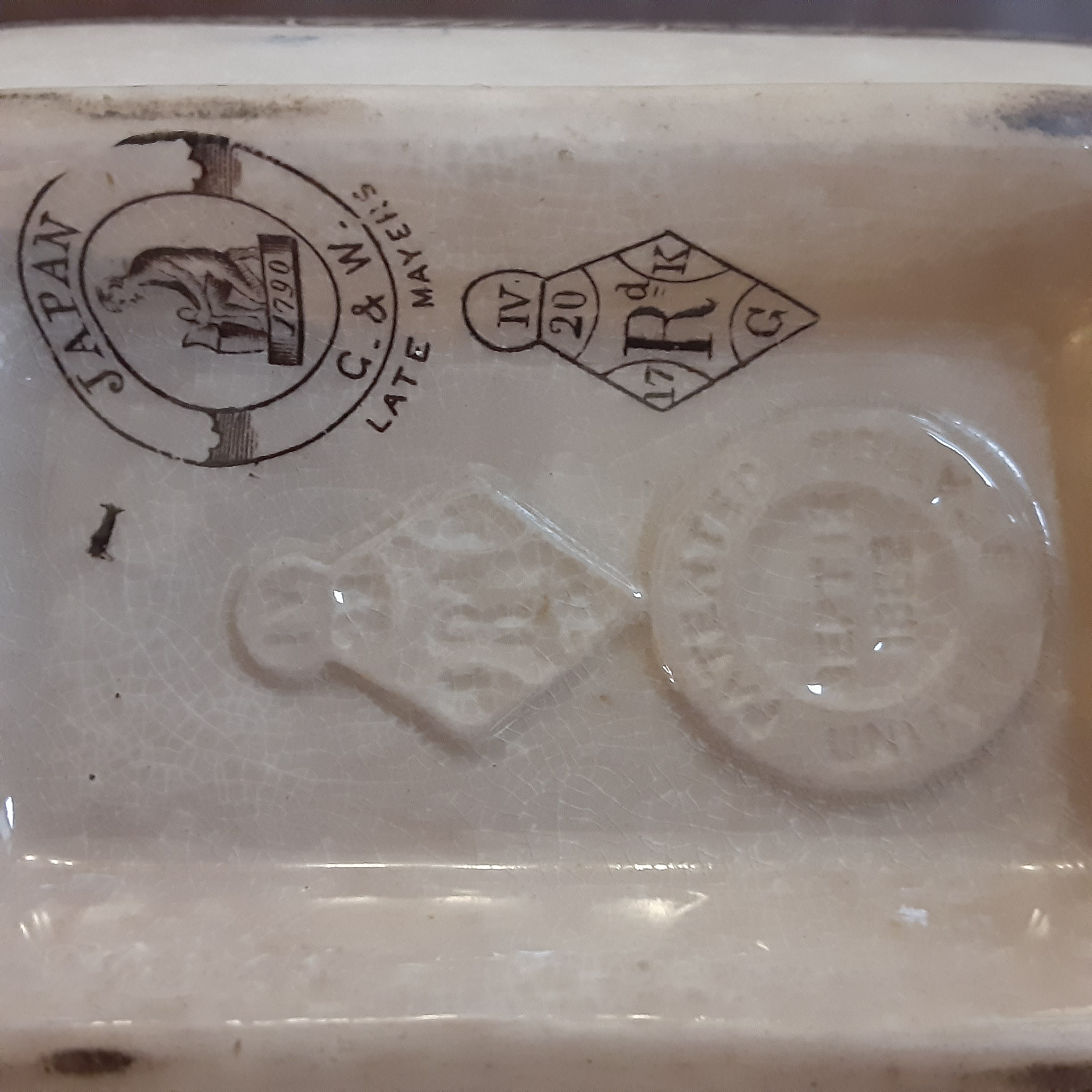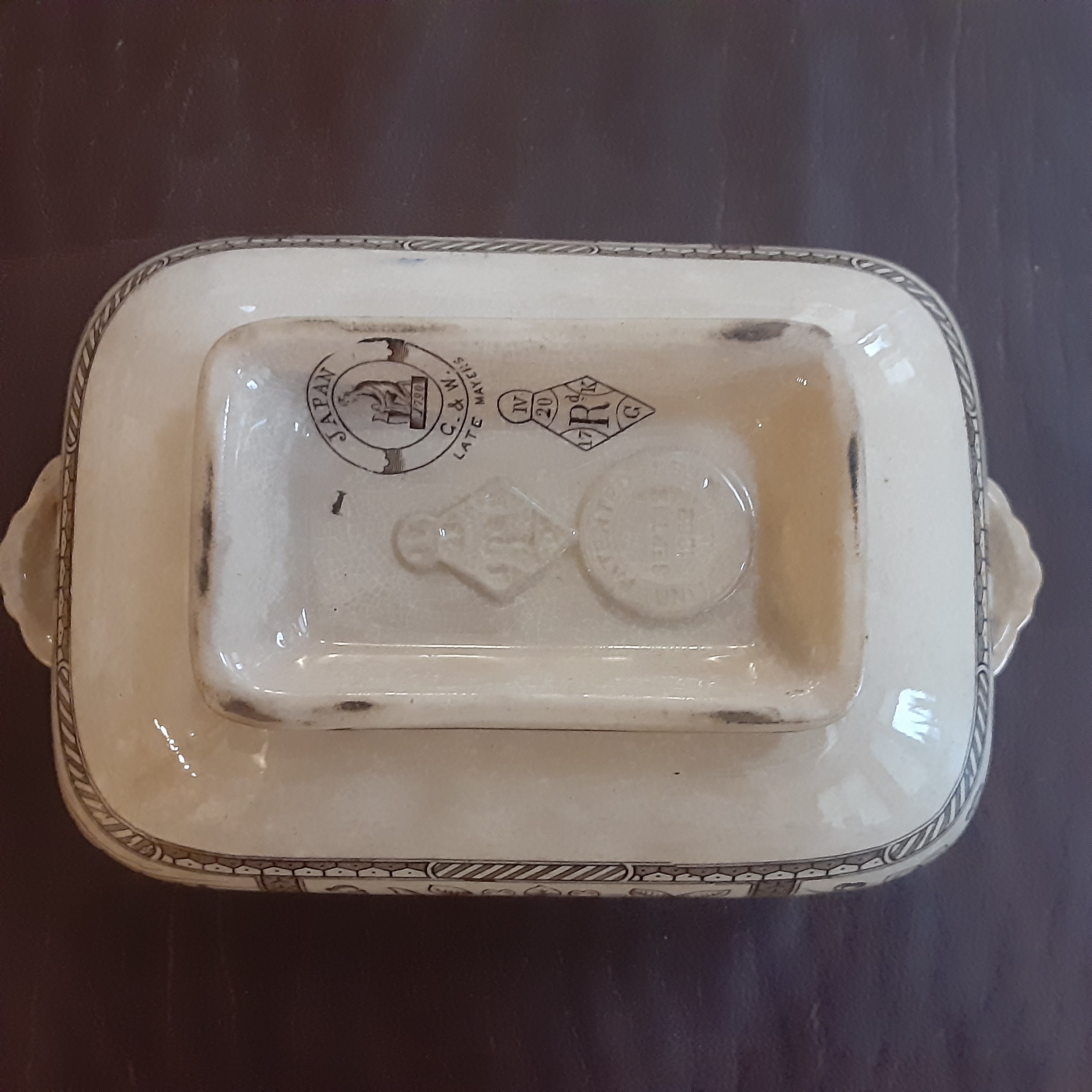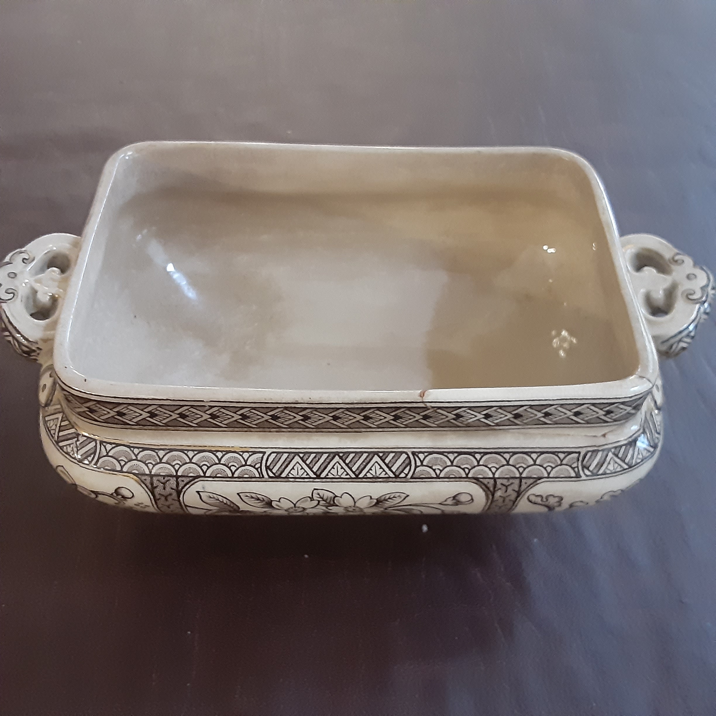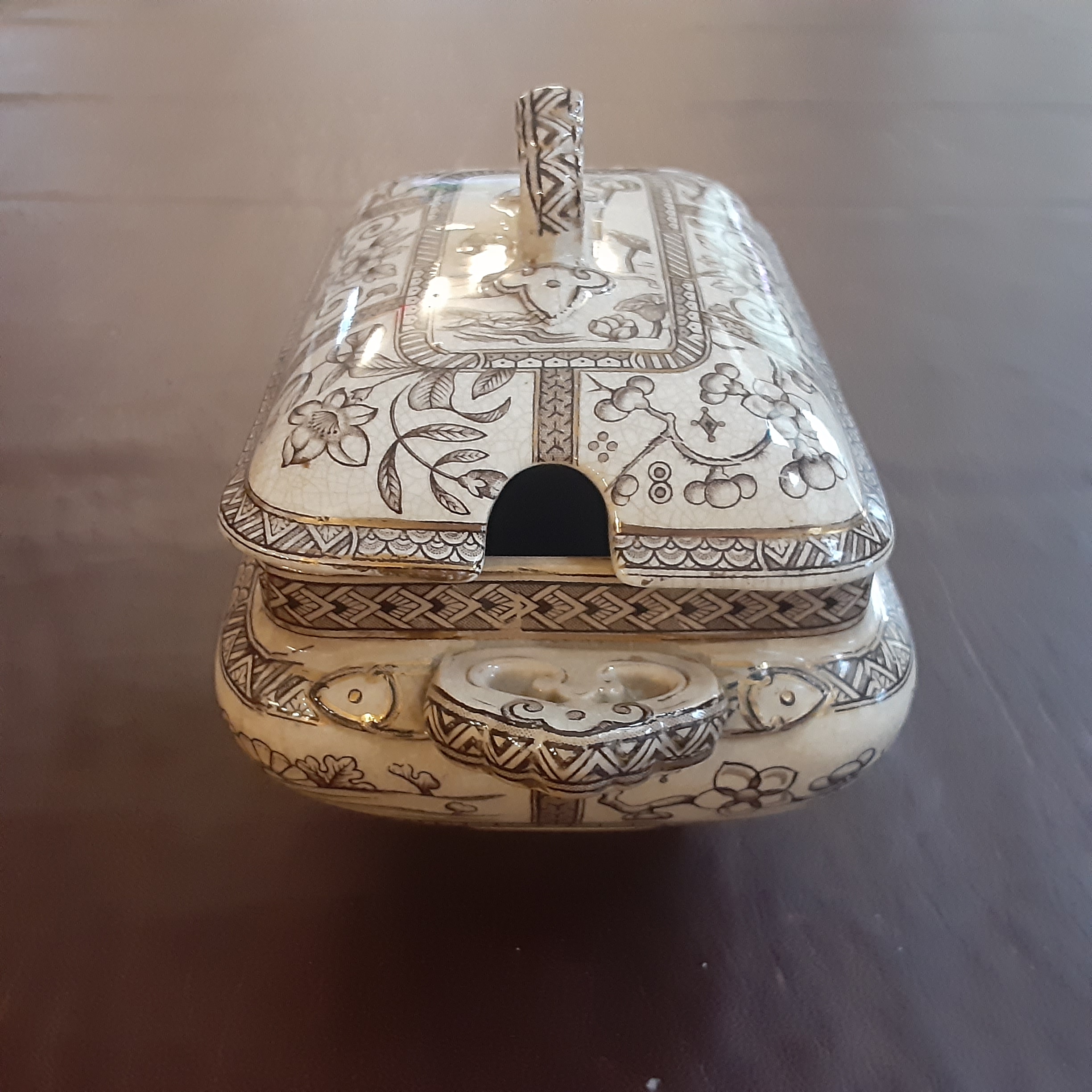 Antique Brown Transfer Handled Bowl With Lid. Made by G and W Late Mayers. Dating to c. 1883. Materials: Ceramic. Estimated value: $100 – $150. Condition: Good. The market for antique transferware is currently stable, with moderate demand among collectors.