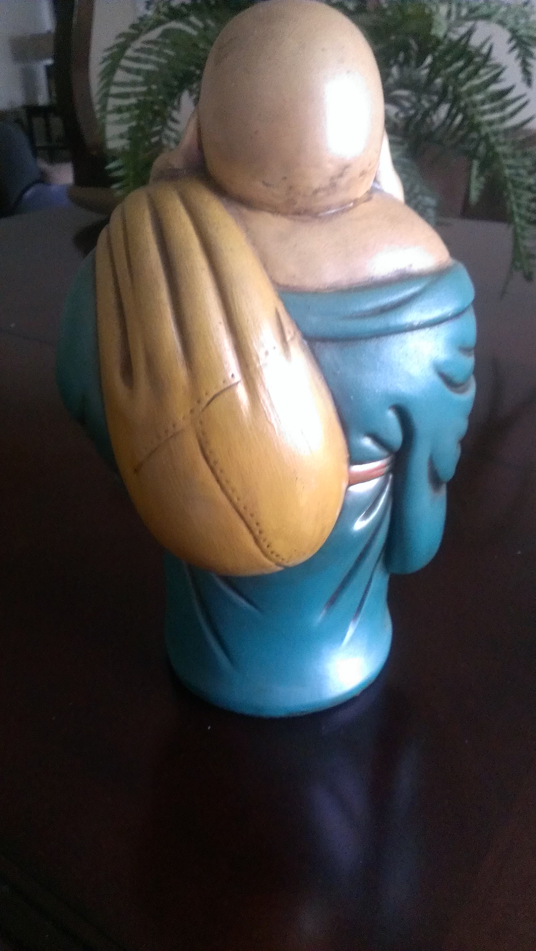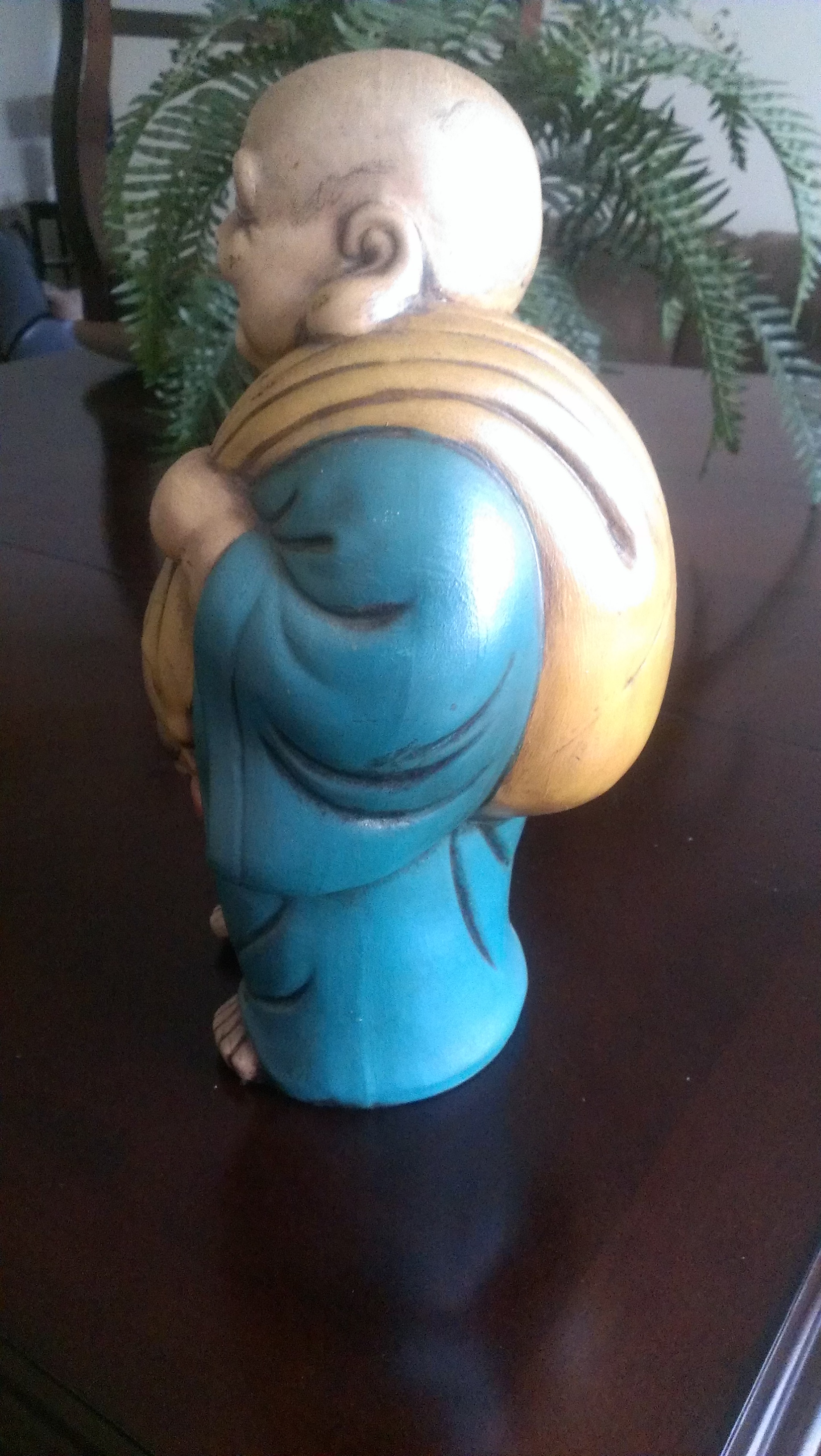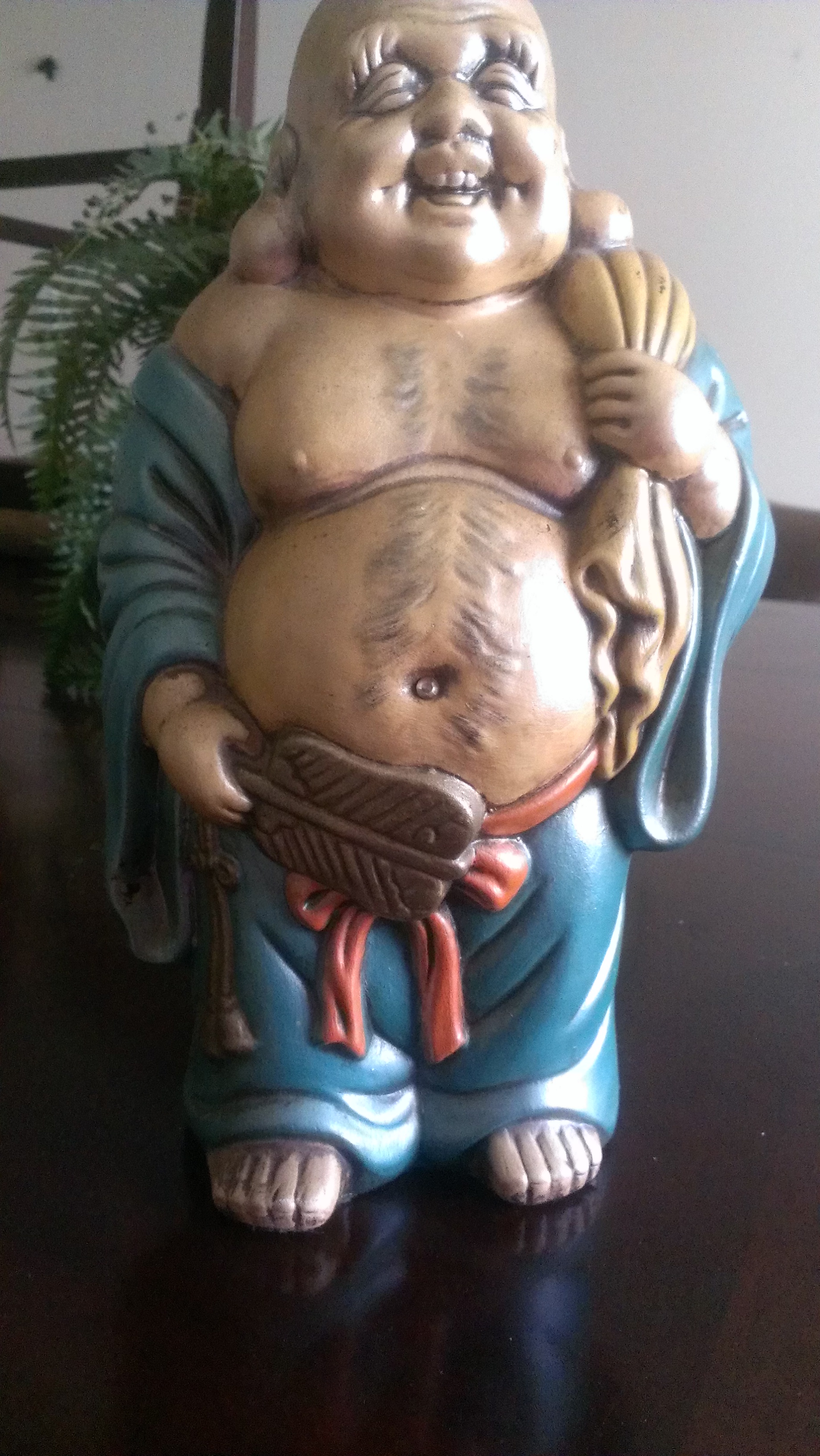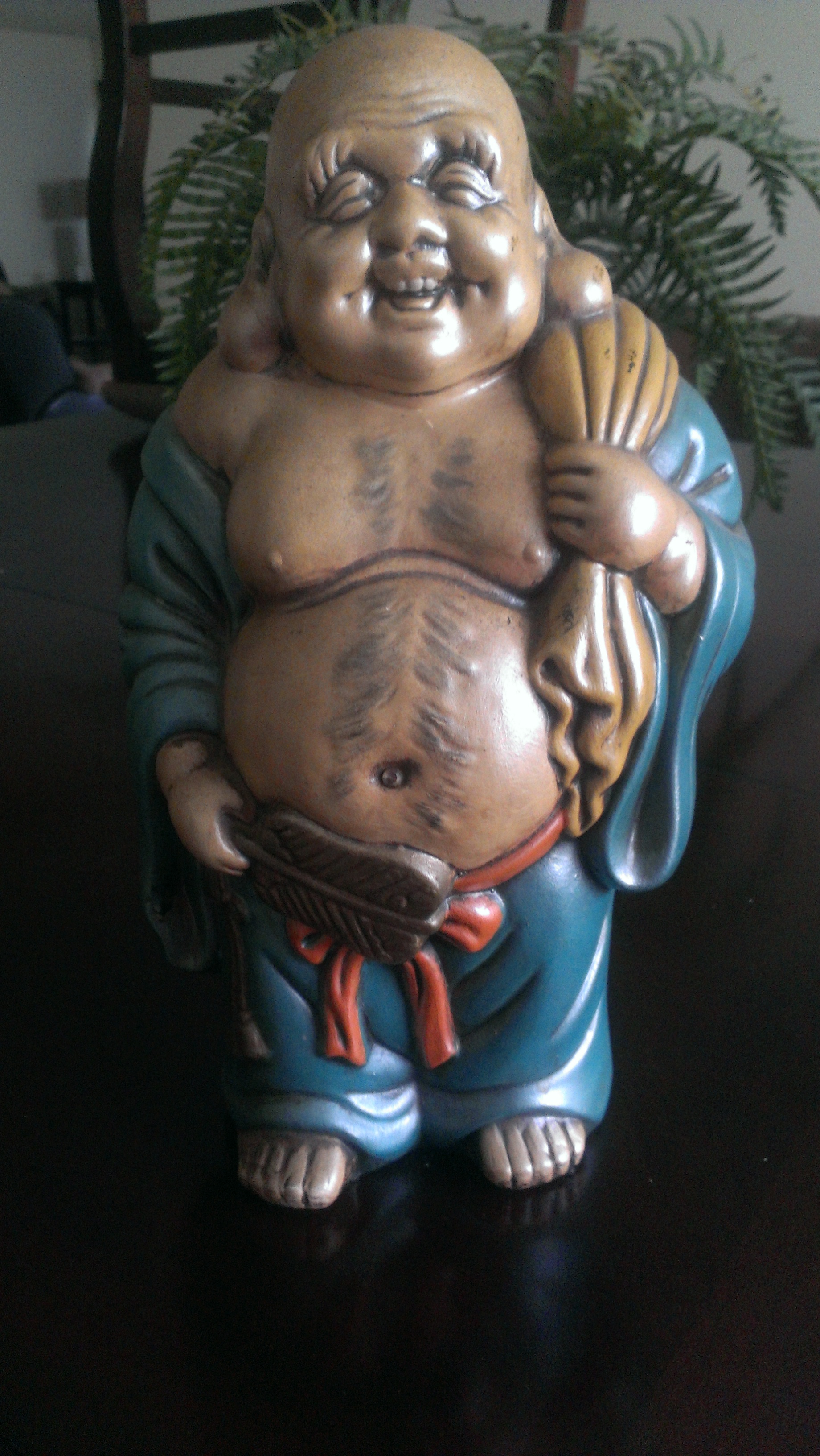 I don't know to much about the history as I was young when my great aunt had this item. My great-grandmother passed it down to me. She once told me that it was lucky and it helped her win several horse races she played. I dont know much about horse racing, but I know that it has been in my family for more than 30 years. This buddah has never loss color, it looks the same as when I was a child