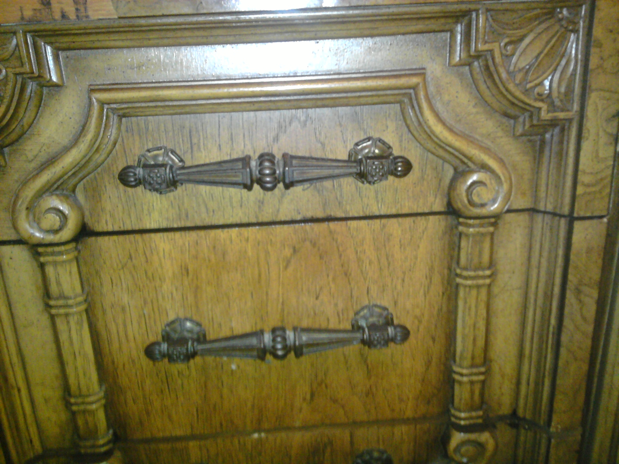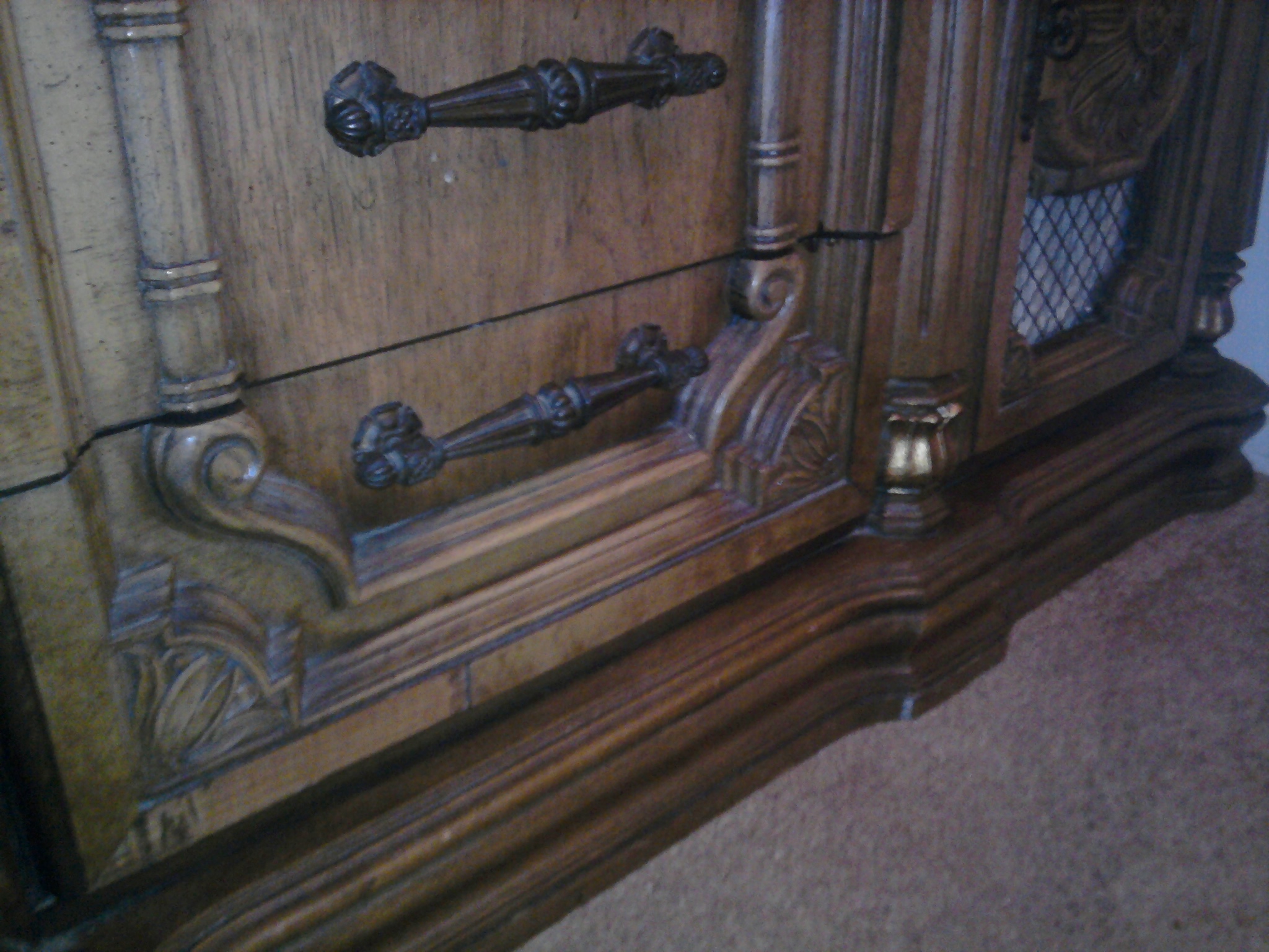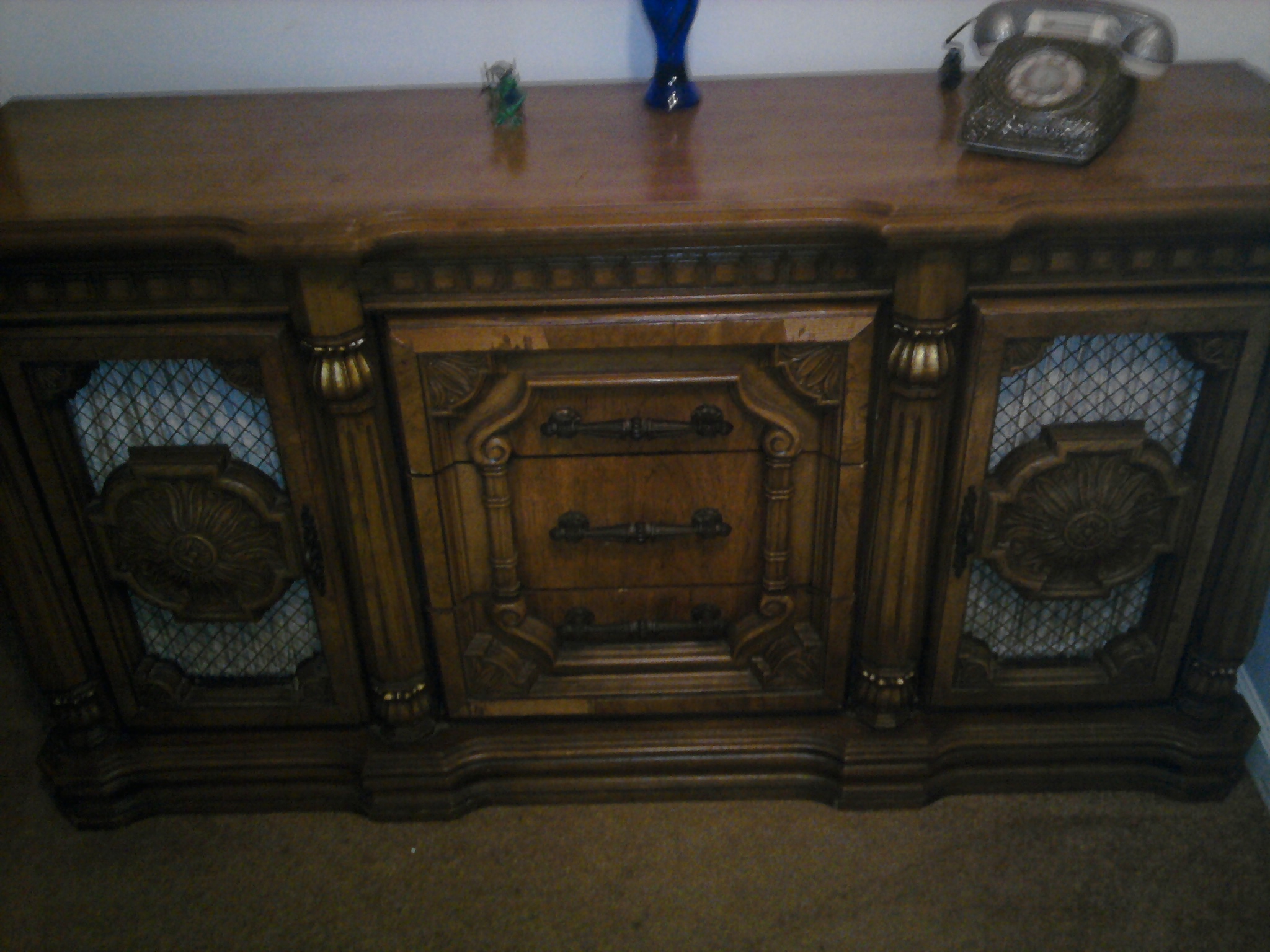 Don't know much about it other than it's been in my family since the late 1950's or early 1960's. I do have the three small wood pieces on the fron that have fallen off. A little wood glue would be an easy fix. Other than that, the buffet's in excellent condition.