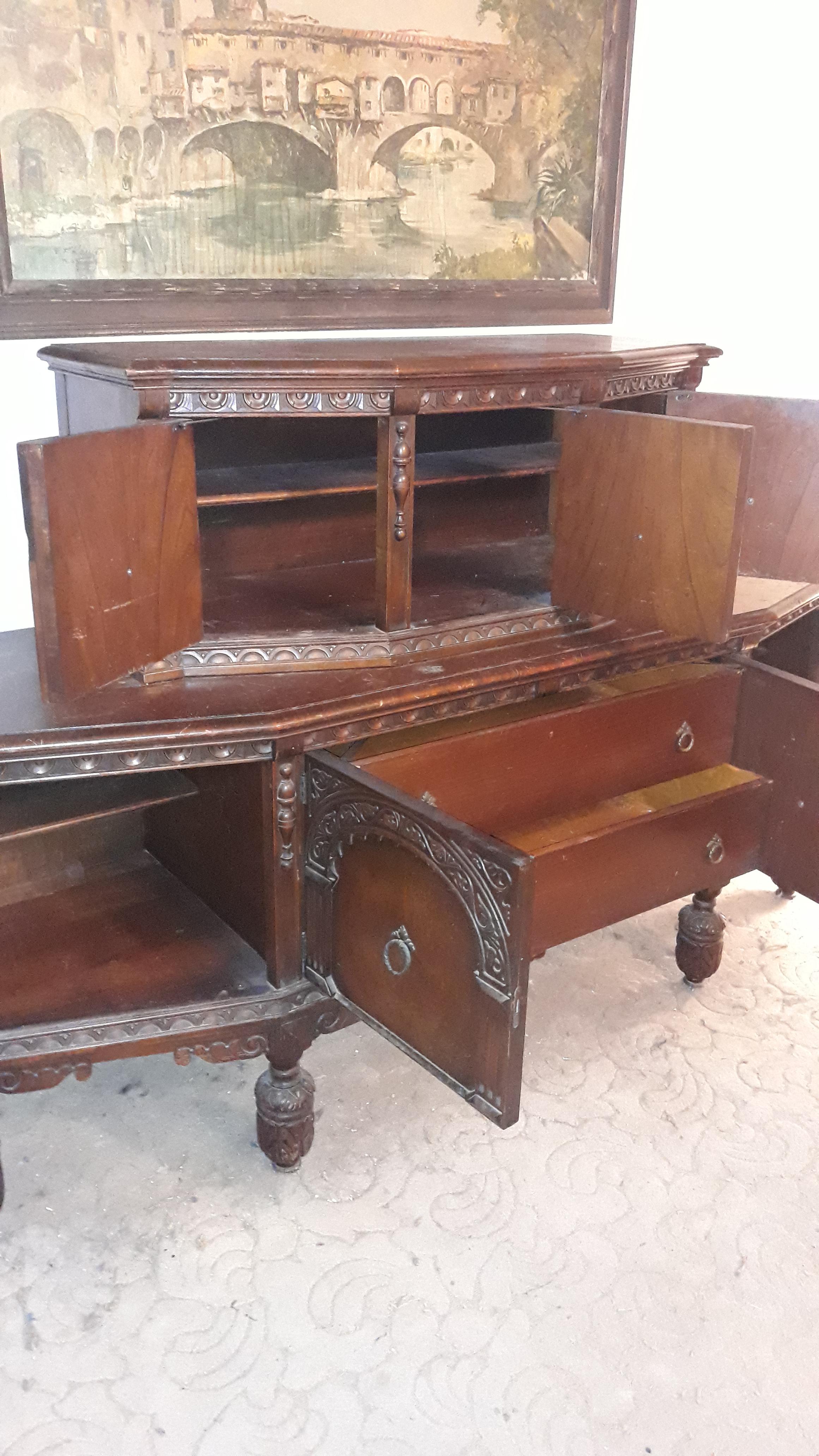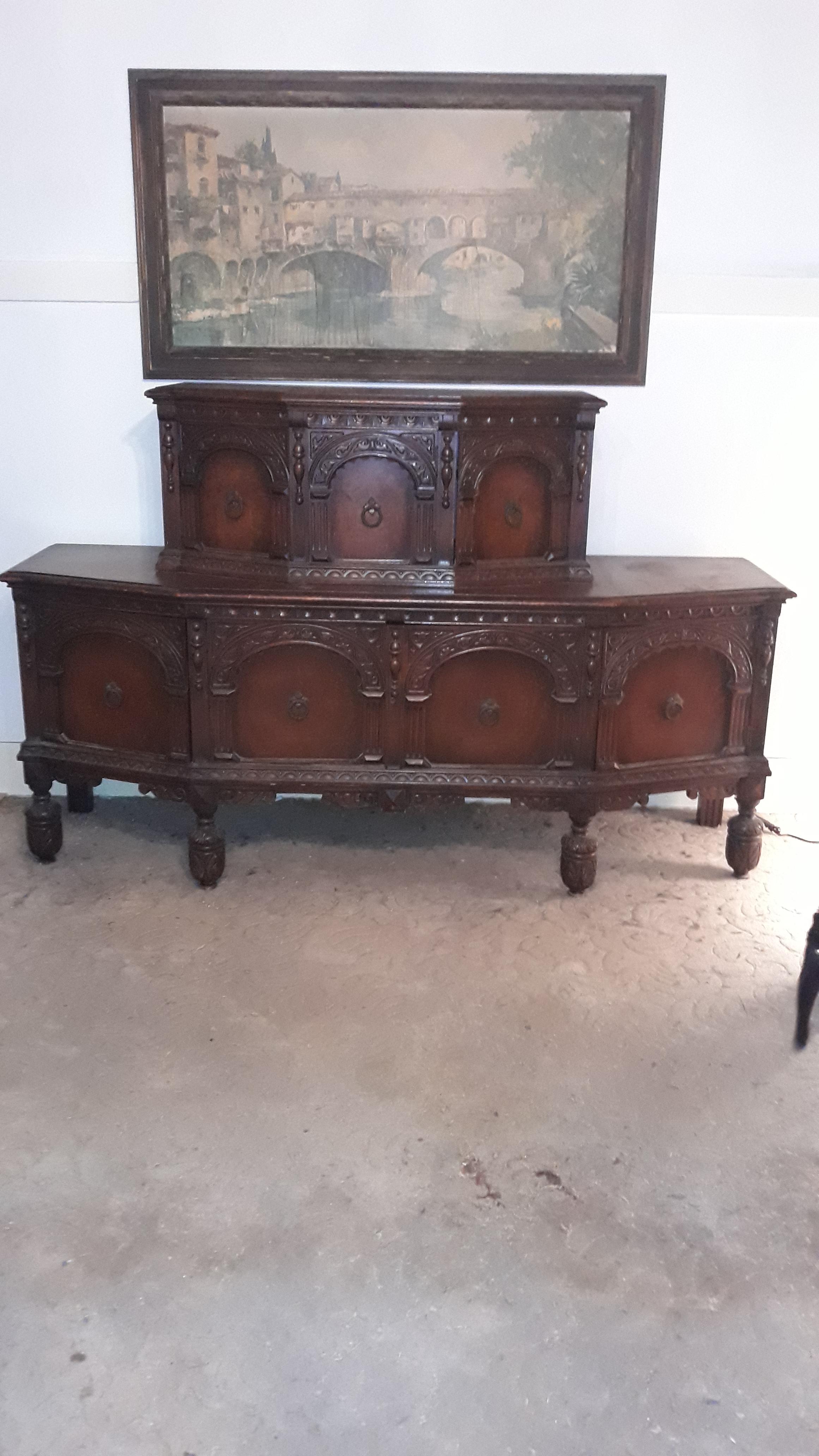 This Antique Buffet has been in my family since the 1940s but I never learned anything about it. I have tried to identify it but I haven't been successful. It is part of a dining room set of which the dining table has been described as Antique Elizabethan Jacobean style carved oak, with carved legs. The set includes the aforementioned table-a draw leaf refectory dining table, 4 carved chairs and 2 carved armchairs, all with the same carved legs, and the buffet. Any information or specifics that you can provide to me will be greatly appreciated. I can also text images to you so that they can be better visually manipulated.
