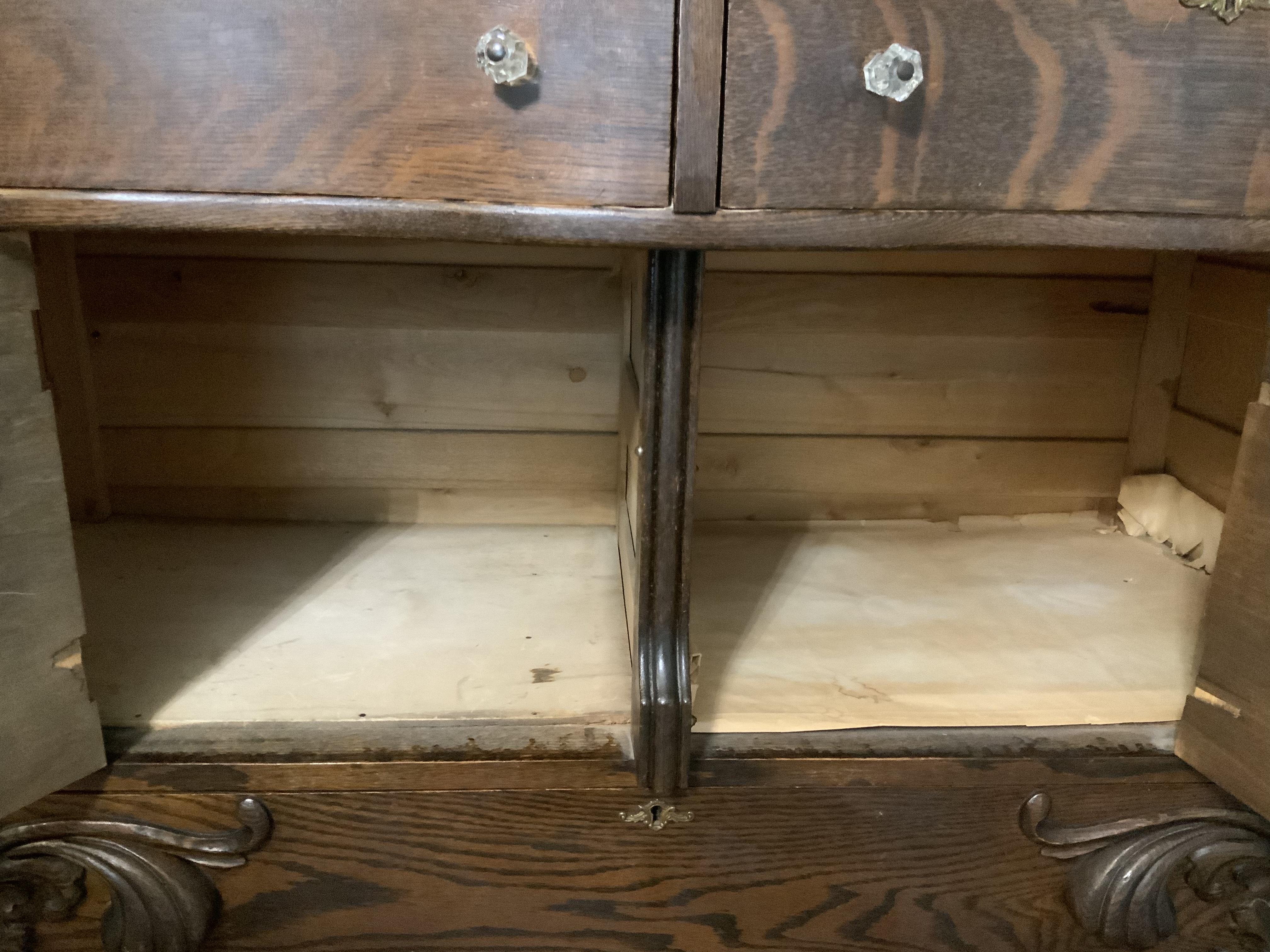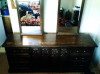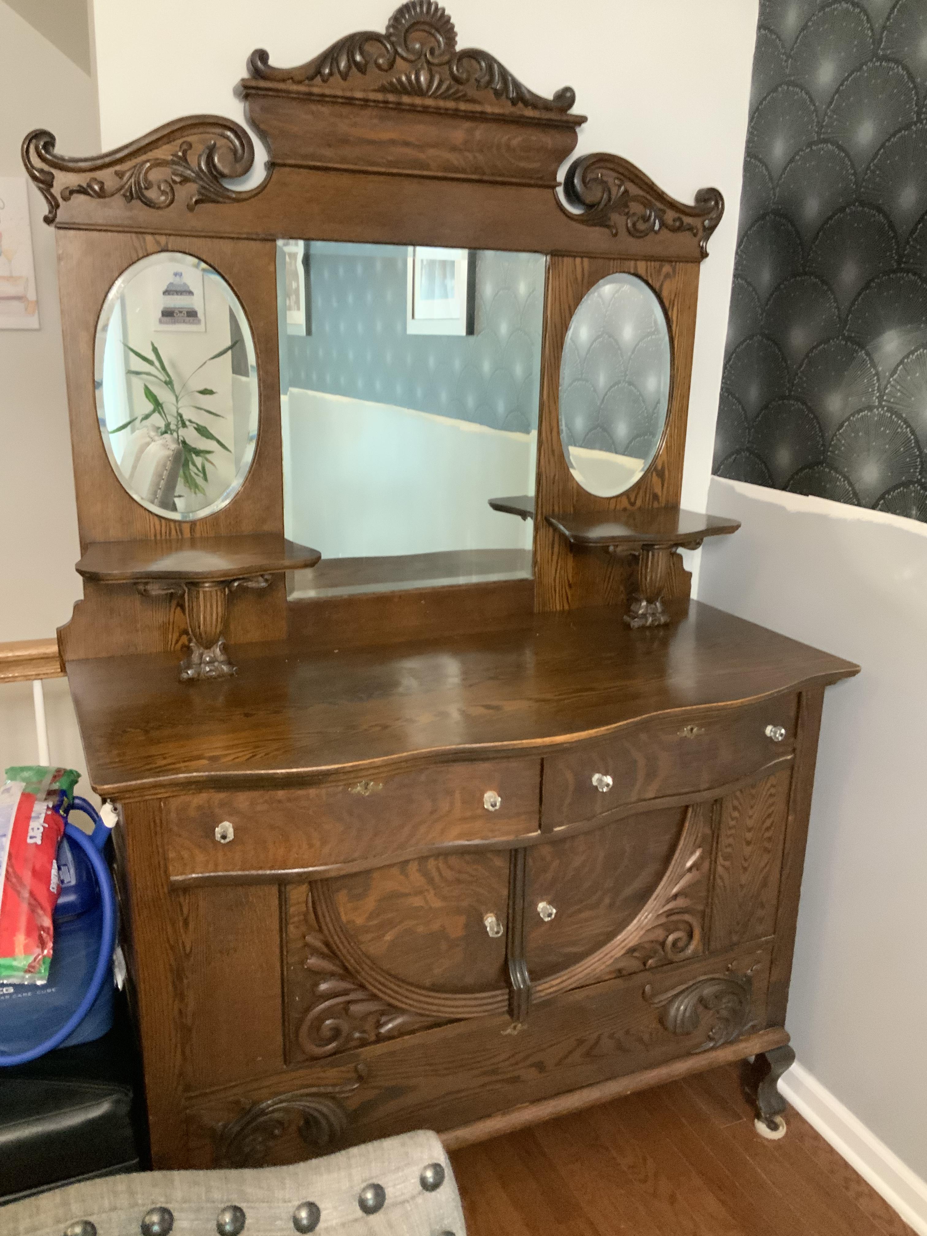 I believe this might be a late 18th century buffet with 3 mirrors. The buffet is on small wheels. Photos attached. Trying to decide what a good price would be to sale item.