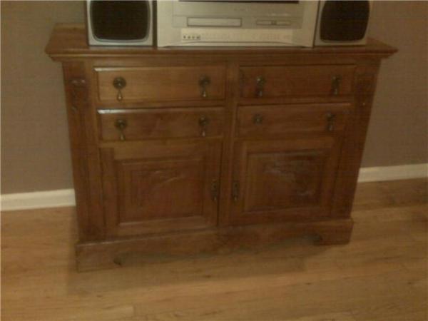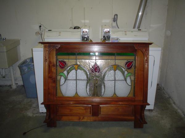 This was given to me when my parents re-did their home in modern furnishings. They bought this piece at an out-of-town antique market over 20 years ago. I never use the stained glass hutch so it's been well taken care of and stored in the basement. There is a light strip behind the stained glass so when you plug it in it lights up beautifully. As you can see, I use the buffet piece as an entertainment center. The buffet does need a little work as a tongue and groove piece is missing on the lower left side and the pull on the front drawer has been stripped (as seen here). I'm not really invested in the piece so it doesn't make sense for me to spend the time to fix these things myself if I'm just going to sell it. I want to offer it up to someone for less than it's worth that might be able to better restore it themselves and make a good home for it.