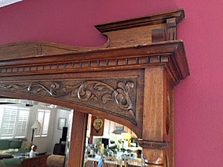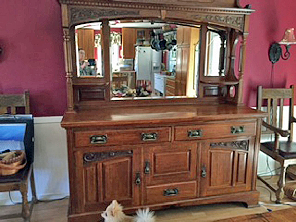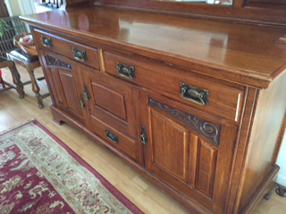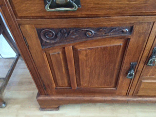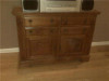 Solid Oak Buffet/Side Table. No markings of origin or country, brand names. Want to sell but have no idea what period it came from or worth. Purchased about 10 years ago. Mirror and top are removable from bottom piece. Very heavy, solid construction with dovetail drawer construction. Hardware is very light gauge brass or could be tin. Drawer and cabinet pulls look like stirrups and are heavier gauge. Nice carving detail on top and bottom. Measure 71 1/2" W; 24" Depth; 84" tall with mirrored top in place; 37 1/2" from top of lower piece to bottom.