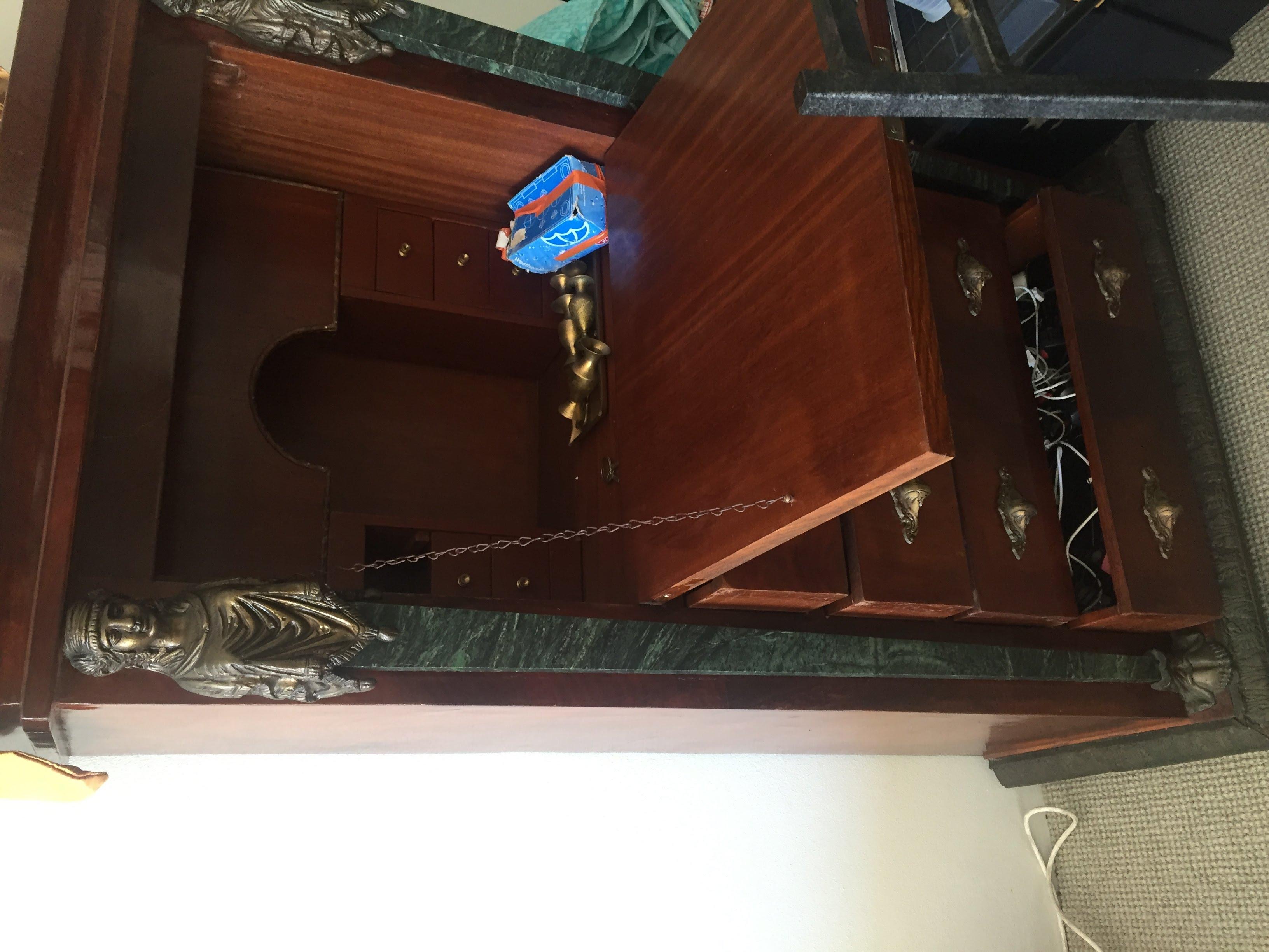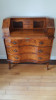 It has a drop down front with 3 little drawers on each side and at the top is a secret compartment it also has a key to lock this section.