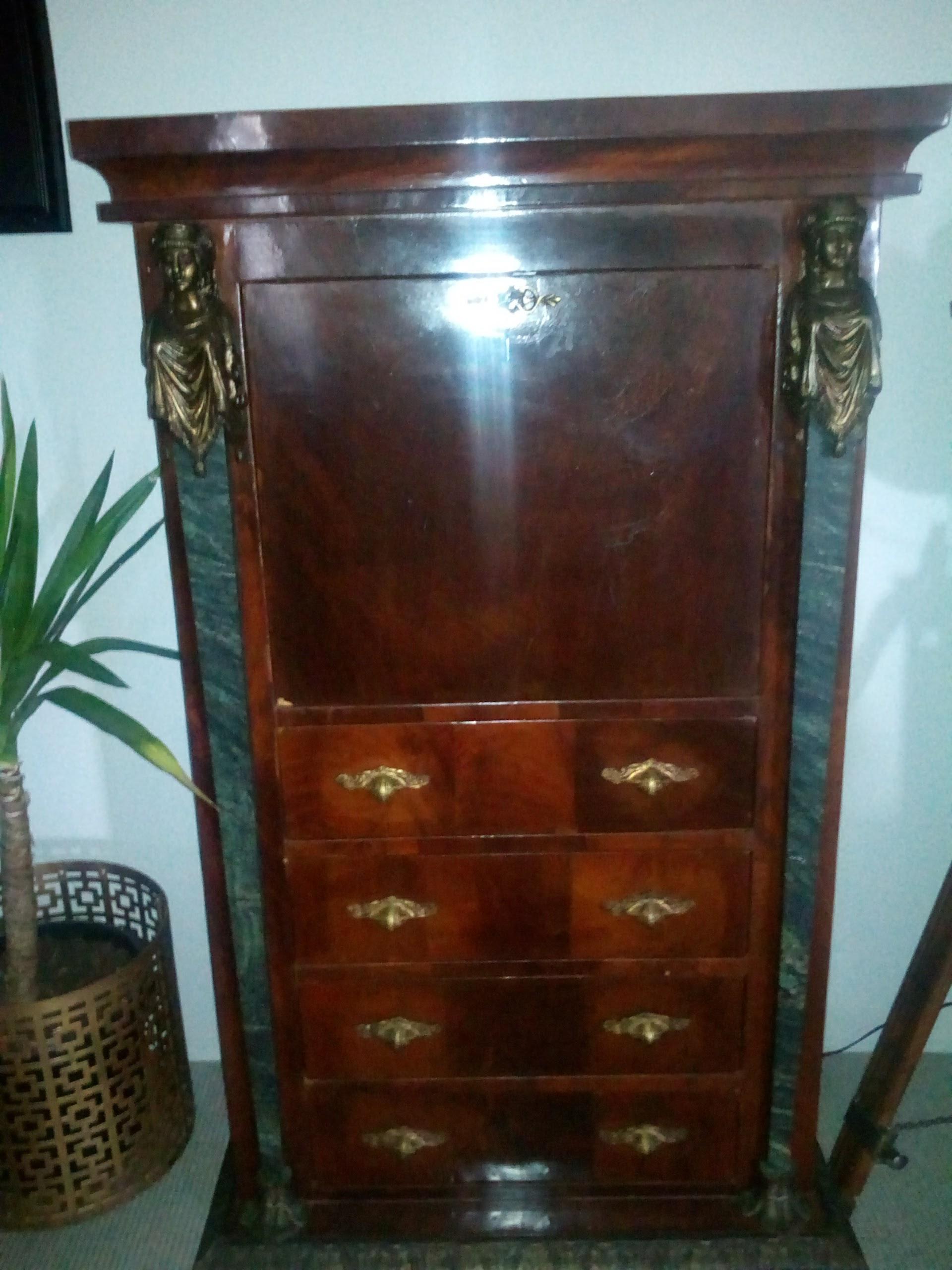 i have this amazing secretaires desk or bureau. i am not sure of its origins, the lady i bought it off stated that it was Egyptian, although it  seems maybe French or Dutch.