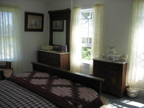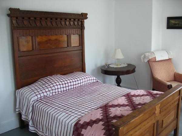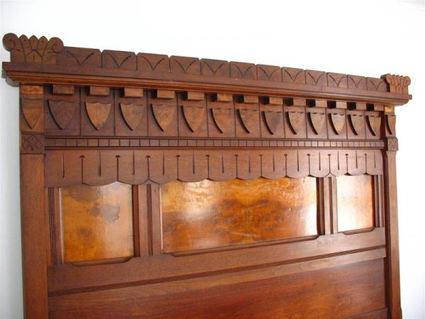 The bed is a full size, and it's a little short in length by today's standards. Parts of the headboard are made of burl wood and the rest is made of some hardwood, mahogany maybe? We call it the "captain's bed" because it was in the sea captain's room, but I don't think that has any real significance.