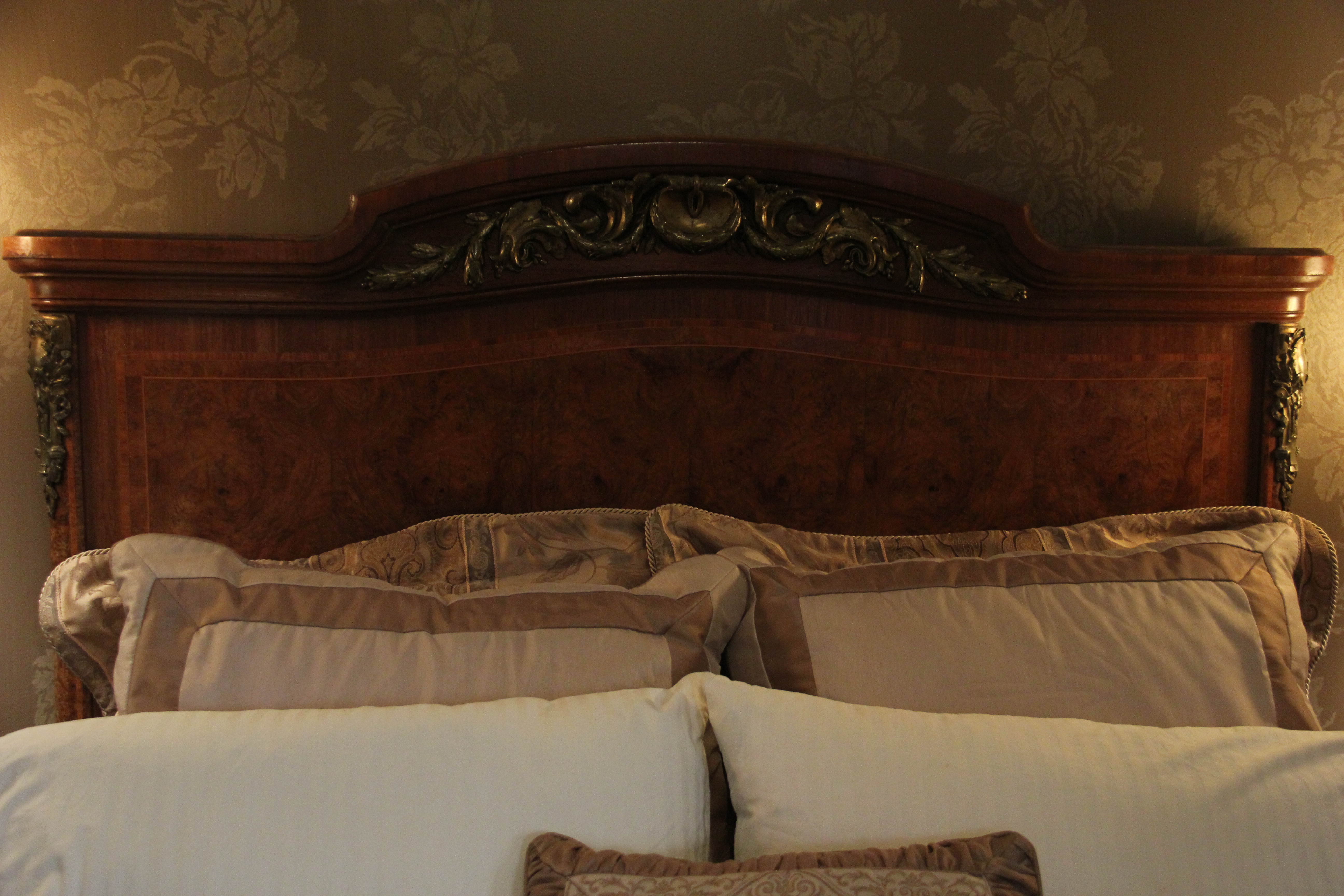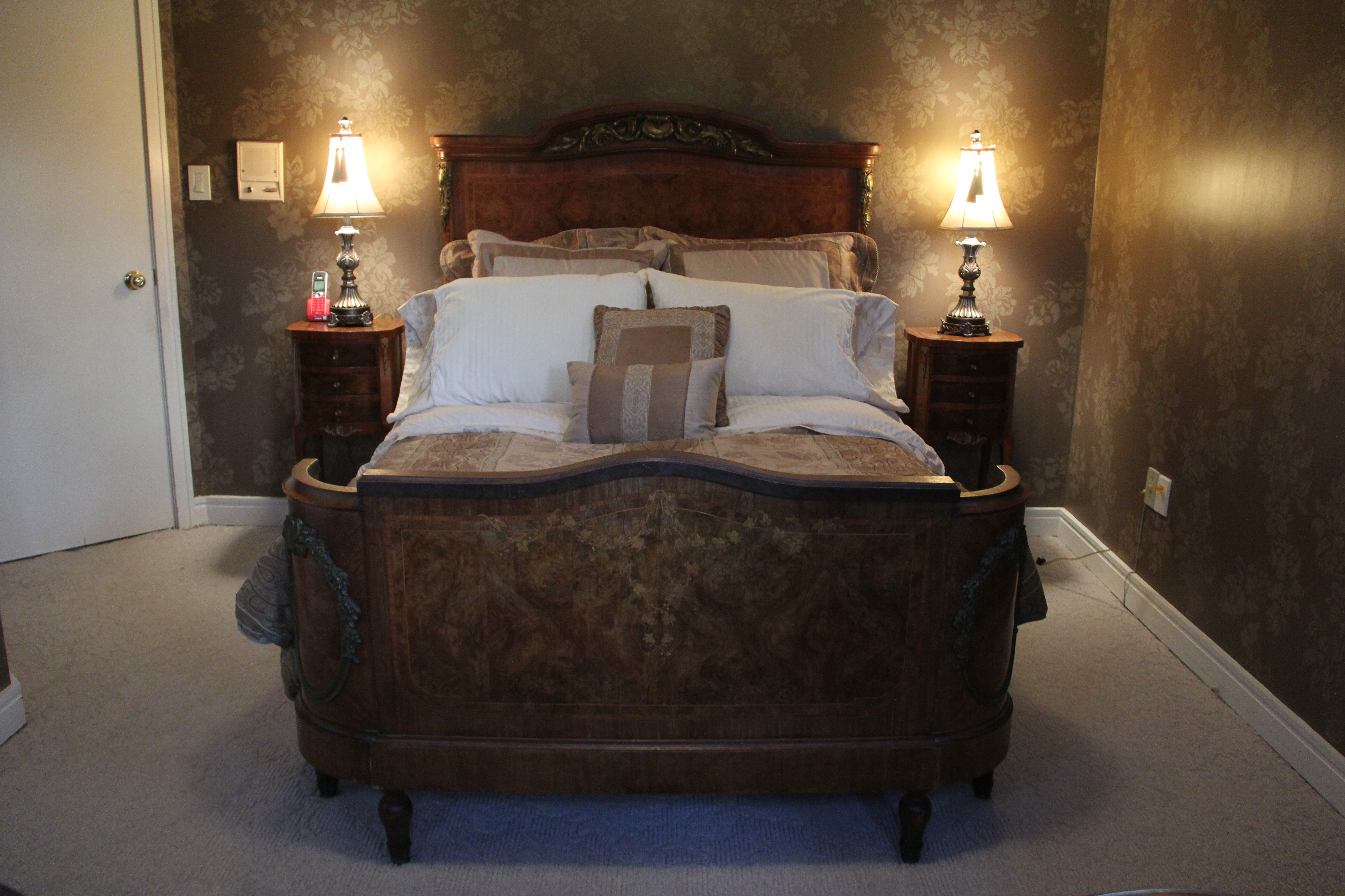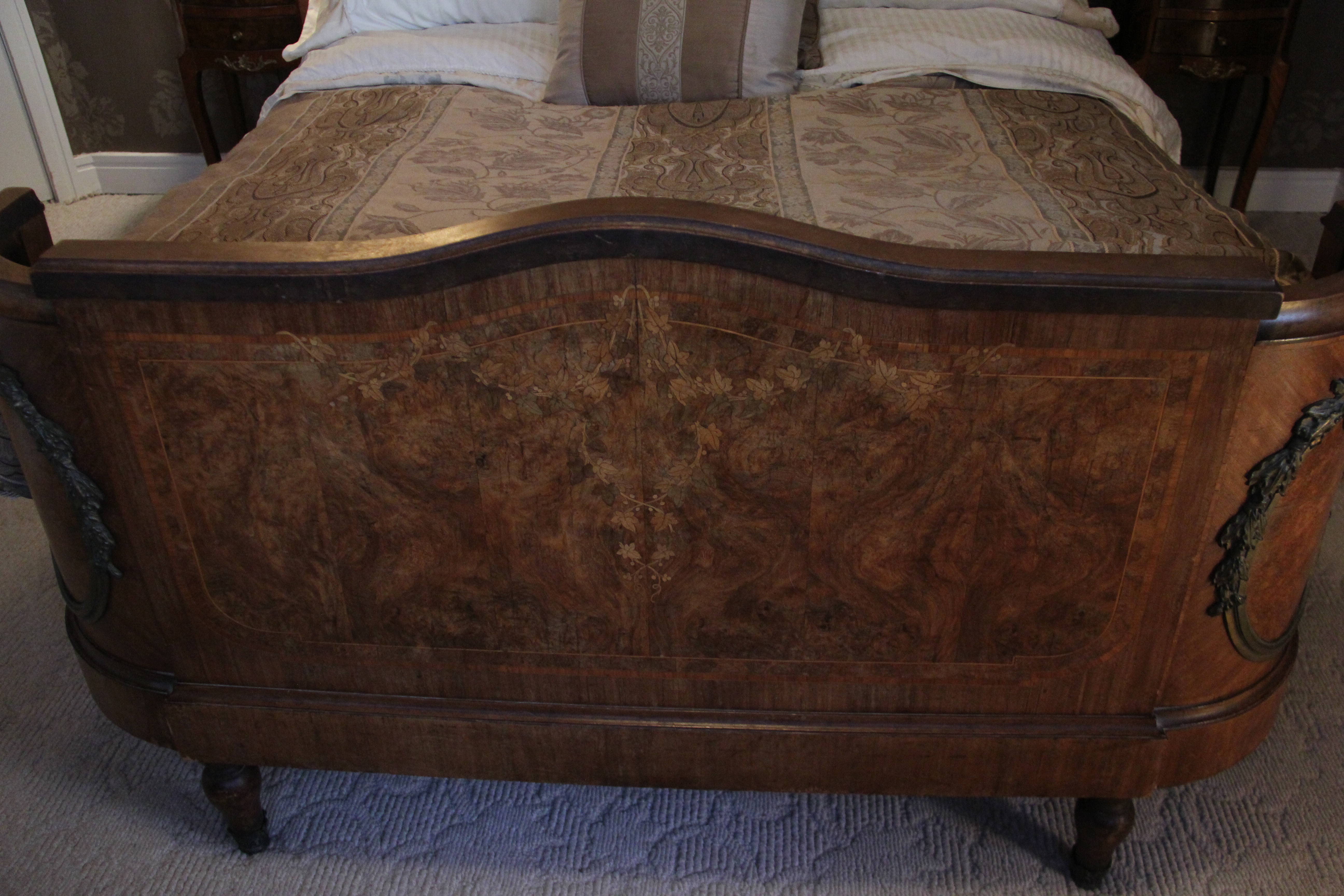 I have a ca. 1890 burled walnut veneer double bed with cross bands and bronze mounts available for purchase.  It is in immaculate condition.  There is gorgeous wood inlay in multiple warm hues. The bed is still usable, so is both functional and highly stylish.