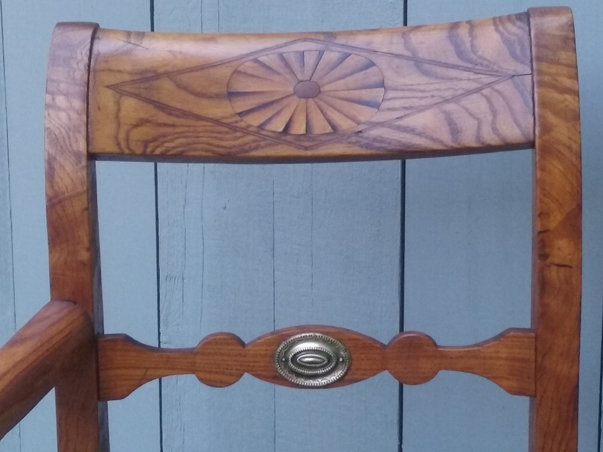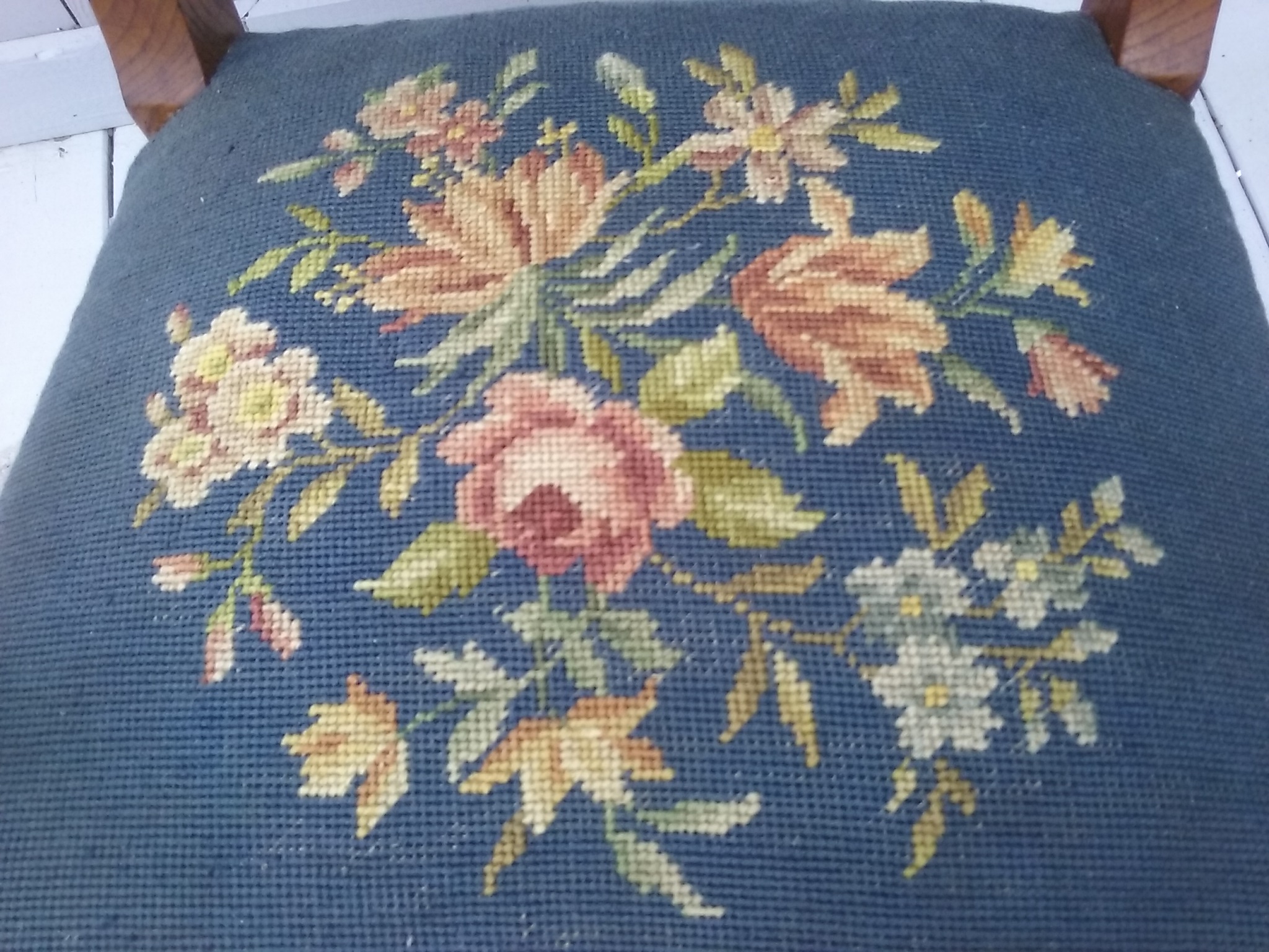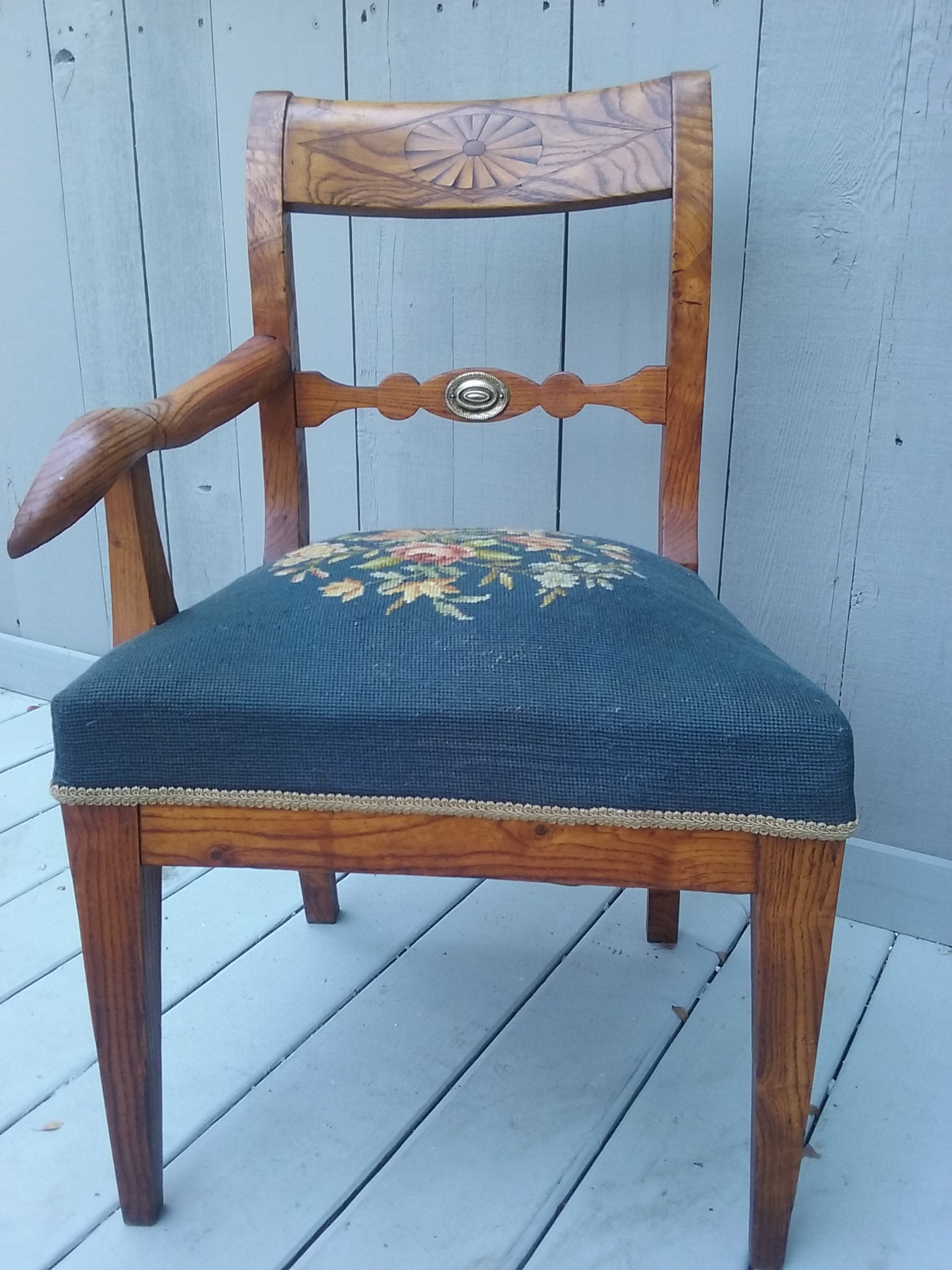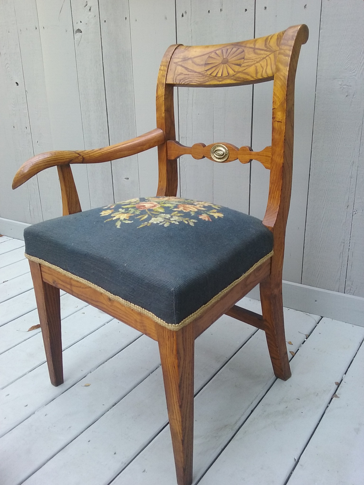 Tiger oak with a sunburst inlay and a brass medallion on the back rest. Floral needlepoint seat over horsehair cushion. Excellent condition. Back height 32.5", seat height 17".