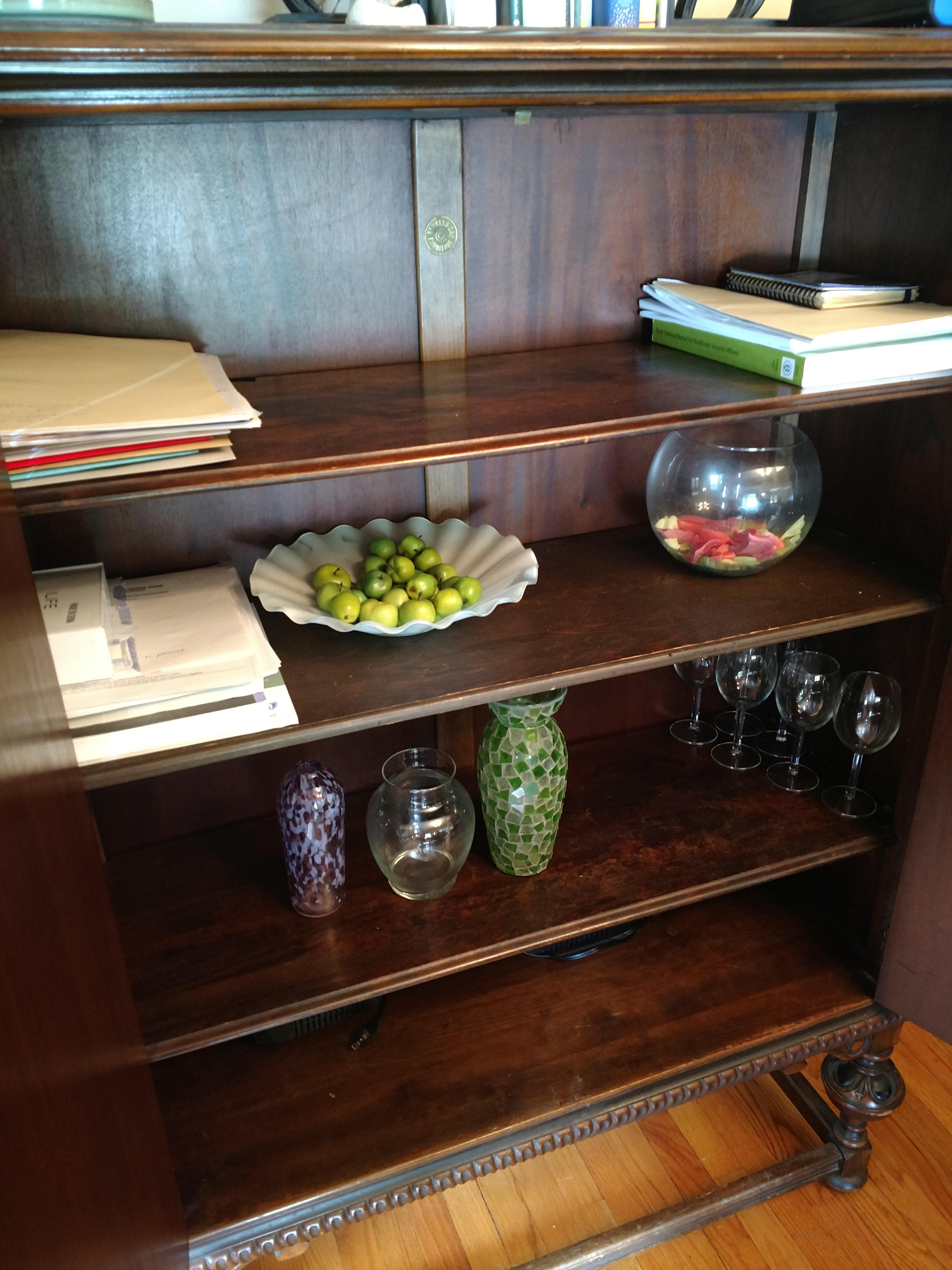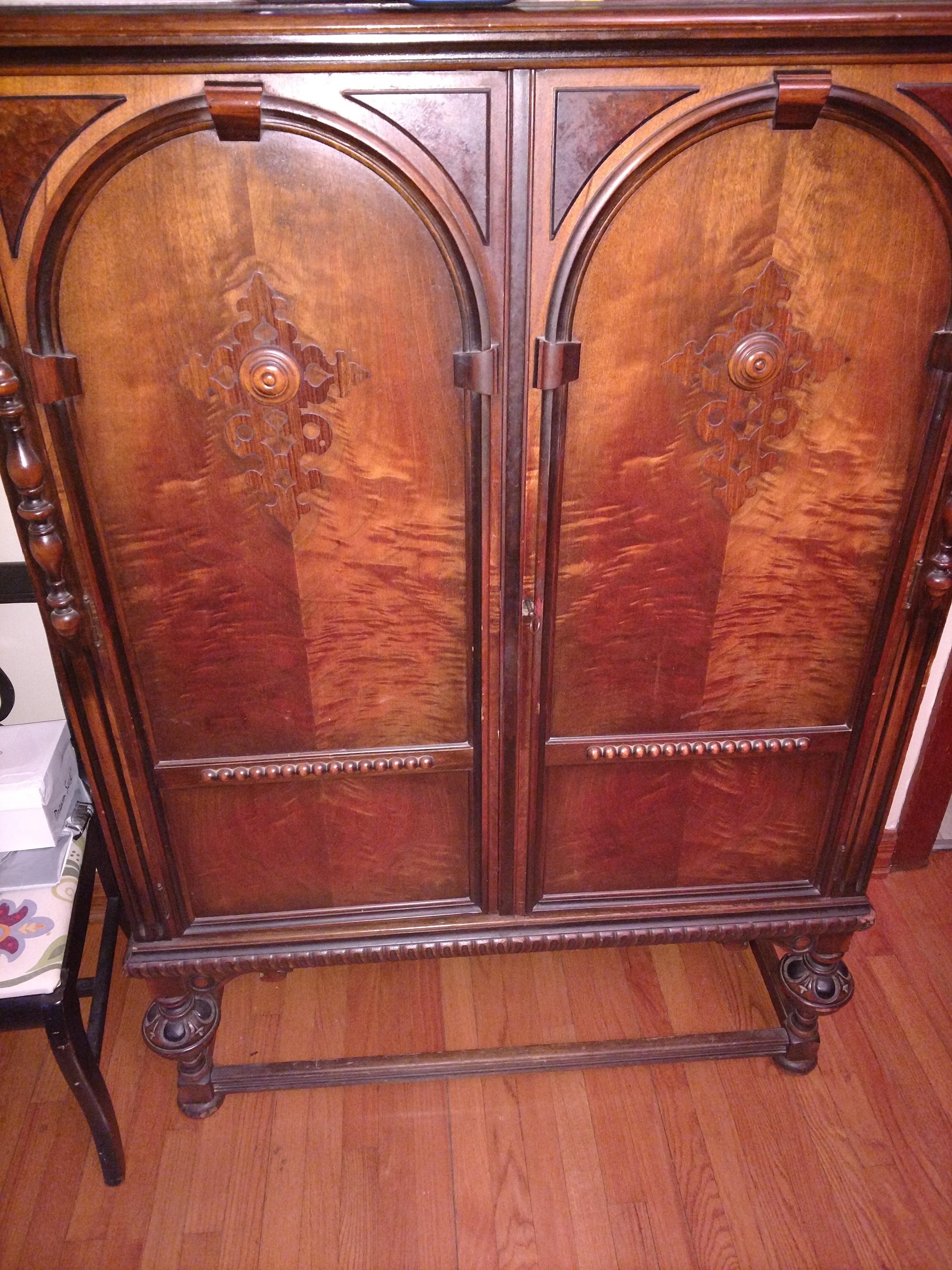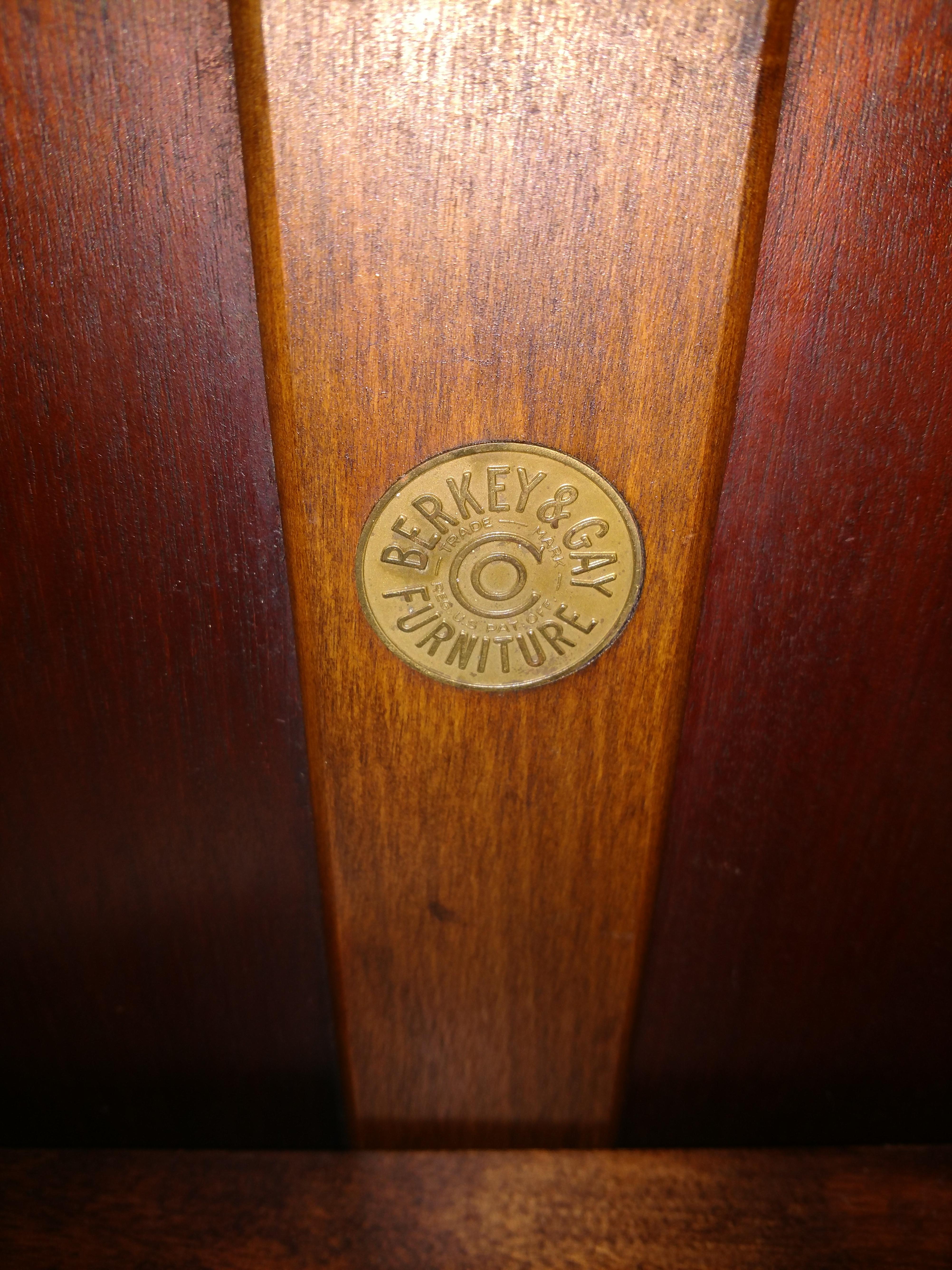 Antique Cabinet with two doors that open outward to four shelves. Inset marker of Berkey & Gay