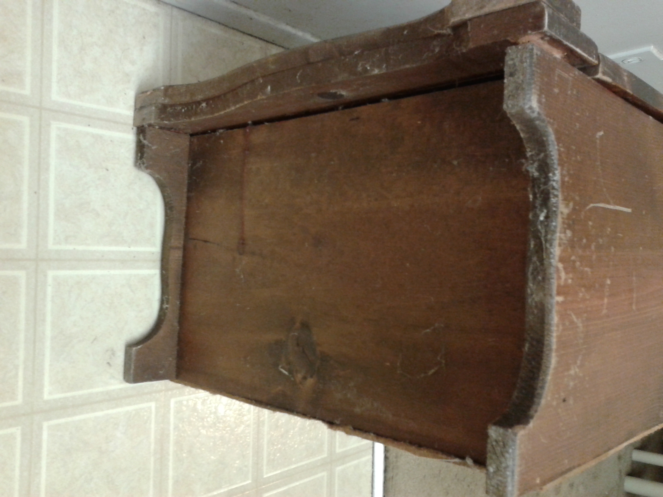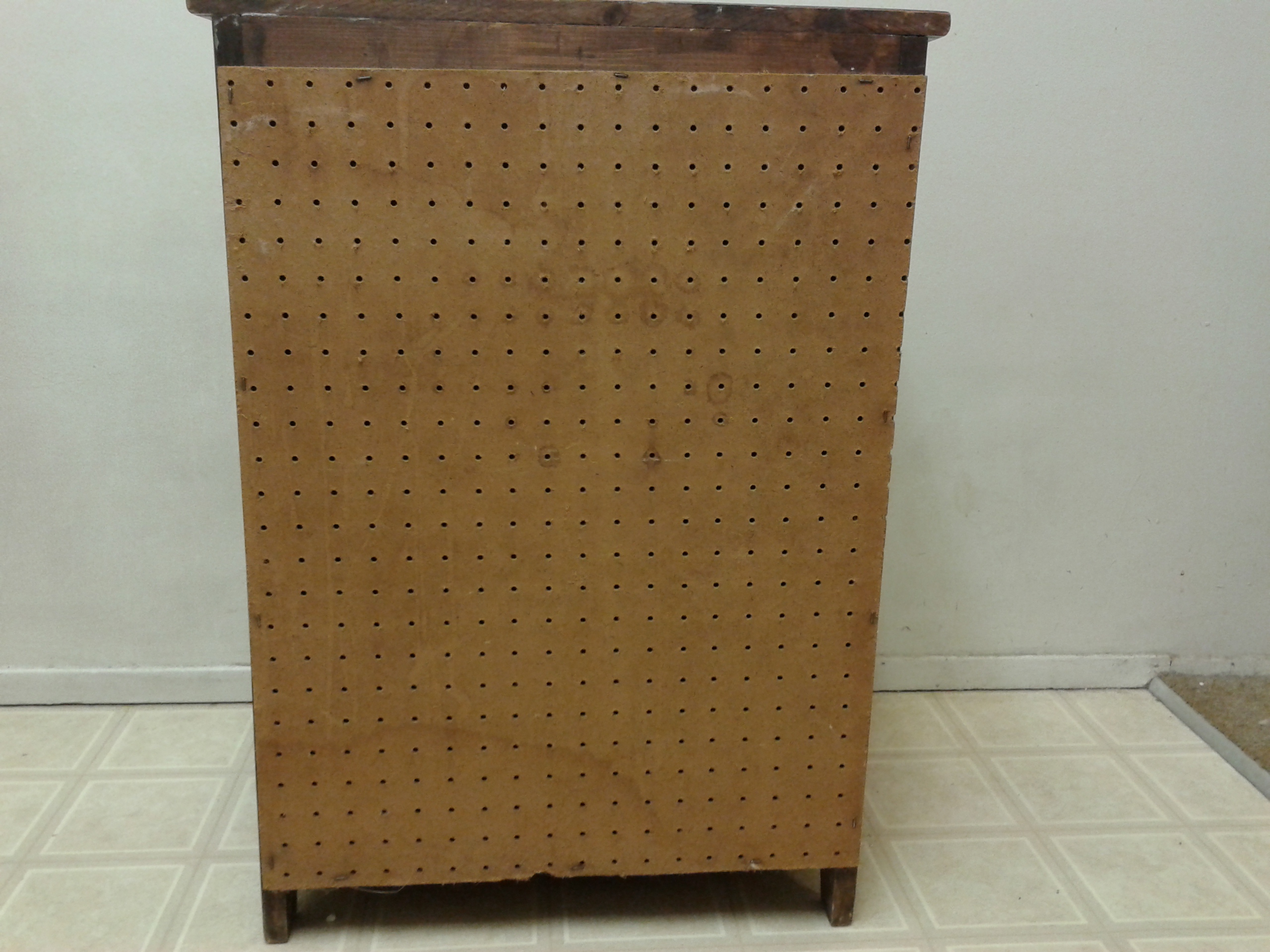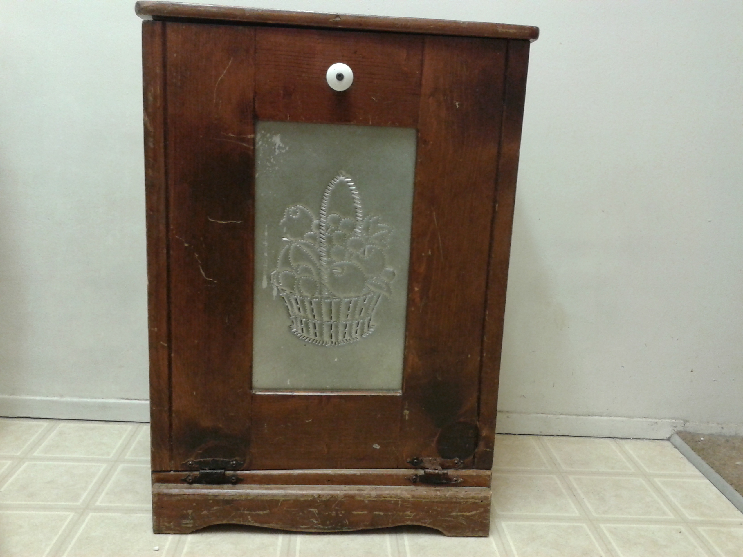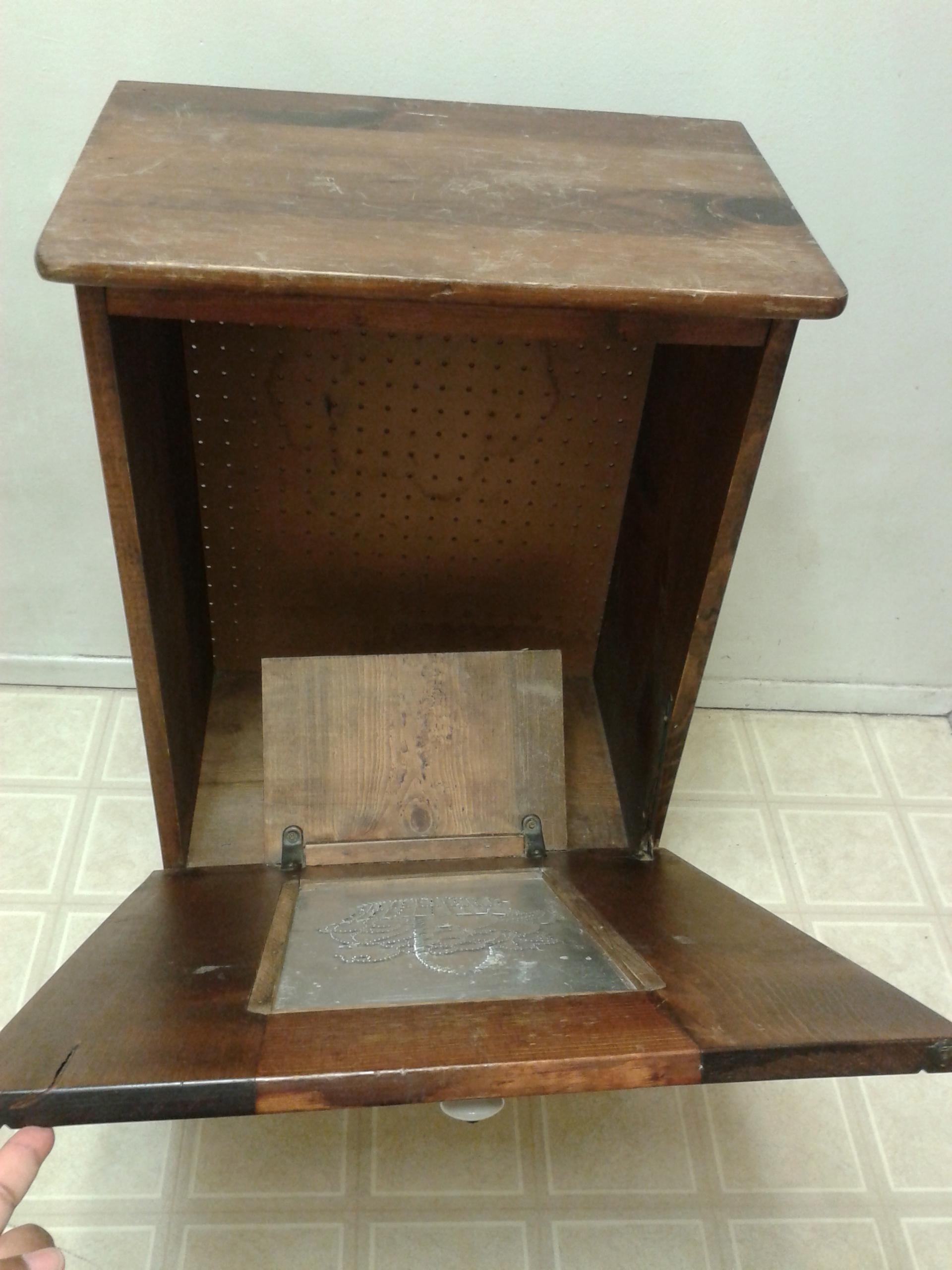 Description Solid wood. Too short to be a pie safe and never had shelves inside. 28"T x 20"W x 12.5"D. Doesn't look like it's been cut down. Sister said vegetable bin, but they'd fall out.