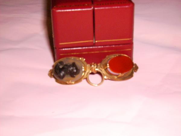 Roman or viking made of onyx and some other white stone. Gold. On back is a triple layered stone made of carnelian and some other white stone in the middle. Locket has a place for a magnifying glass or another picture. Two pictures of young boys are on each side with a glass cover on each. It was said that it was made around the 1870s, but I don't know for sure.