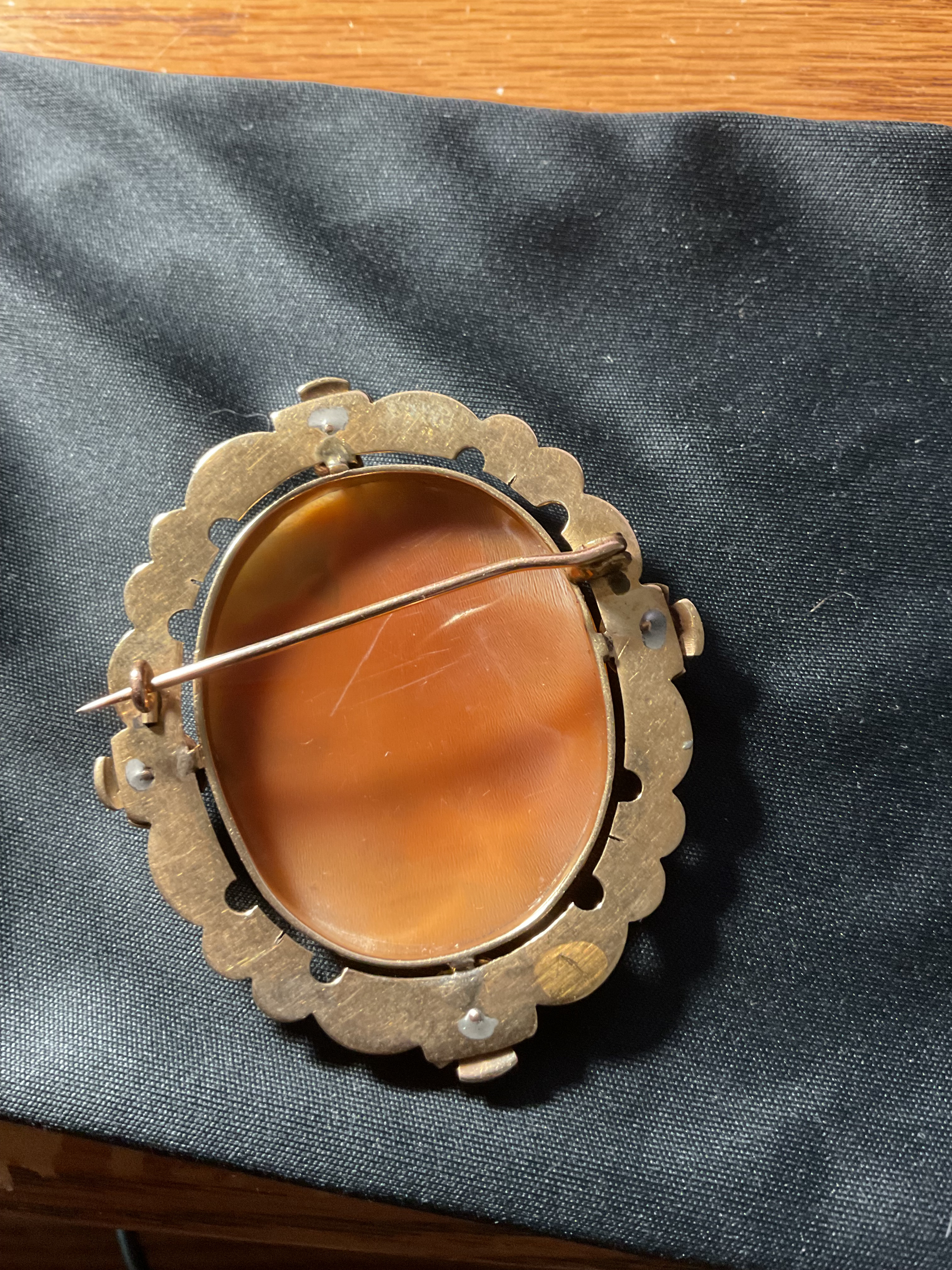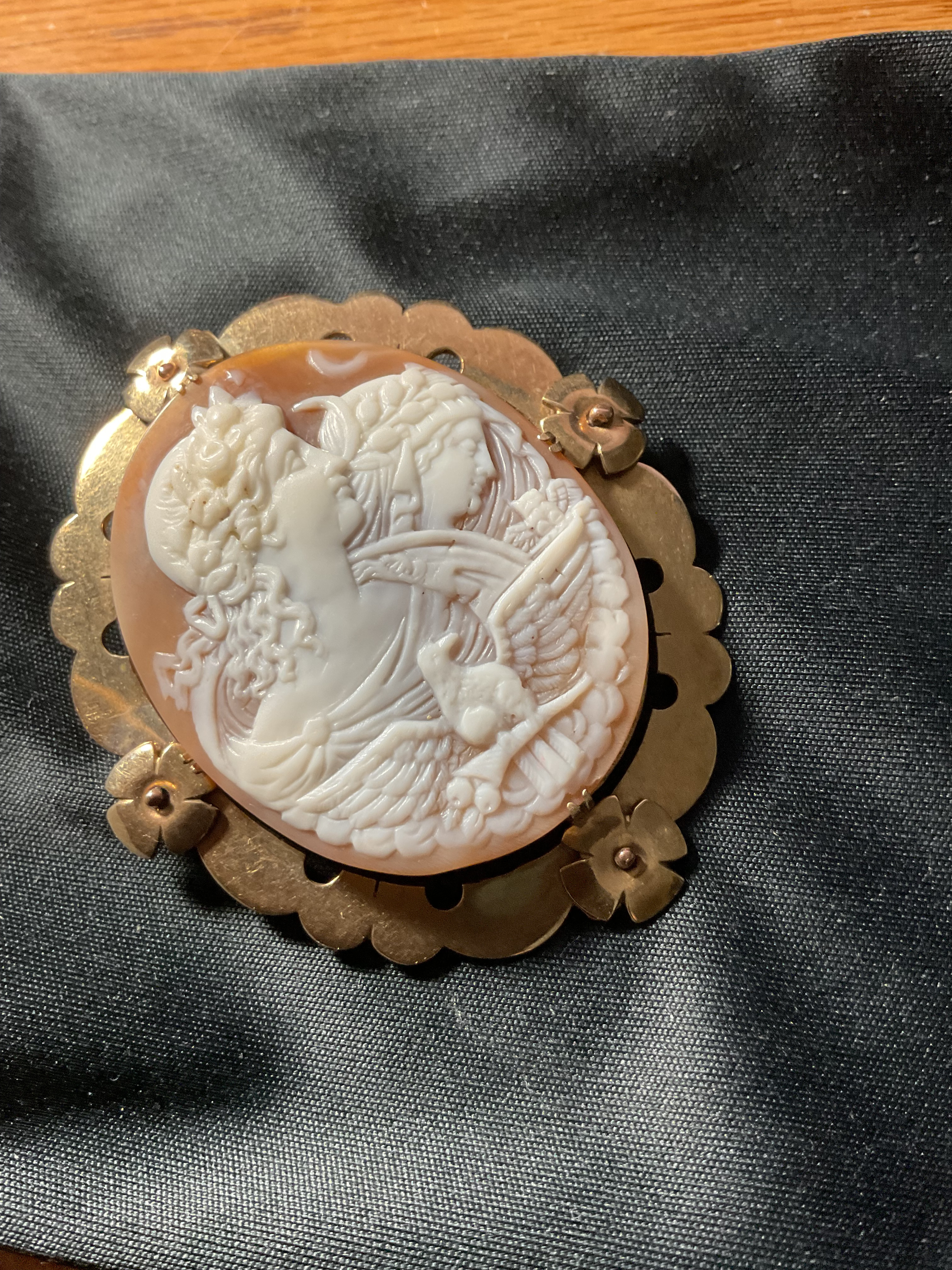 Antique Cameo Brooch. Dating to c. 1850-1900. Materials: Shell, possibly gold or gold-plated metal. Estimated value: $13 – $50. Condition: Very Good. The market for antique jewelry, particularly cameos, is currently stable with moderate demand.