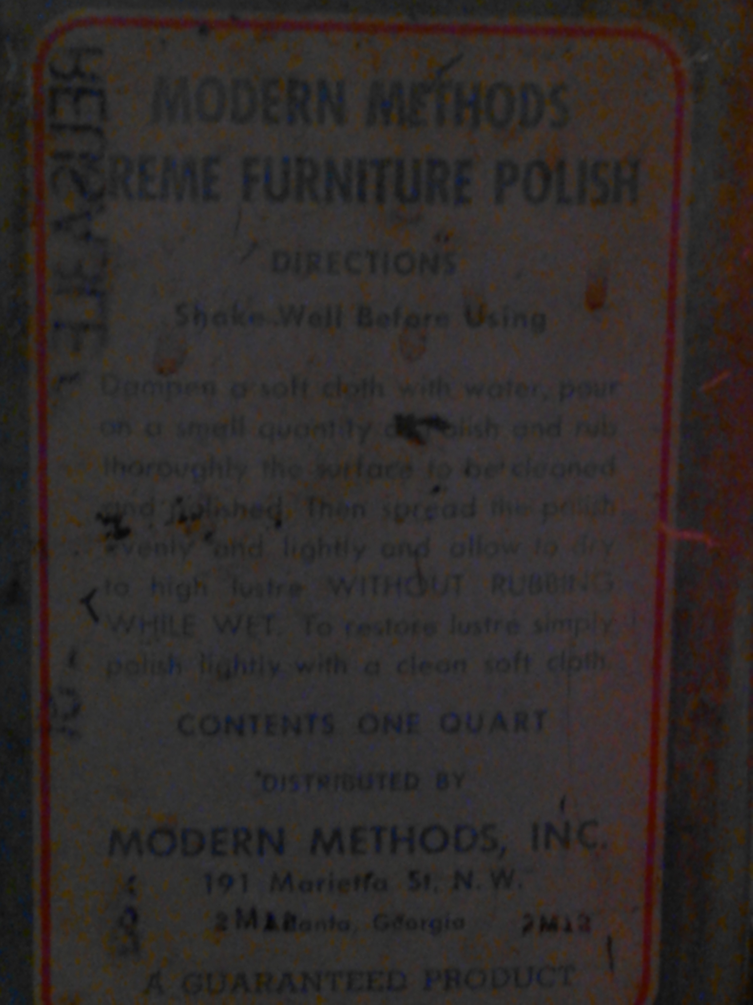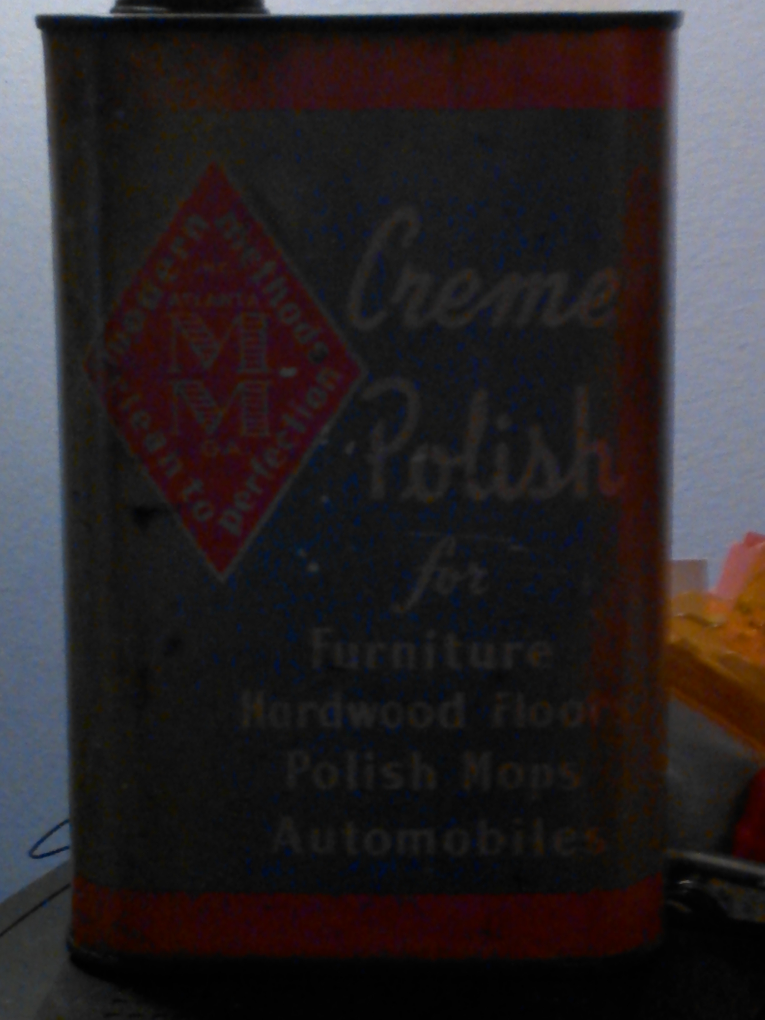 1quart full can of creme polish for furniture, hardwood floors, polish mops and automobiles. The logo says modern methods clean to perfection. Distributed by. Modern Methods Inc. 191 Marietta St. N.W. Atlanta, Ga
