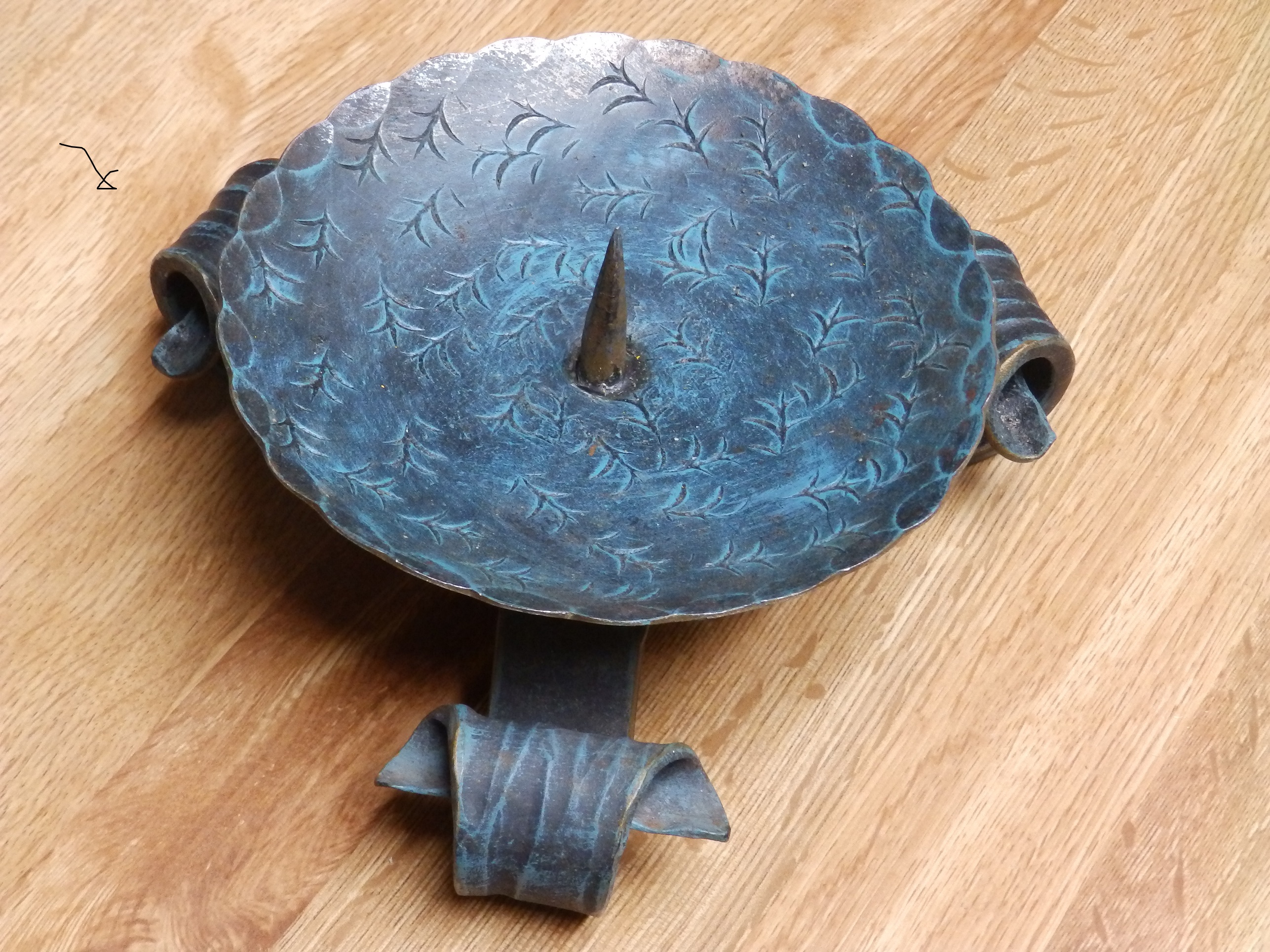 I found this candleholder at a garage sale in McMinnville, Oregon a few days ago. It looks handmade, with lots of work in the metal. It is made of steel or iron, and is very sturdy and heavy. Probably about 4 lbs. The number 7003 is stamped on the bottom. The finish/patina is unusual, it almost looks like it is painted, but if it were paint you would expect to see places where the paint is chipped or flaked off but I don't see that. It looks like it may be brass or copper plated - the blue/green color looks like oxidized copper. The candle stick spike is one of the few places where the finish is not bluish, it is more brass colored there, with a few steel spots showing through. The edges of the legs show the brass color as well. There are still remnants of wax around the candle spike.