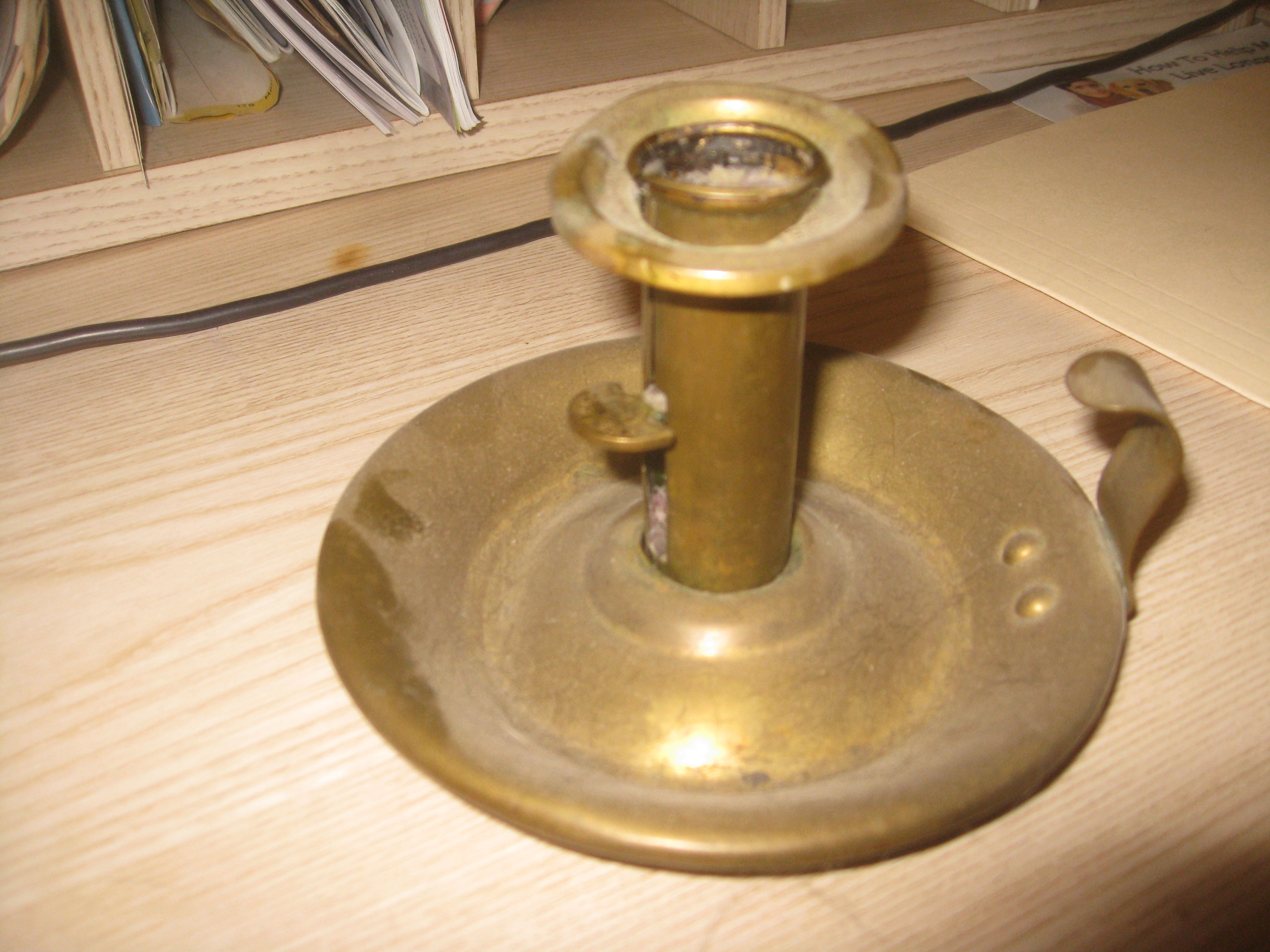 Brass candle holder. Has a lever on it that says "patented in 1853"