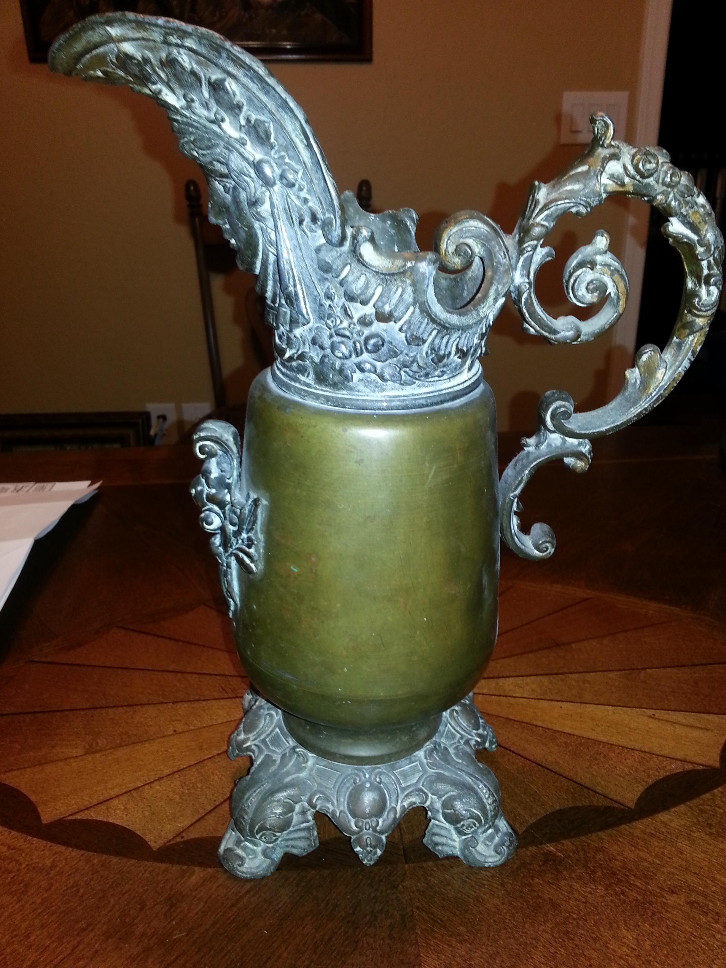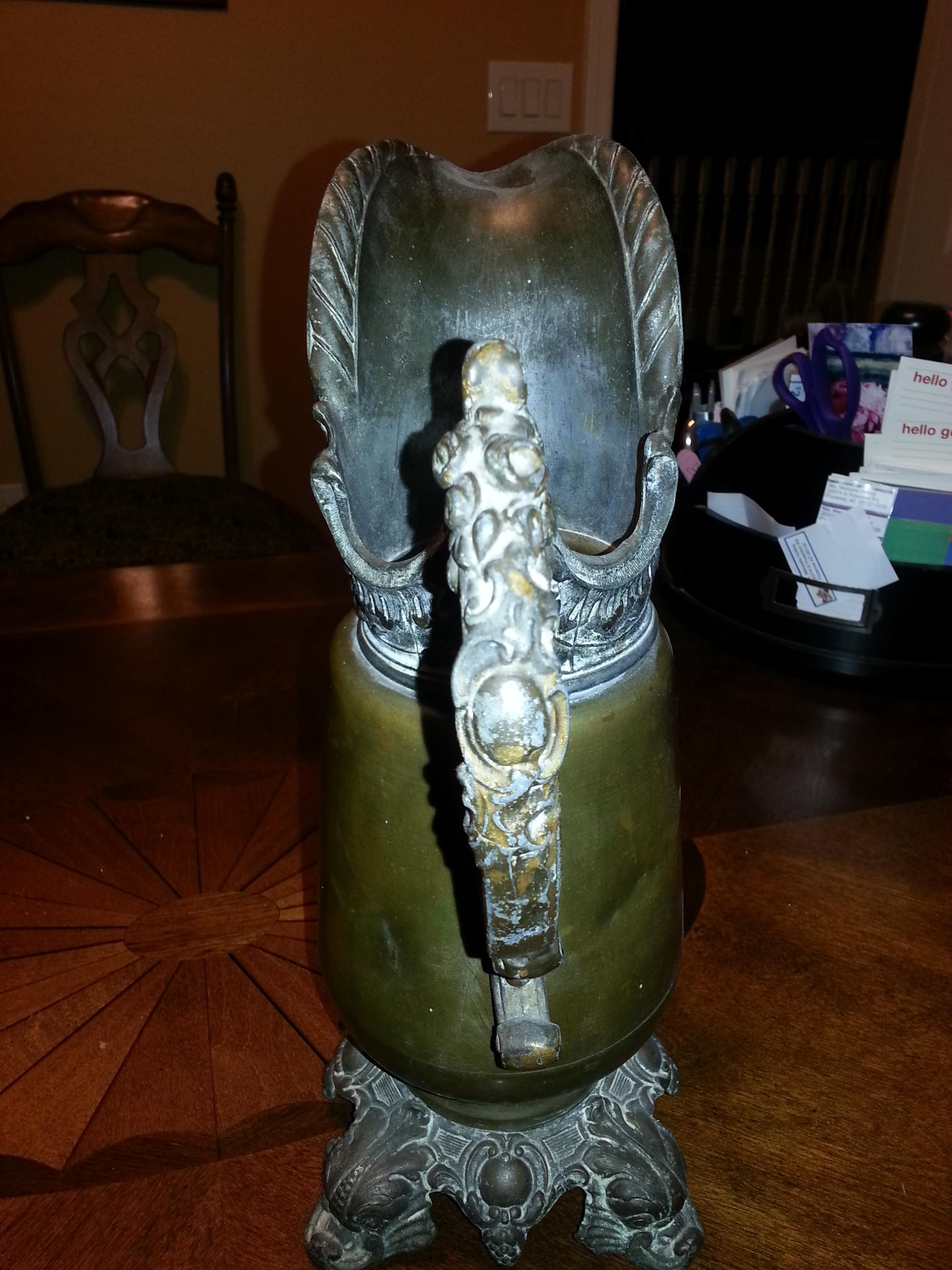 ewer is a vase-shaped pitcher, often decorated, with a base and a flaring spout, though the word is now unusual in informal English describing ordinary domestic vessels I think this is what you have.. VICTORIAN URNS EWERS greek god
