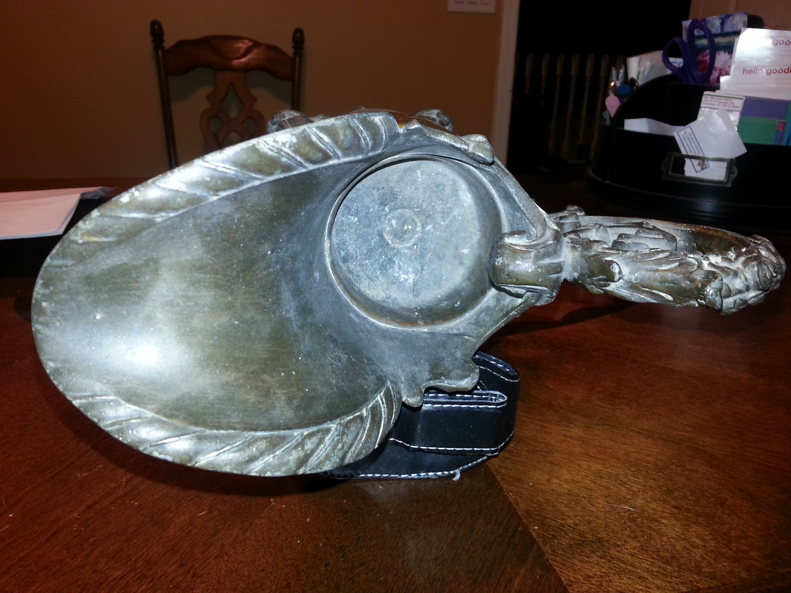 This antique was handed down from my great grandmother (believed to be owned by great-great grandmother). I remember it sitting under an old lamp when I was a little kid. It appears to be dated back to the 1800's. My first thought is that it was a candle or incent holder. I believe the materials used are solid brass and iron. The fine details at the top are of a person's face with a headdress. A deeper look appears to be an Indian headdress and below in the middle is of some sort of wildcat with its mouth open. The feet have eyes on each side and appear to be a mask. And it is both riveted and welded together. It weighs approximately 25 pounds (no scale to verify). It is 14 inches tall and 10 inches wide (including handle). Everything is original and has not been altered in any way. I have yet to find anything similar to this piece.