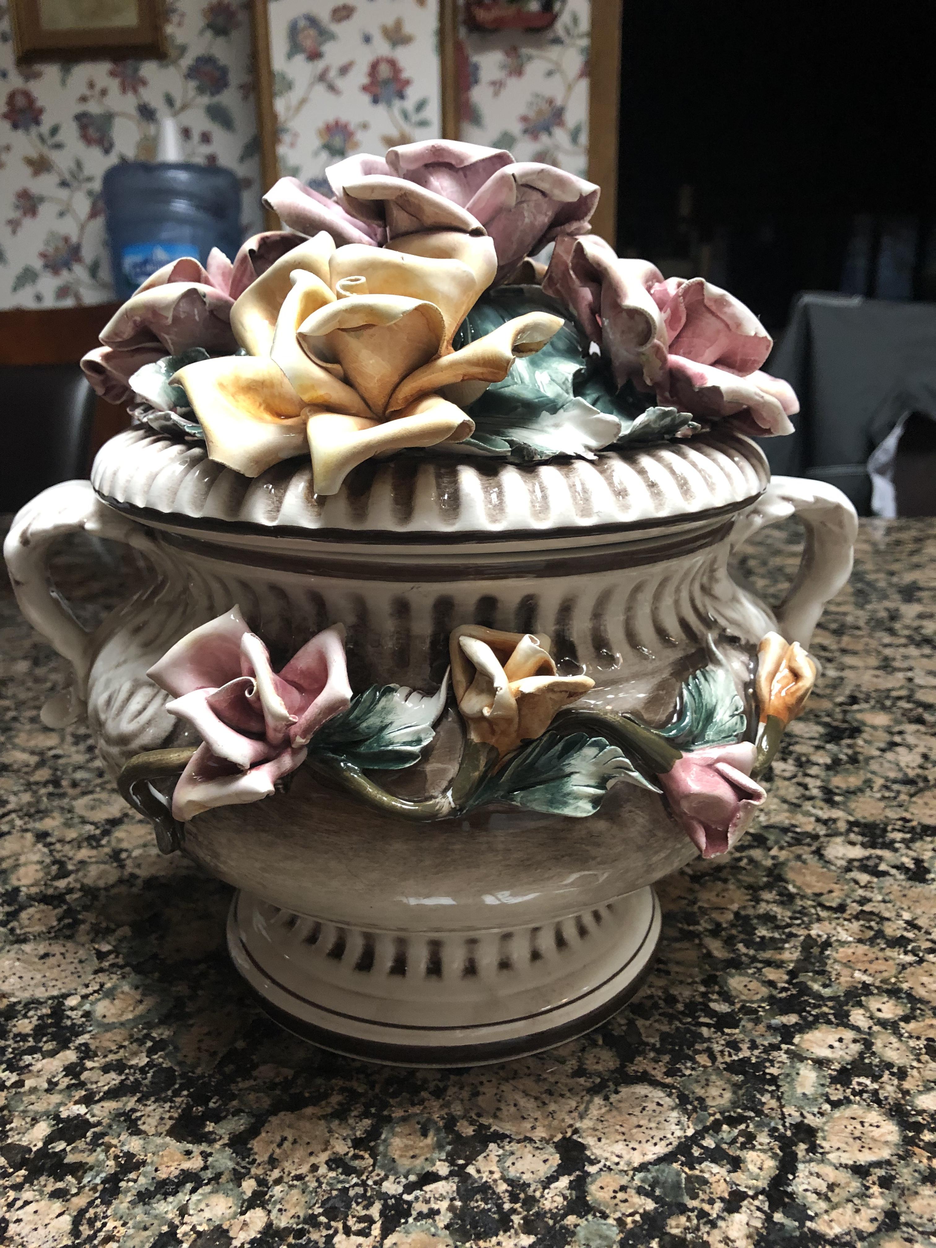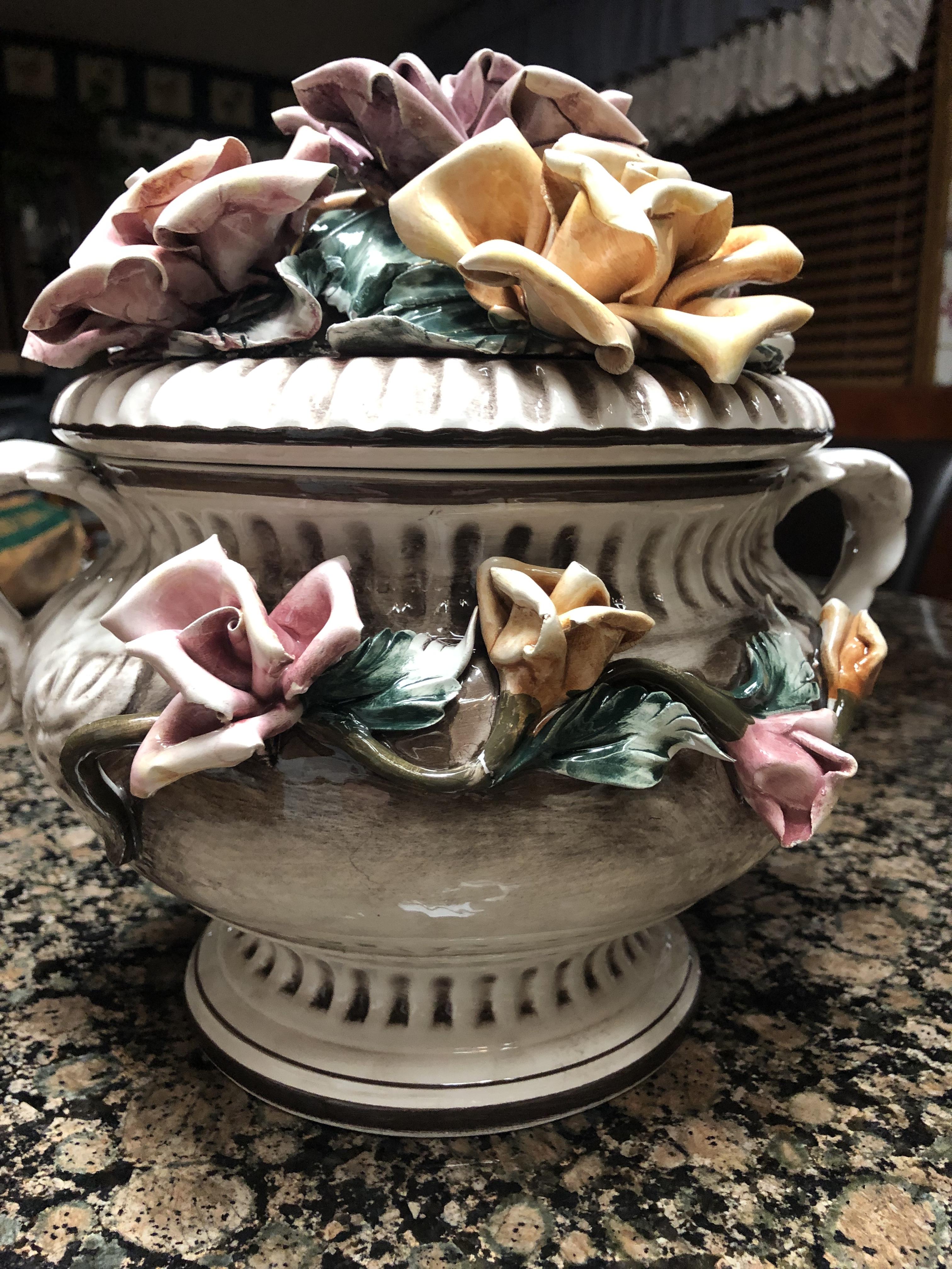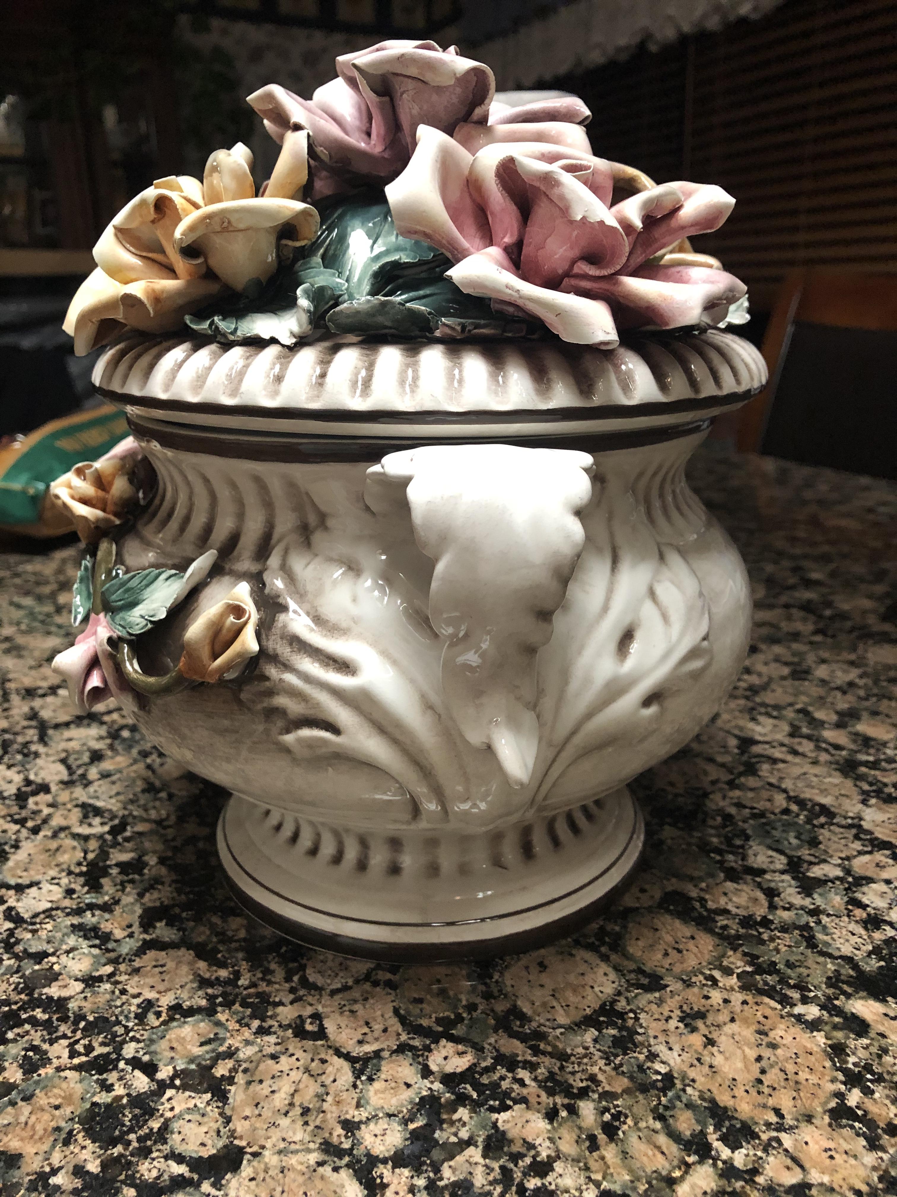 Beautiful vase/bowl with large roses on lid and smaller rose vine on the front of vase/bowl. Approximately 10.5” tall and 10” wide. In exellent shape