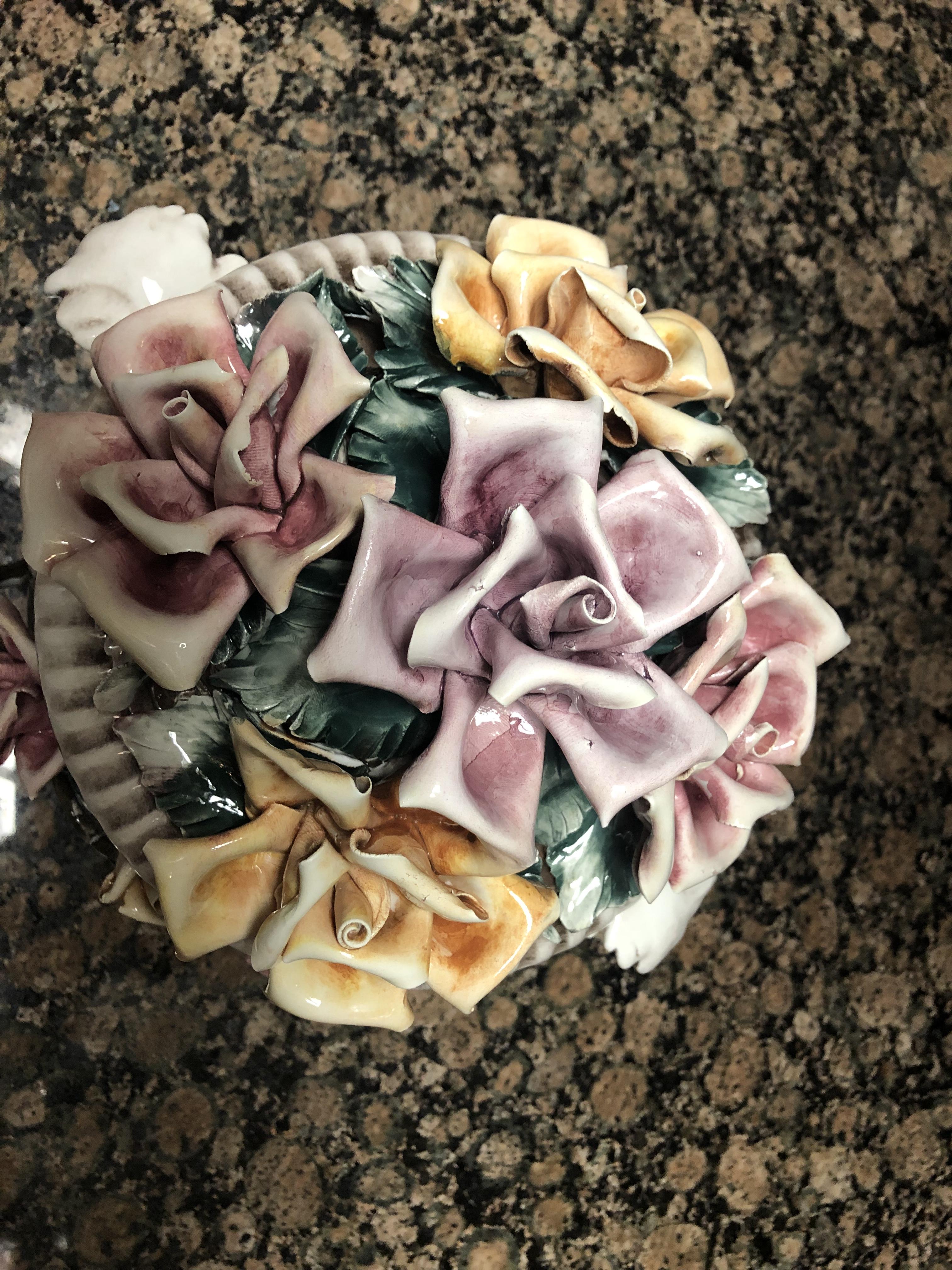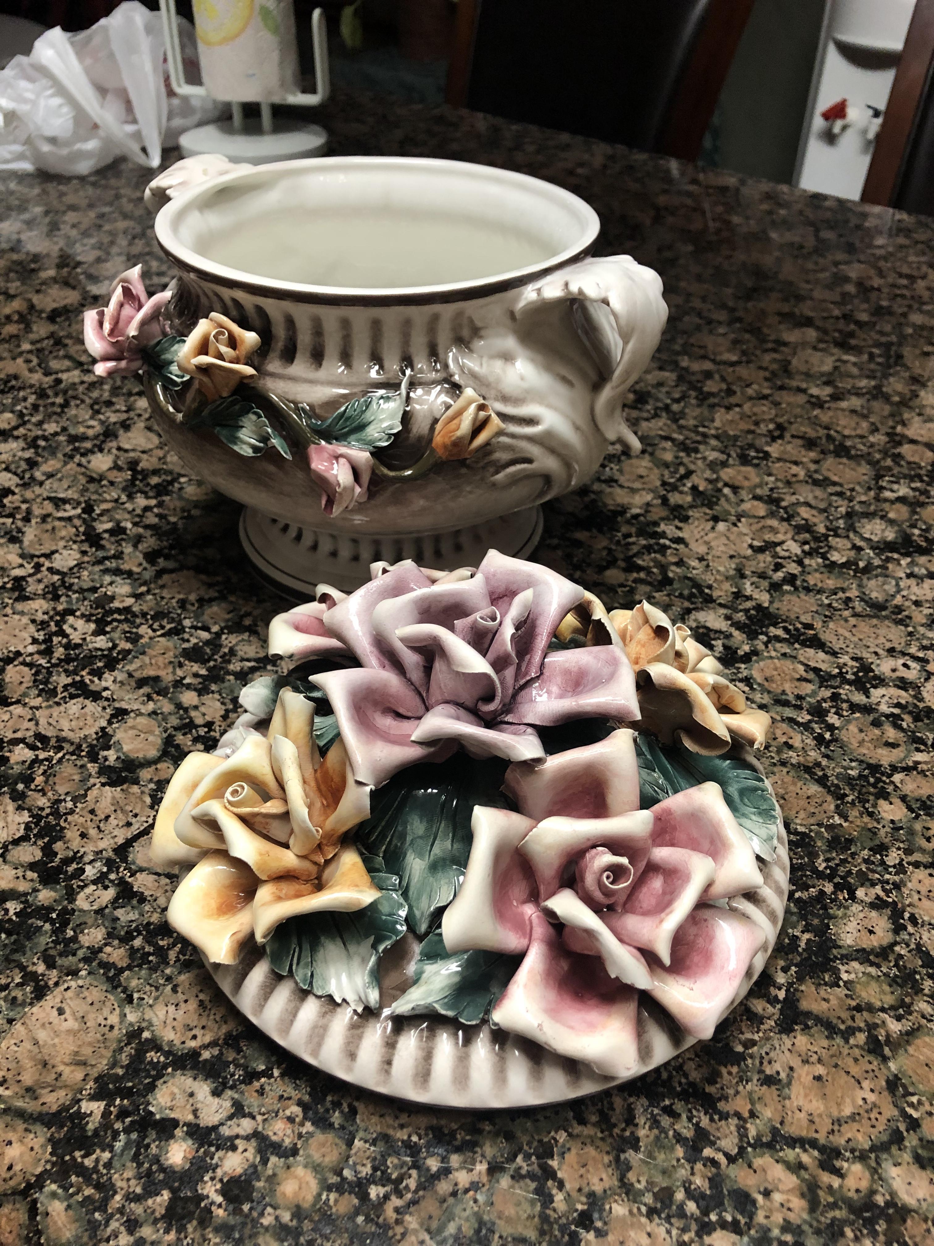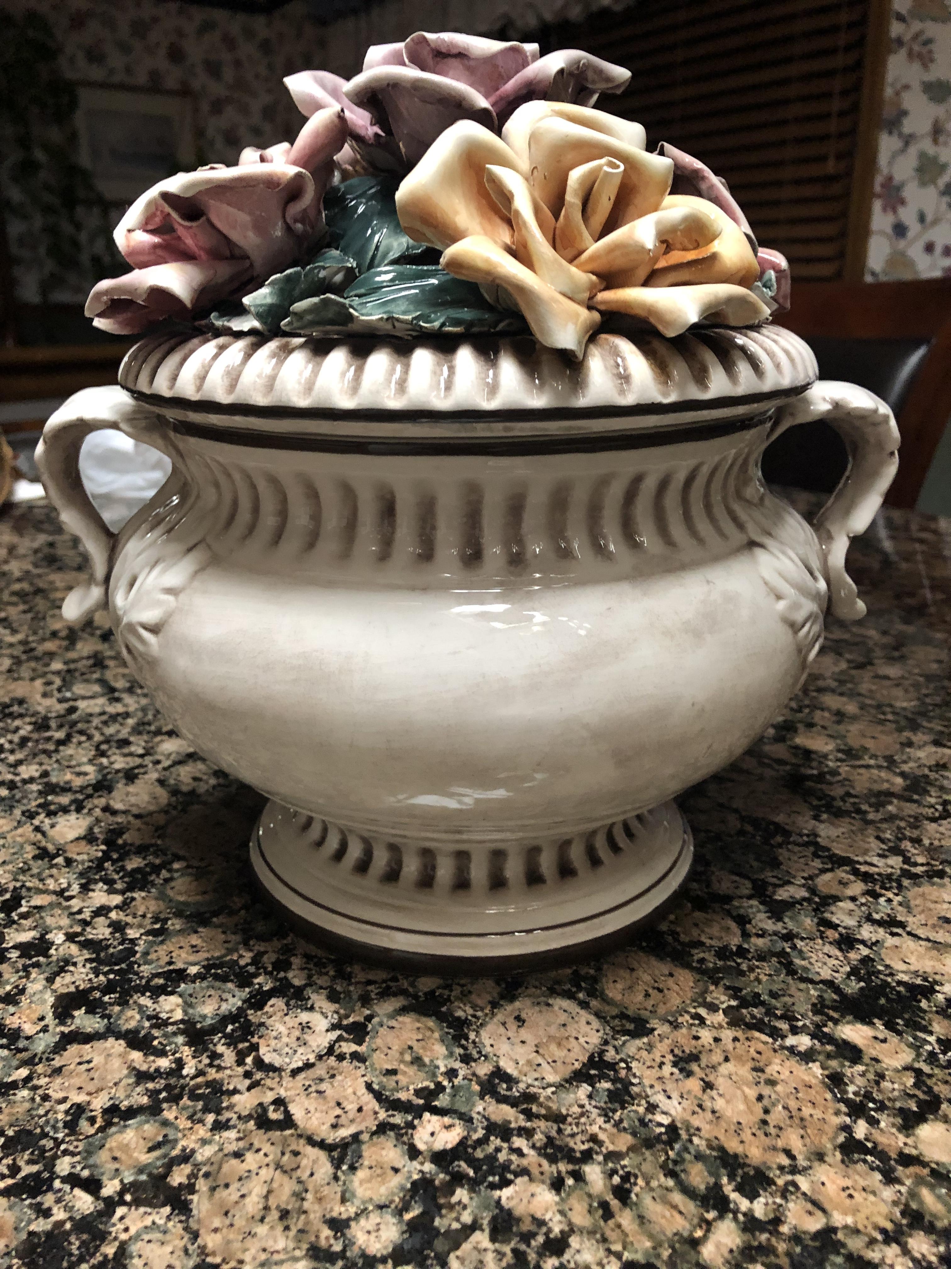 Beautiful vase/bowl with large roses on lid and smaller rose vine on the front of vase/bowl. Approximately 10.5” tall and 10” wide. In exellent shape