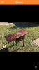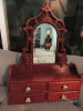 This cabinet measures 21-1/2" x 16" x 5-1/2". The finish appears to be cherry. The four drawers have original Delft pulls. The mirror is in excellent condition. There is a hole at the top with a screw included for hanging the cabinet on the wall. There are scrolls at the top of the mirror. There are match holders on both sides of the mirror