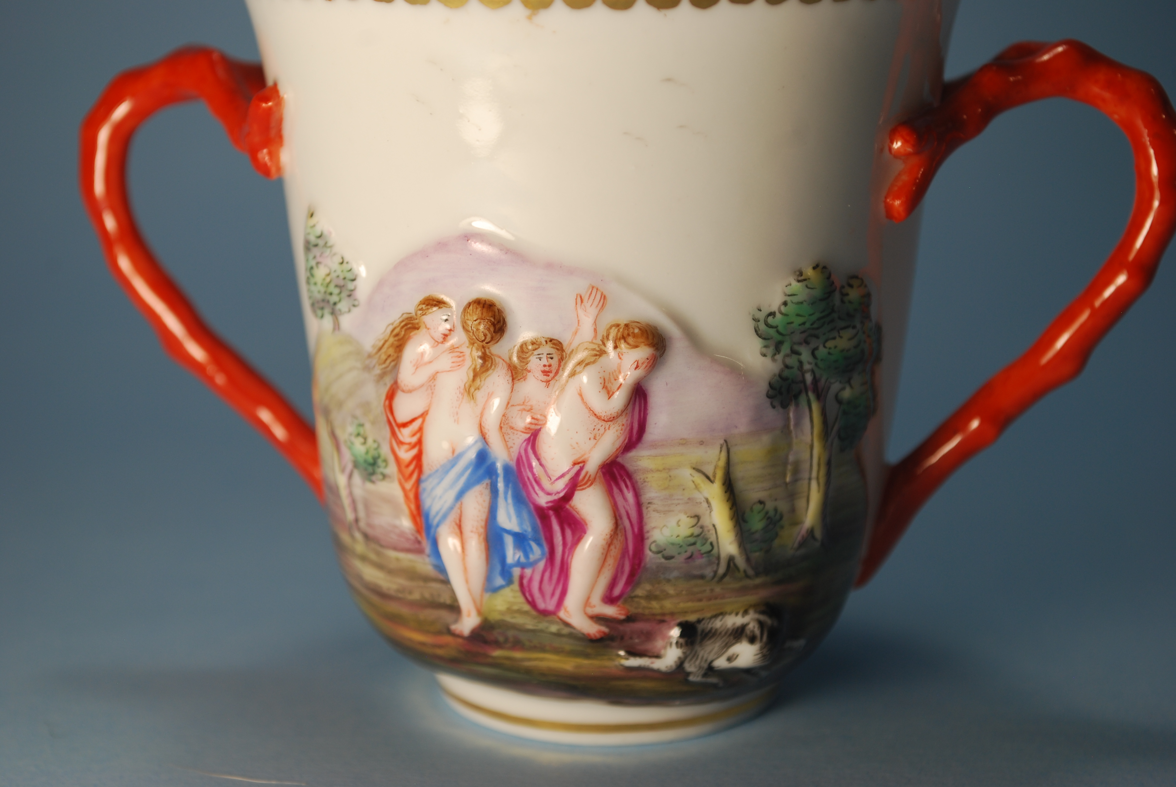 A Putto figure encircled by men and women partially nude with colorful wraps along with their dogs frolicking in the woods and by streams of water