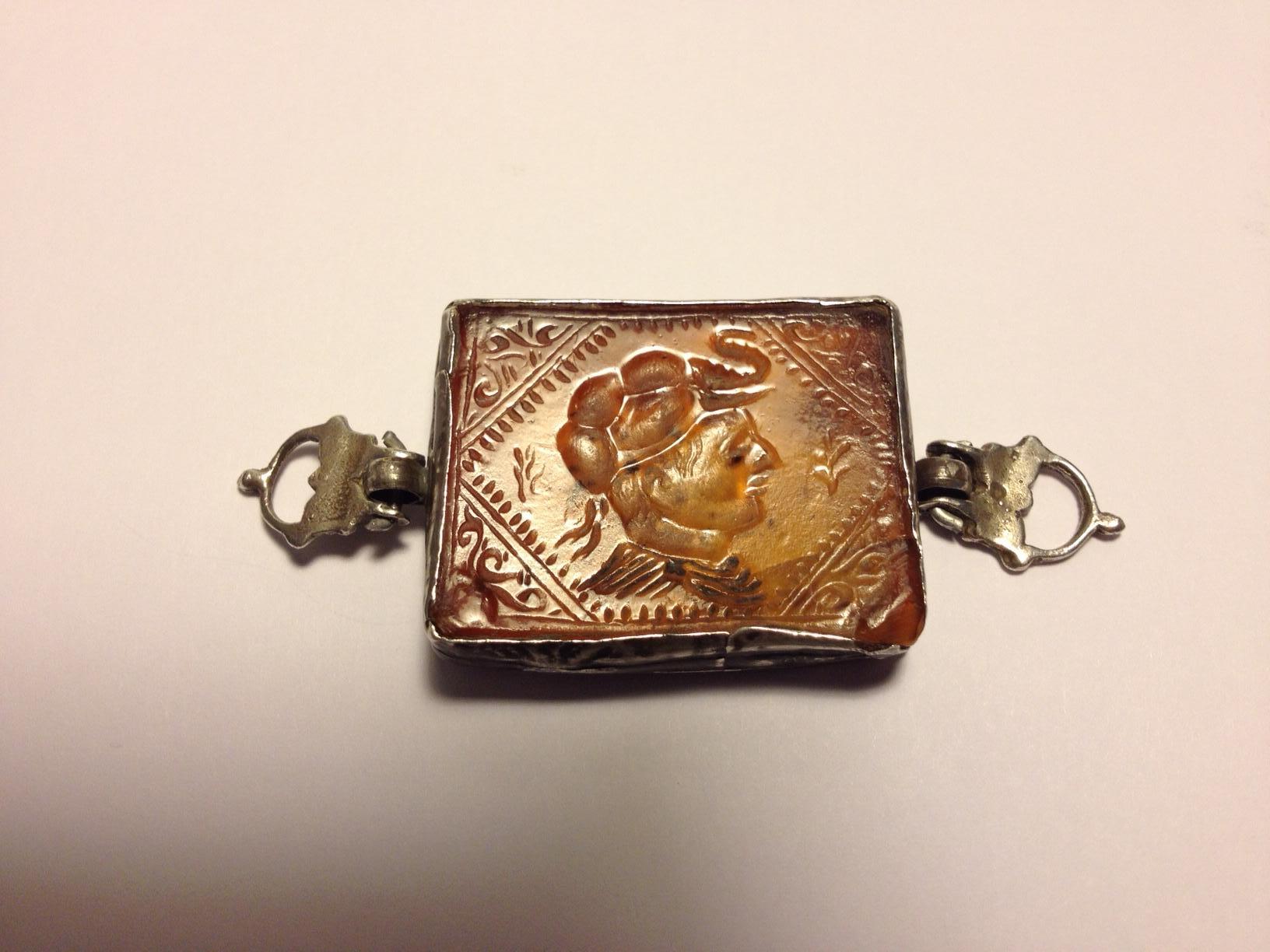 Carnelian (not amber) piece measures 1-1/2 X 1-3/4, showing a profile of the right side of a face. Figure is wearing some sort of headdress, with tassels at the back and tied at the forehead. The carnelian is translucent, with decorative markings and what could be letters in the corners.
