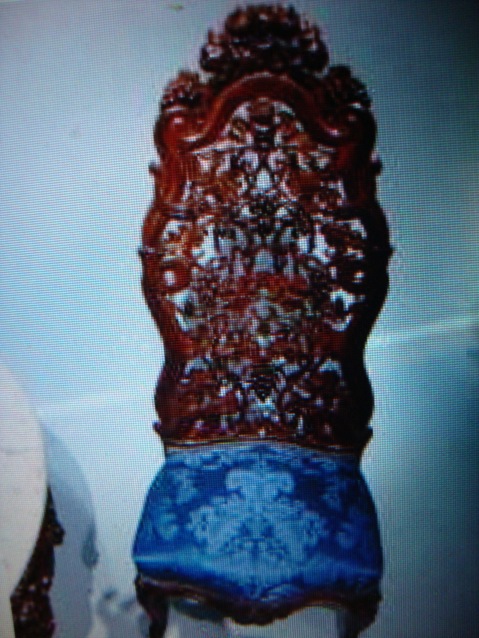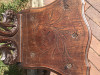 A friend picked these up at a garage sale in the Napa Valley. The chairs are quite beautiful and ornate. They have high backs and are intricately carved. They almost have a "filigree" effect to them. There is also detailed carving on the legs. The cushioned seats are upholstered in a brocade type pattern of blue silk or satin. There are no rips or tares. Both chairs are sturdy and in excellent shape.