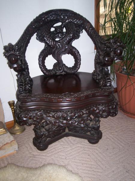 Intricately carved dragon motif. It is a swivel base chair. I have never seen one like this.