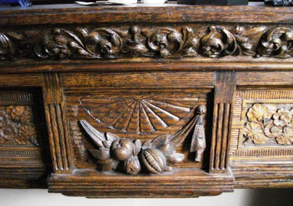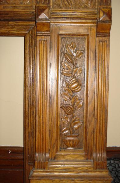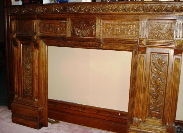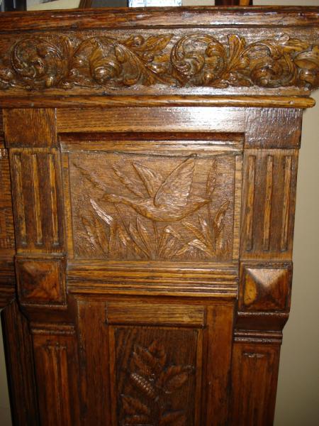 My father was given this by a neighbour aprox 30 yrs ago who had had it for a while. We live in London, in Southwestern Ontario, Canada. When he received it, it looked like a simplistic white box-like mantel, but after removing the layers of the mantel, he realized this wooden mantel was underneath. He carefully restored it (painstakingly using Q-tips over a period of six months!) until all of the carved detail was revealed. We think the wood is oak, although we're unsure. We know nothing about its origin, maker, etc and have yet to come across a similar one. The wood carvings depict ducks, fruit, corn plants and popply-like flowers. There are two holes on the top (I imagine it had a mirror at one point?). Any help on the history of this or similar pieces would be greatly appreciated! Thanks!