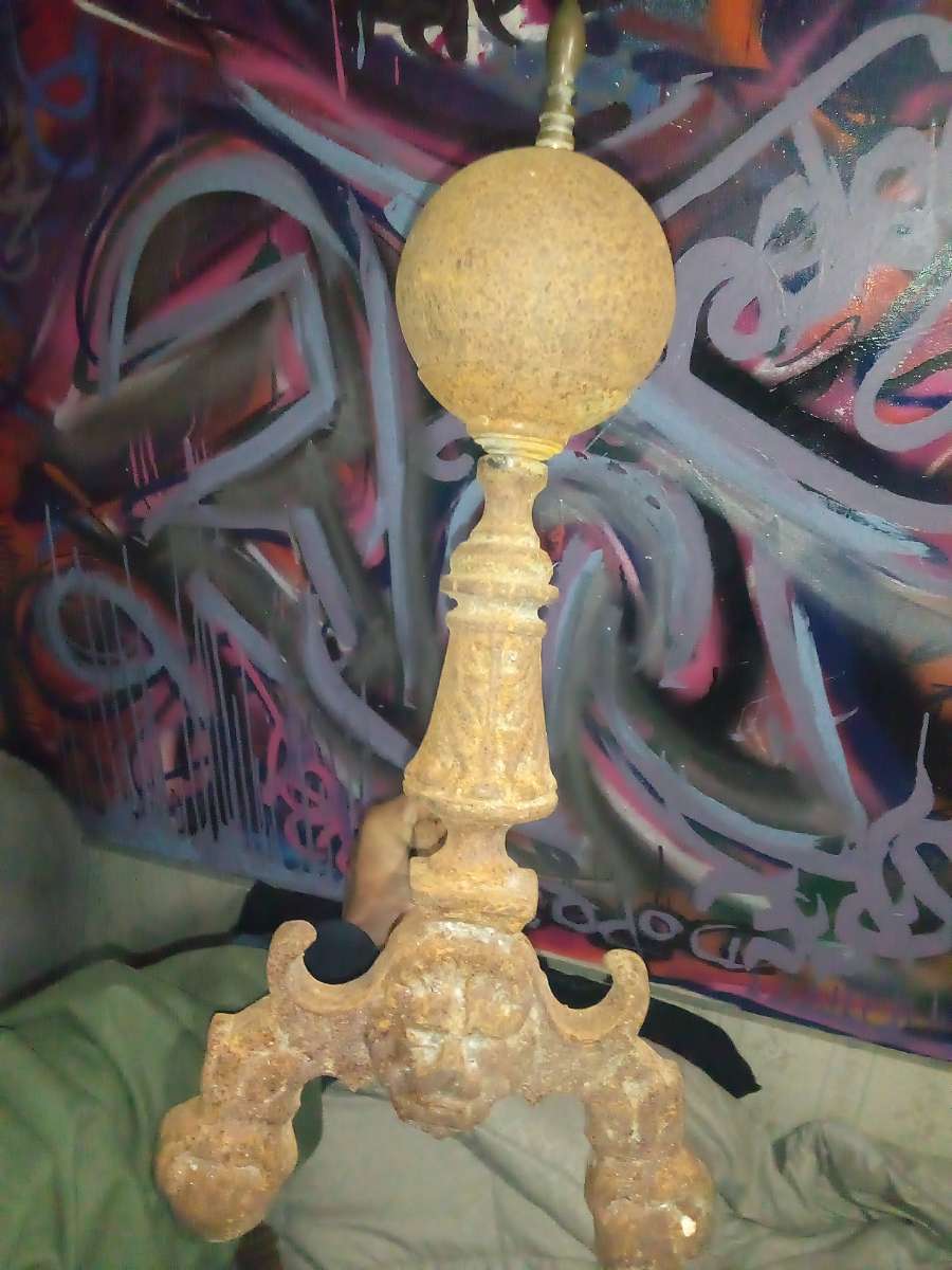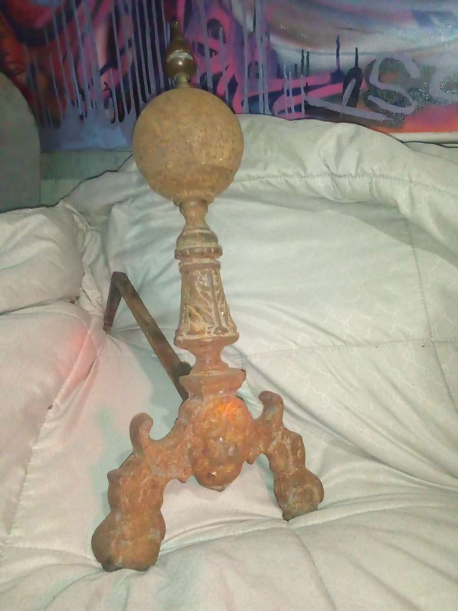The andirons exhibit significant wear, including surface rust and pitting, which is common for cast iron items of this age. The structural integrity appears intact, but the aesthetic condition may affect their appeal to collectors.