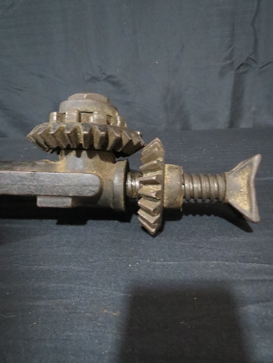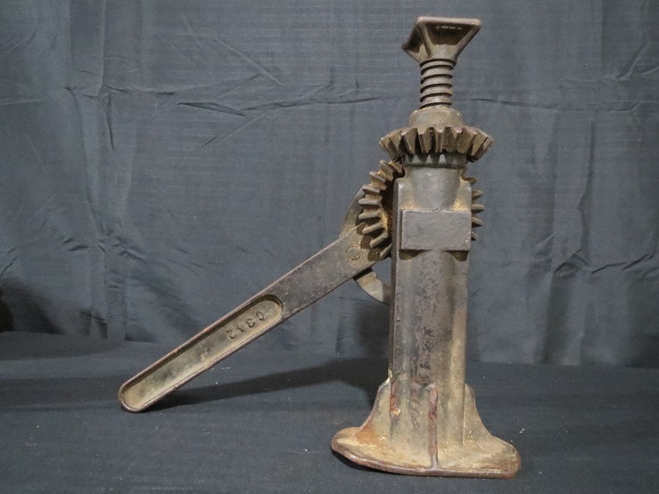 Heavy cast iron jack With a couple of markings. On the inside of the handle is marked C342,On the main shaft is marked C143. One gear turns the other to bring the jack up or down. there is also an adjustible screw at the top of the jack.