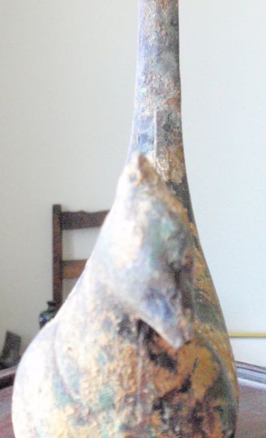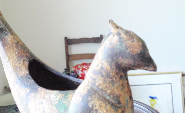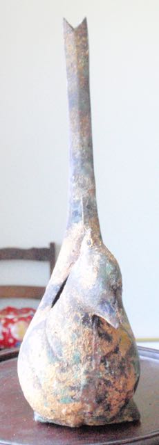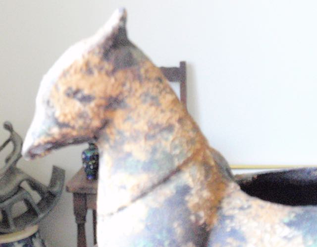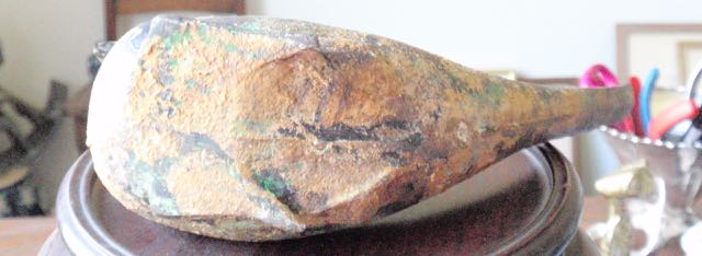 Pictured is what I think is a cast iron bird container/planter signed Japan. The piece shows oxidation and areas covered with clay??