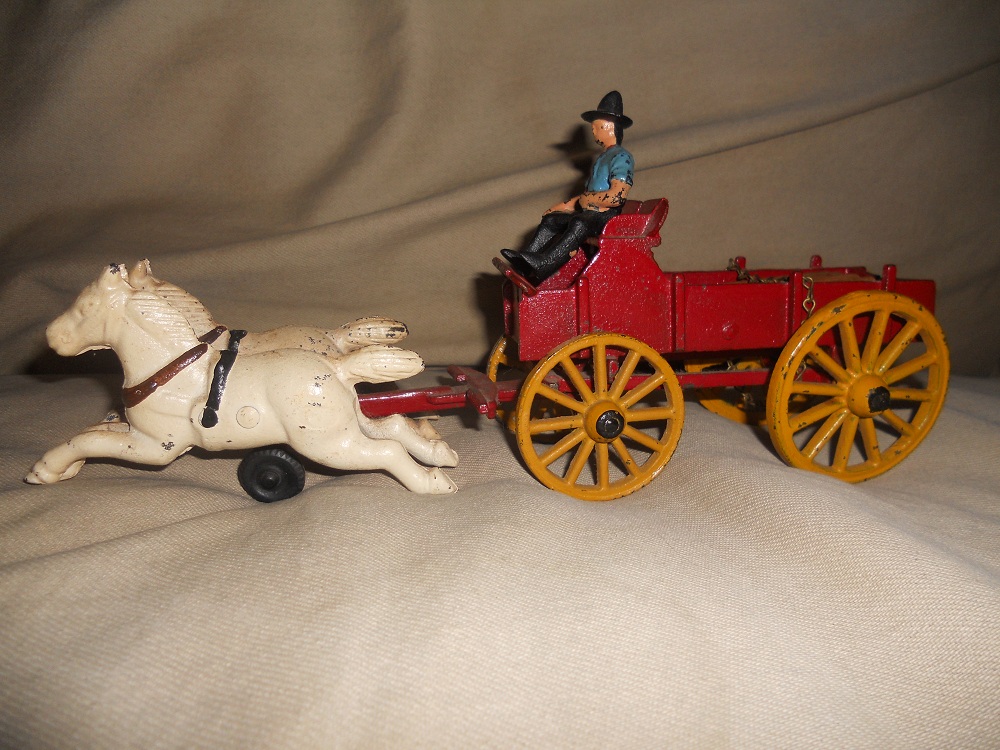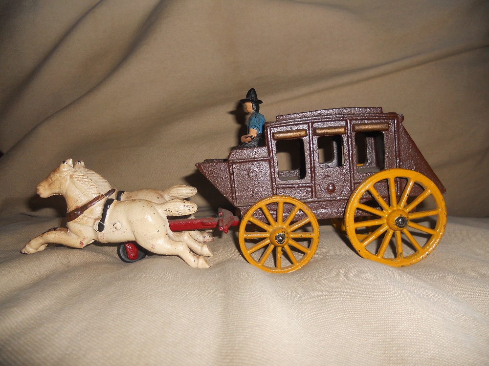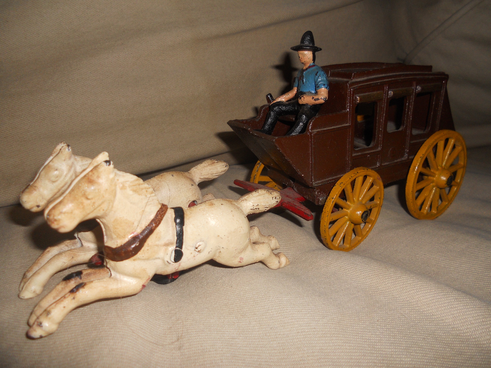 Two antique cast iron toys. Unsure of manufacturer or year. First is a horse-drawn wagon with a driver & 4 logs in back. The second is a stage coach with driver.