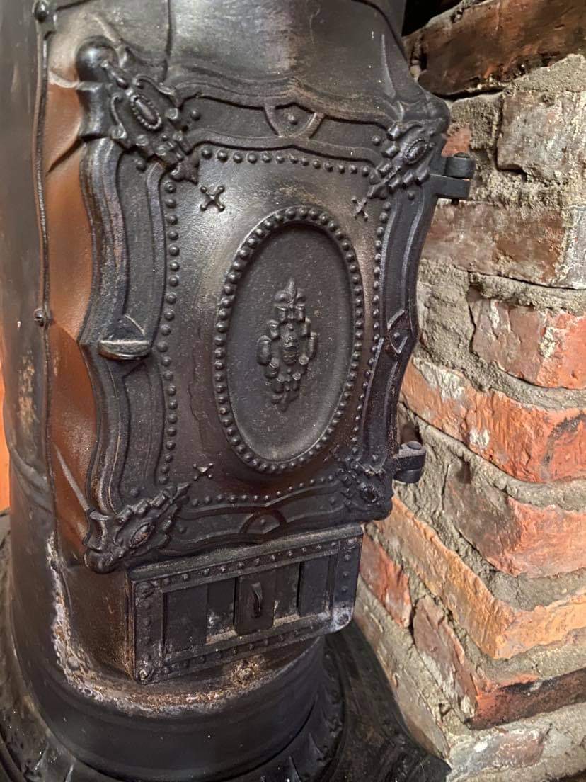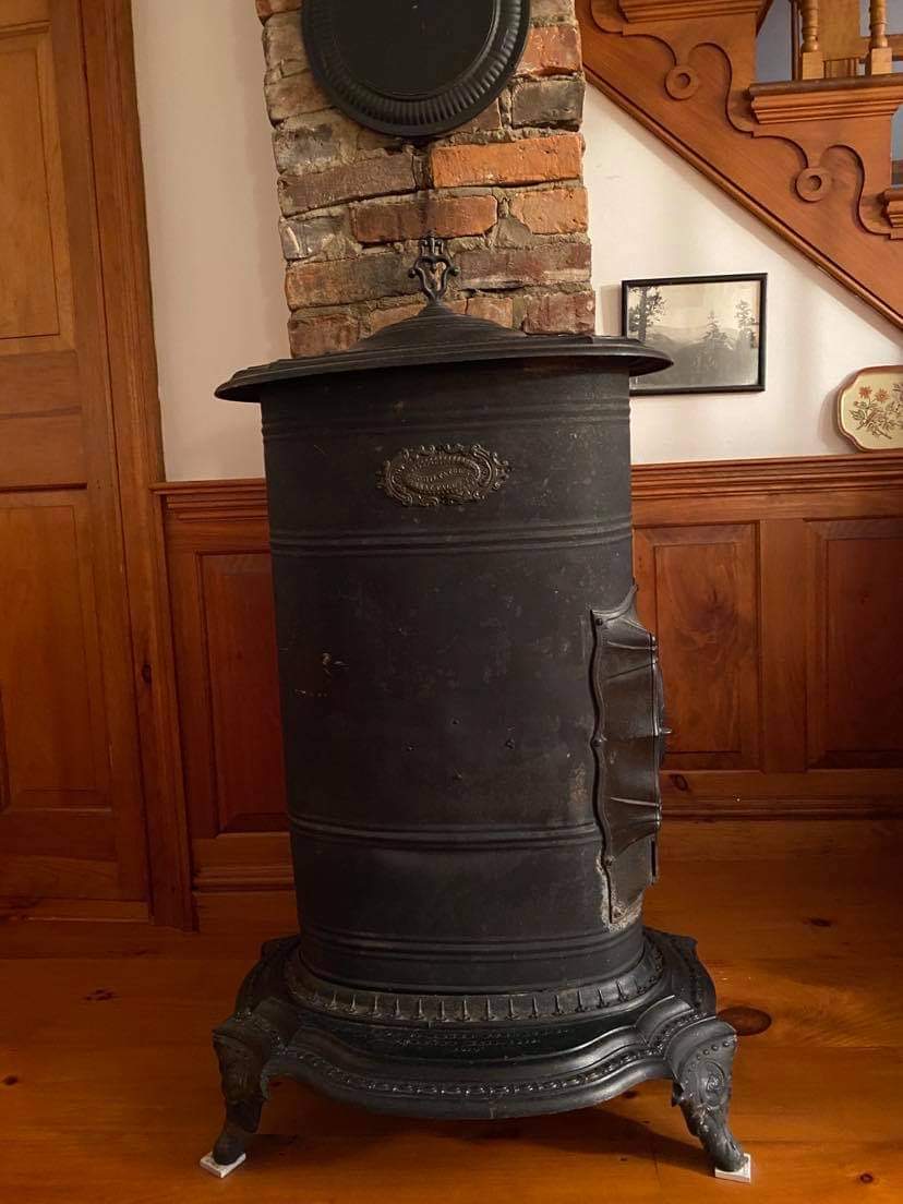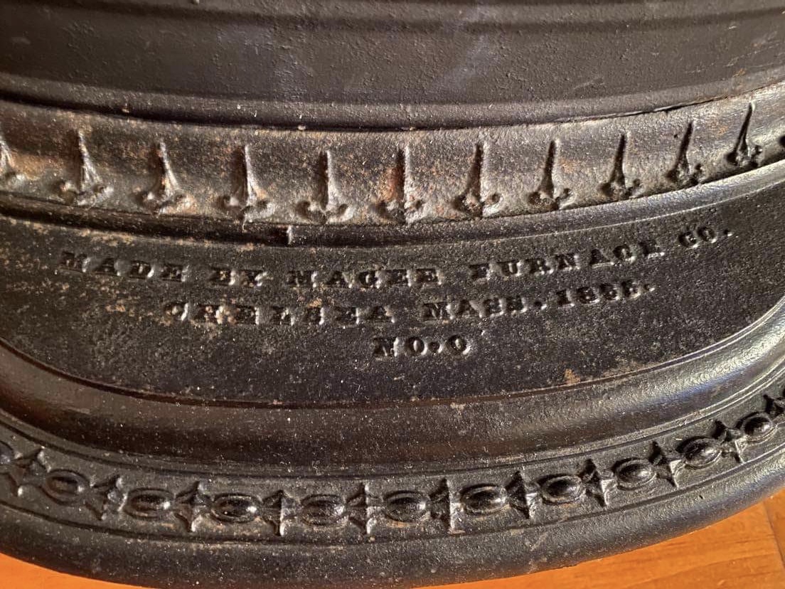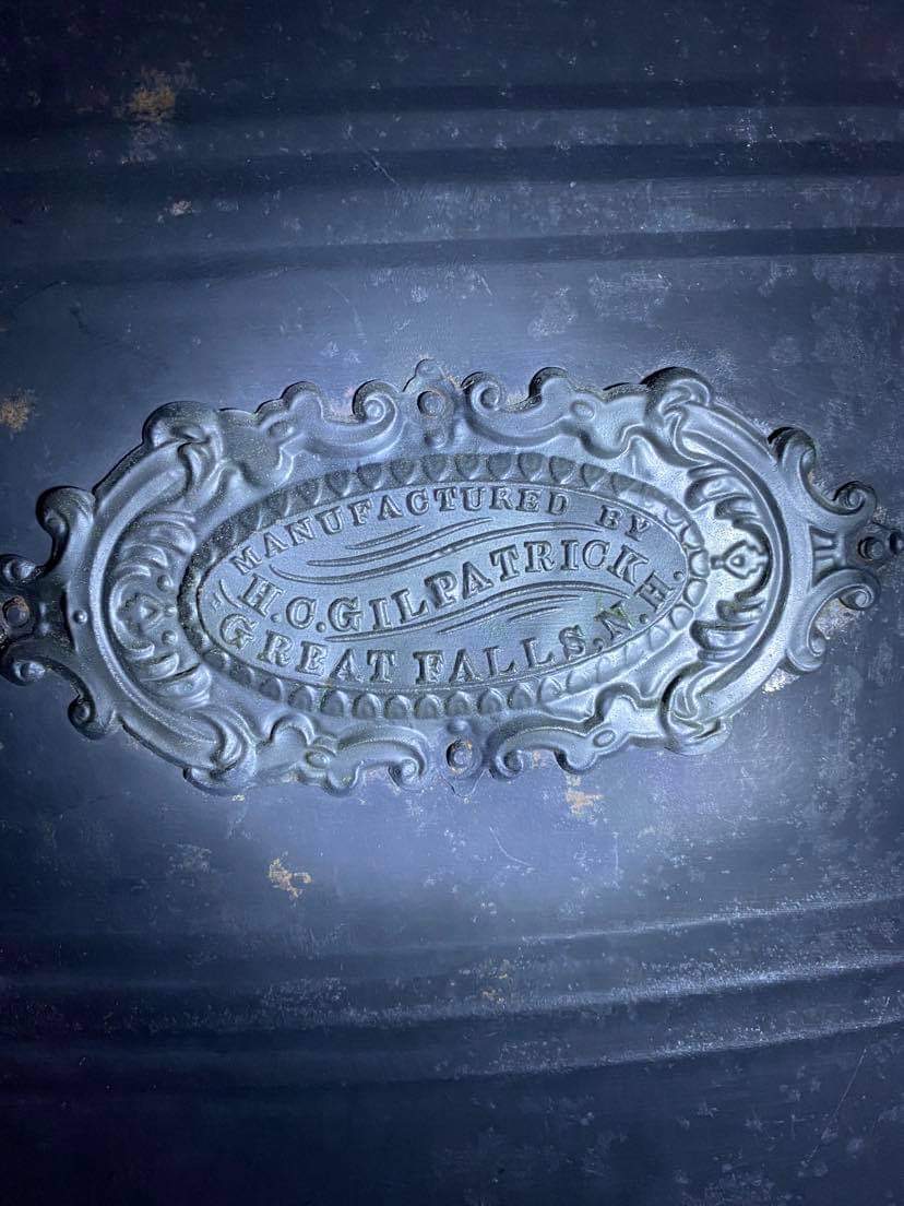 The casting is marked “Magee Furnace Co Chelsea Mass 1865 No.0”. A tag attached to the front reads “Manufactured by H.C.Gilpatrick Great Falls, N.H.” (Somersworth NH was called Great Falls during Civil War). NEVER BEEN USED. ——Made during Civil War.—— Material: Cast iron and sheet tin. Size: ~ 40”x21”x18”.