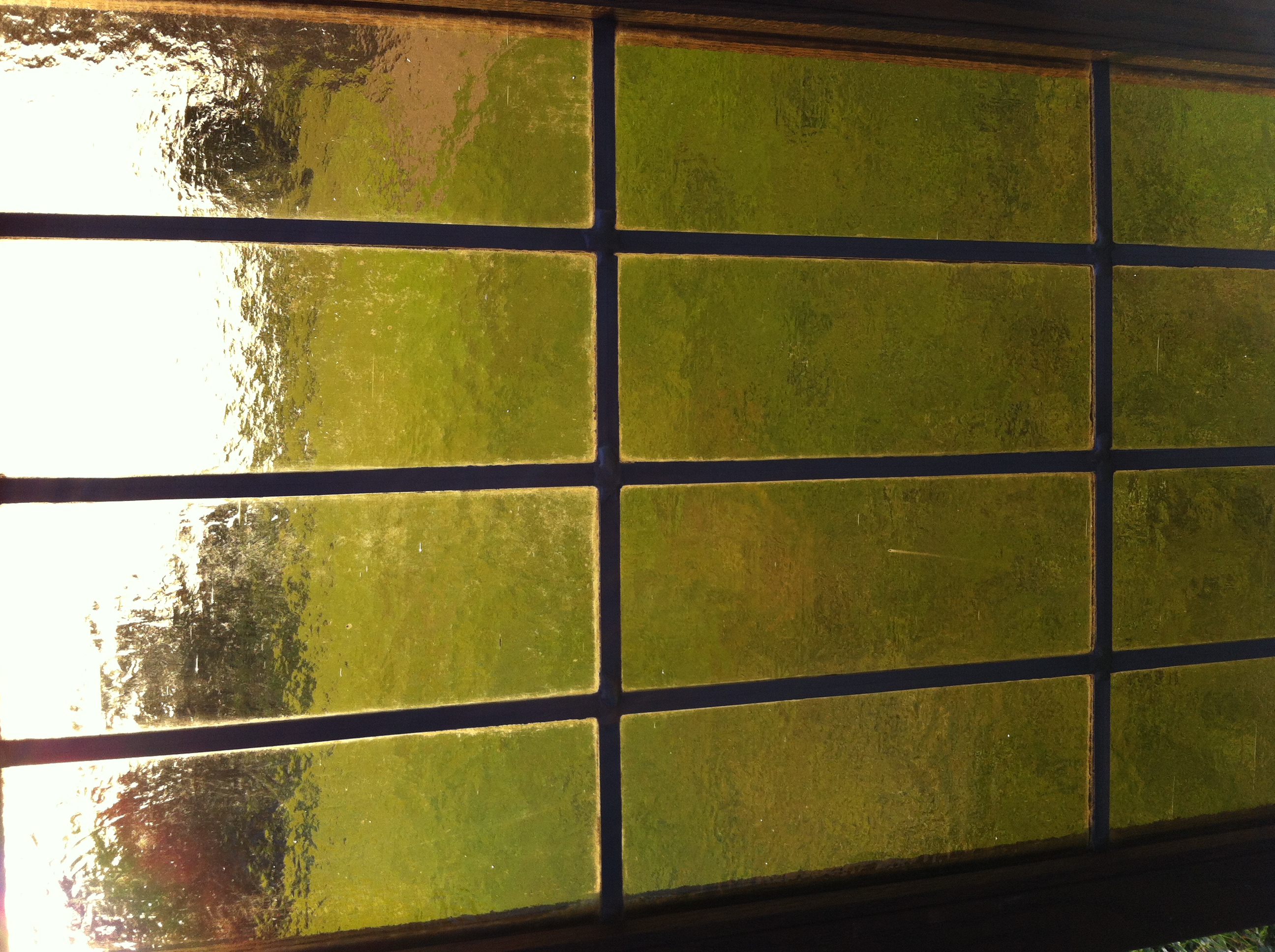 I have read many articles on "antique" glass and all I have found say that one side is smooth, not the case here. All the panes are held together with an almost flawless lead came frame and dividers.