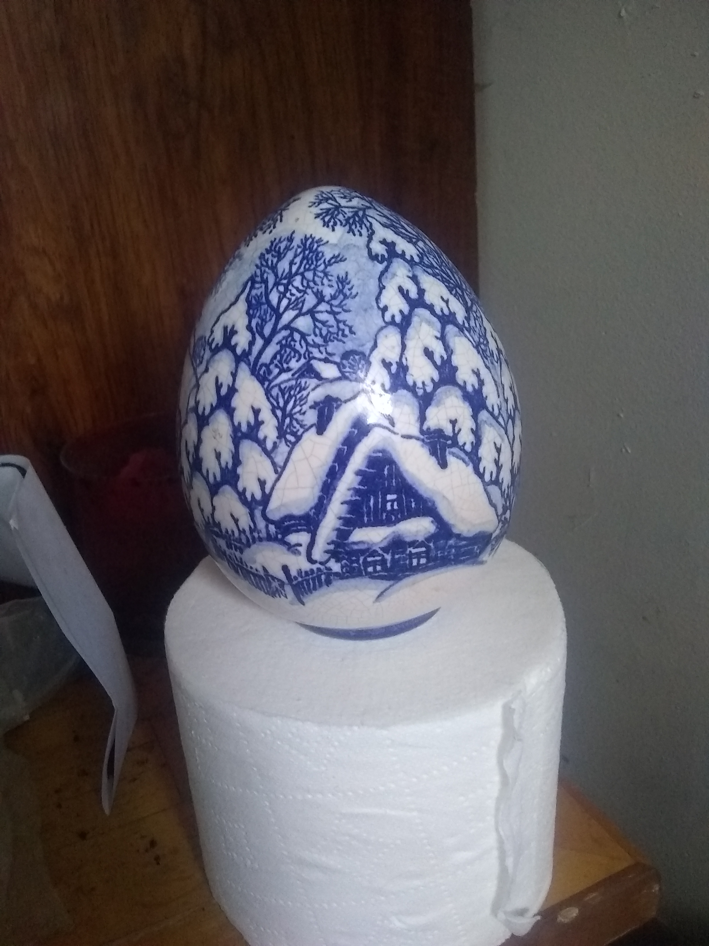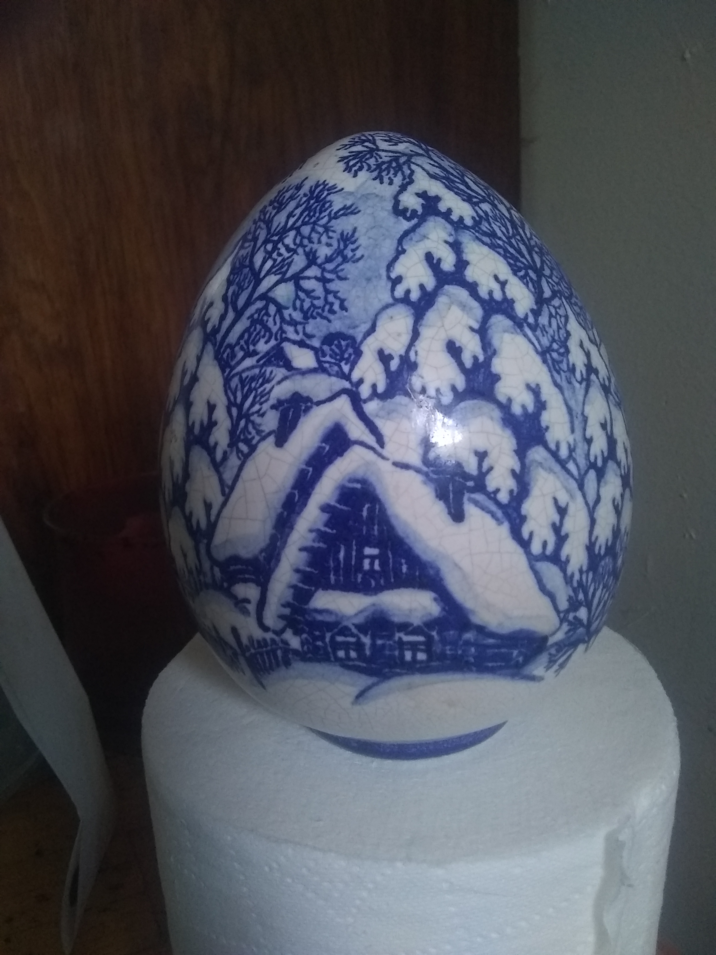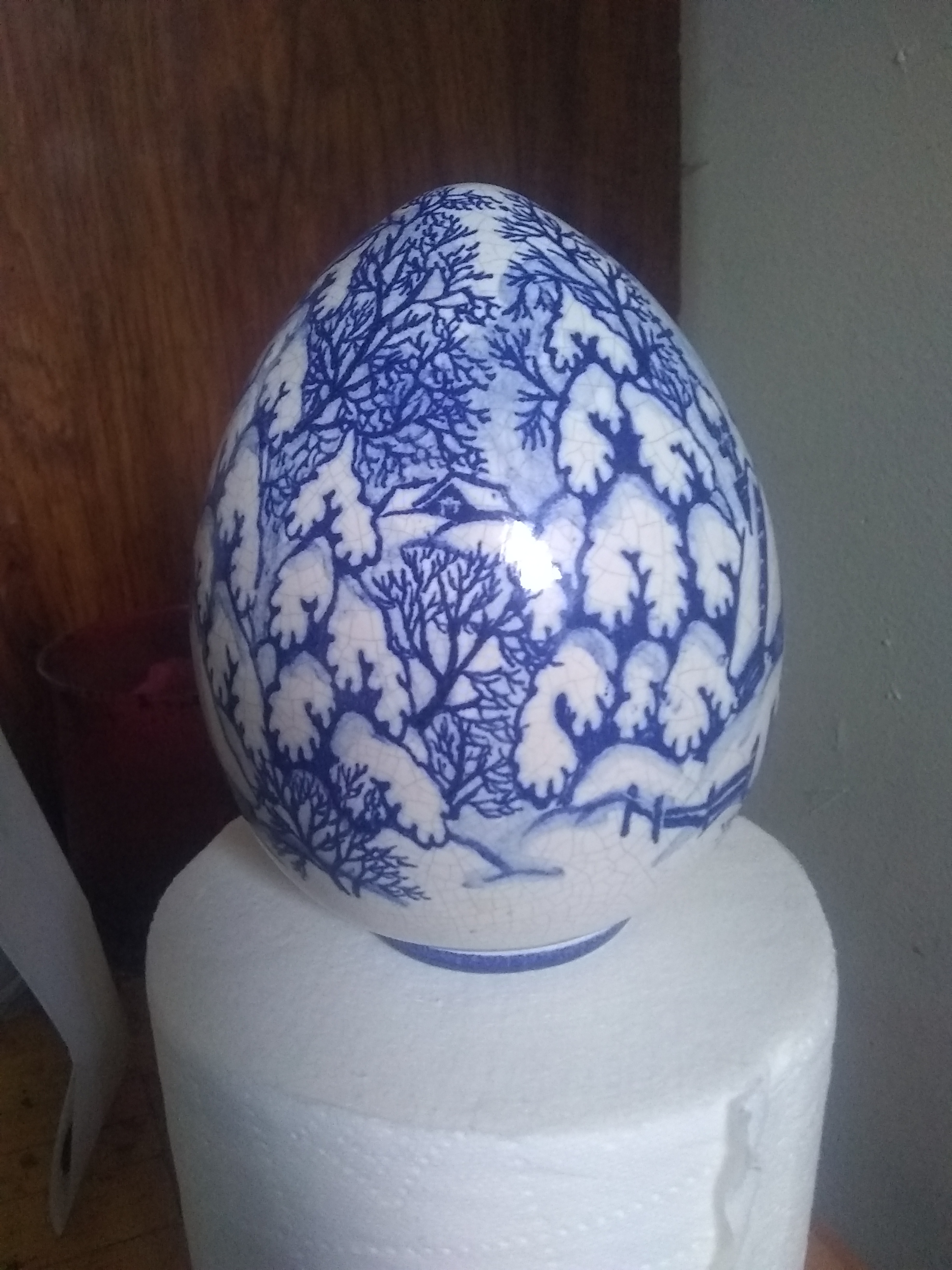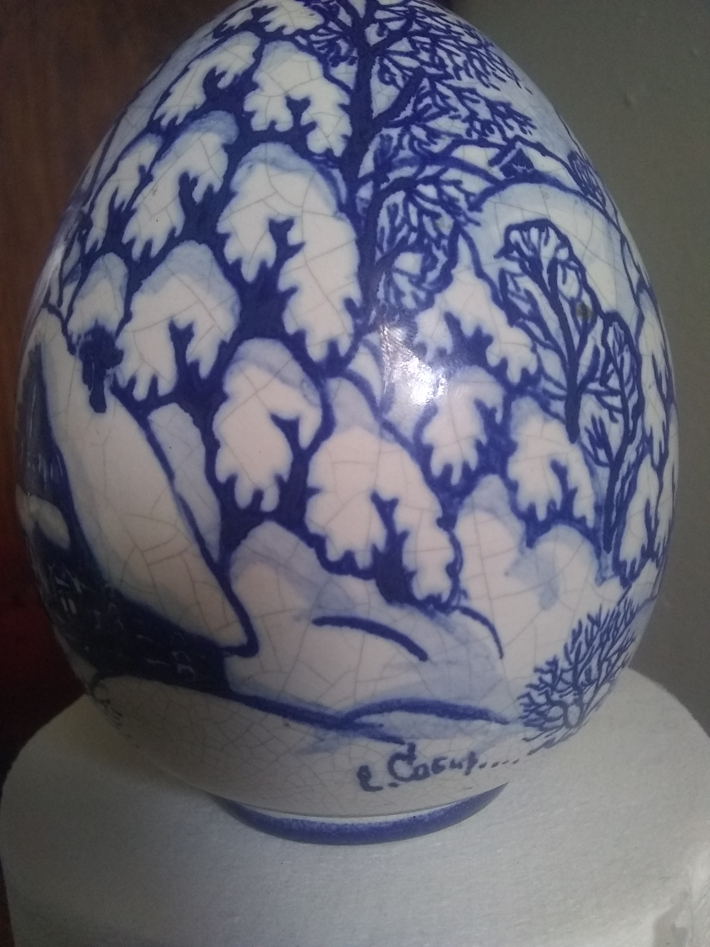 Ceramic egg with a Winter Cottage scene painted on it. There is a signature on it that I can quite make out. It has a small hole on the bottom with two lines etched into the ceramic. There are small spider web cracks