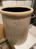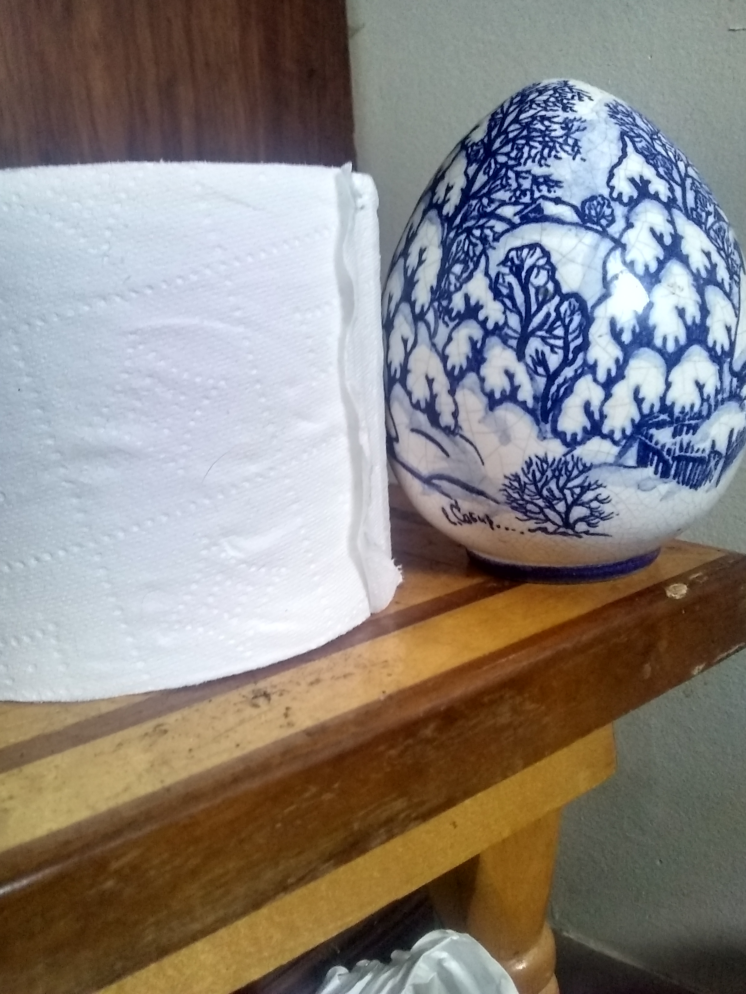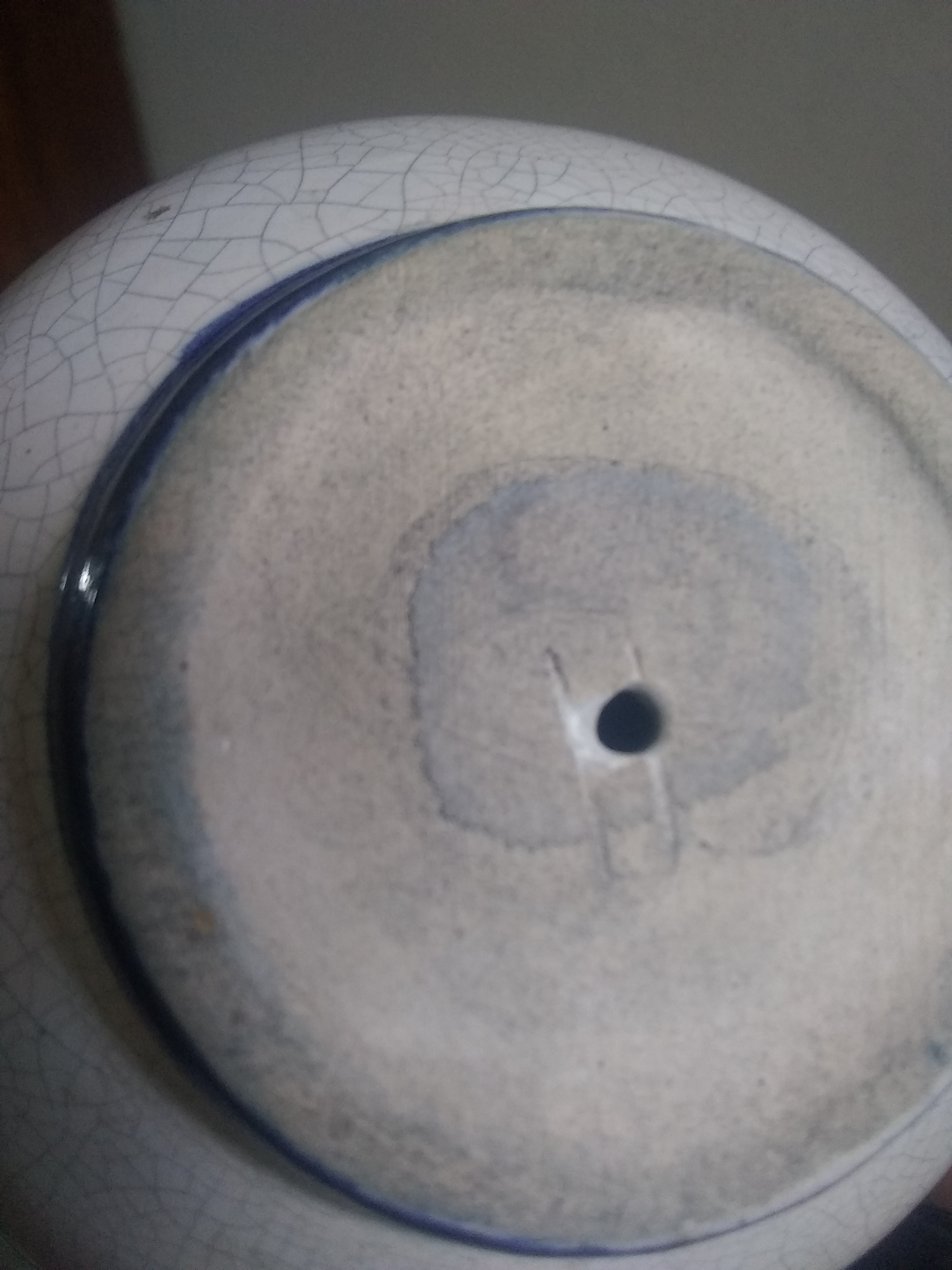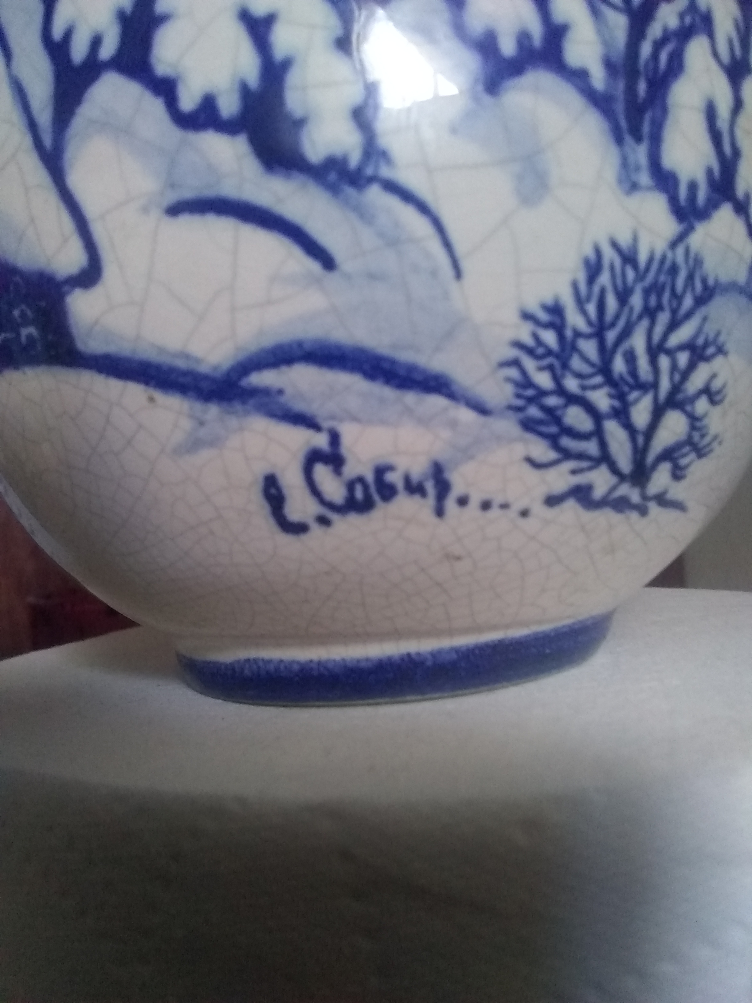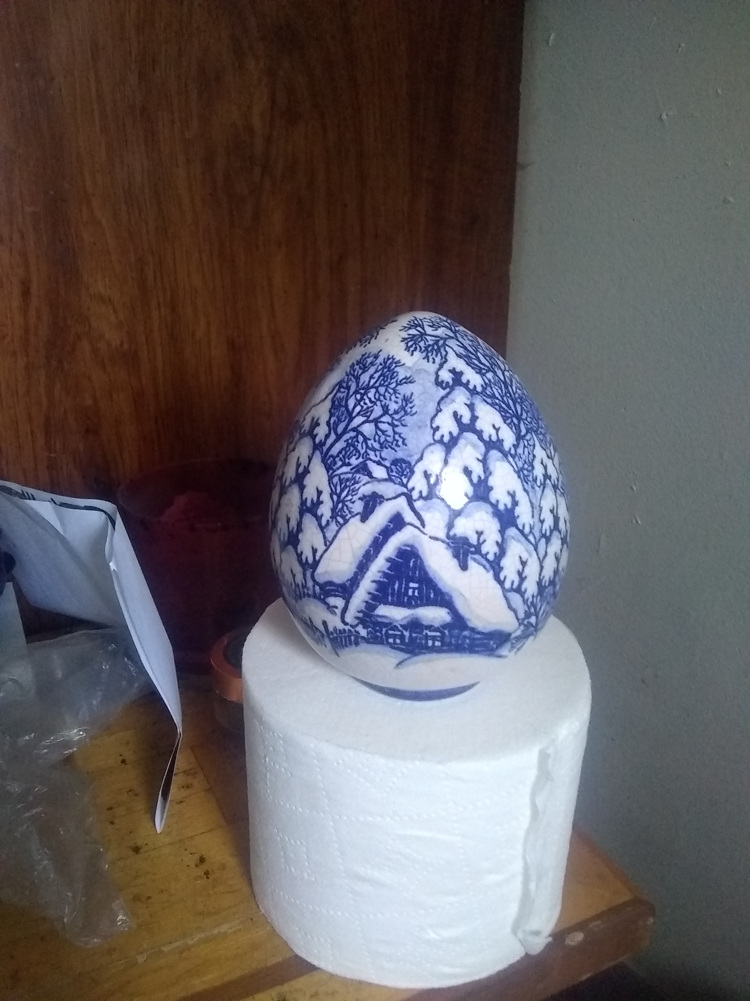 Ceramic egg with a Winter Cottage scene painted on it. There is a signature on it that I can quite make out. It has a small hole on the bottom with two lines etched into the ceramic. There are small spider web cracks